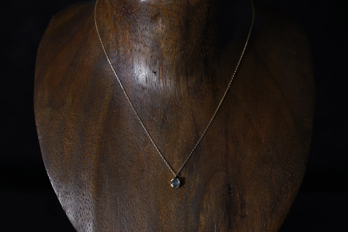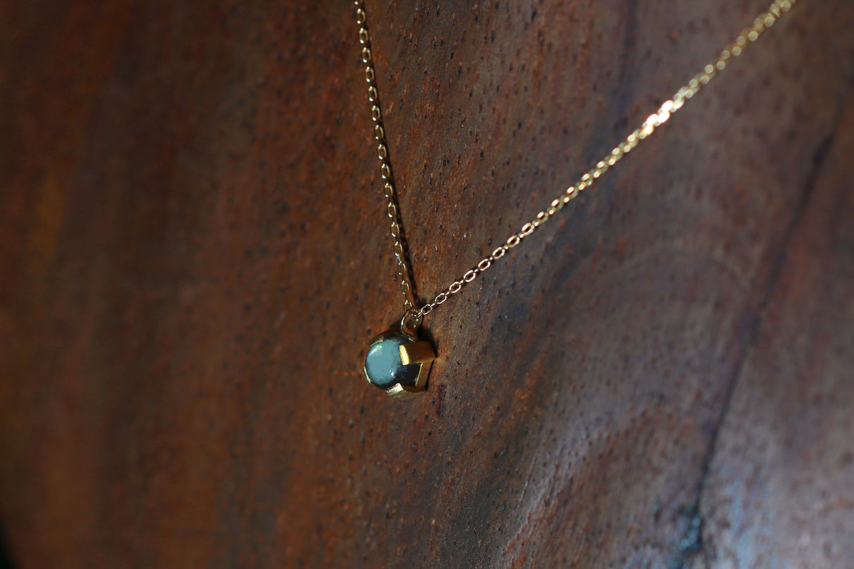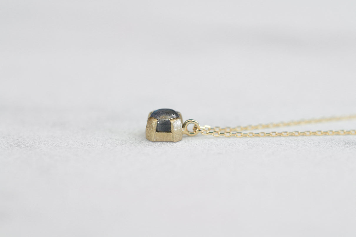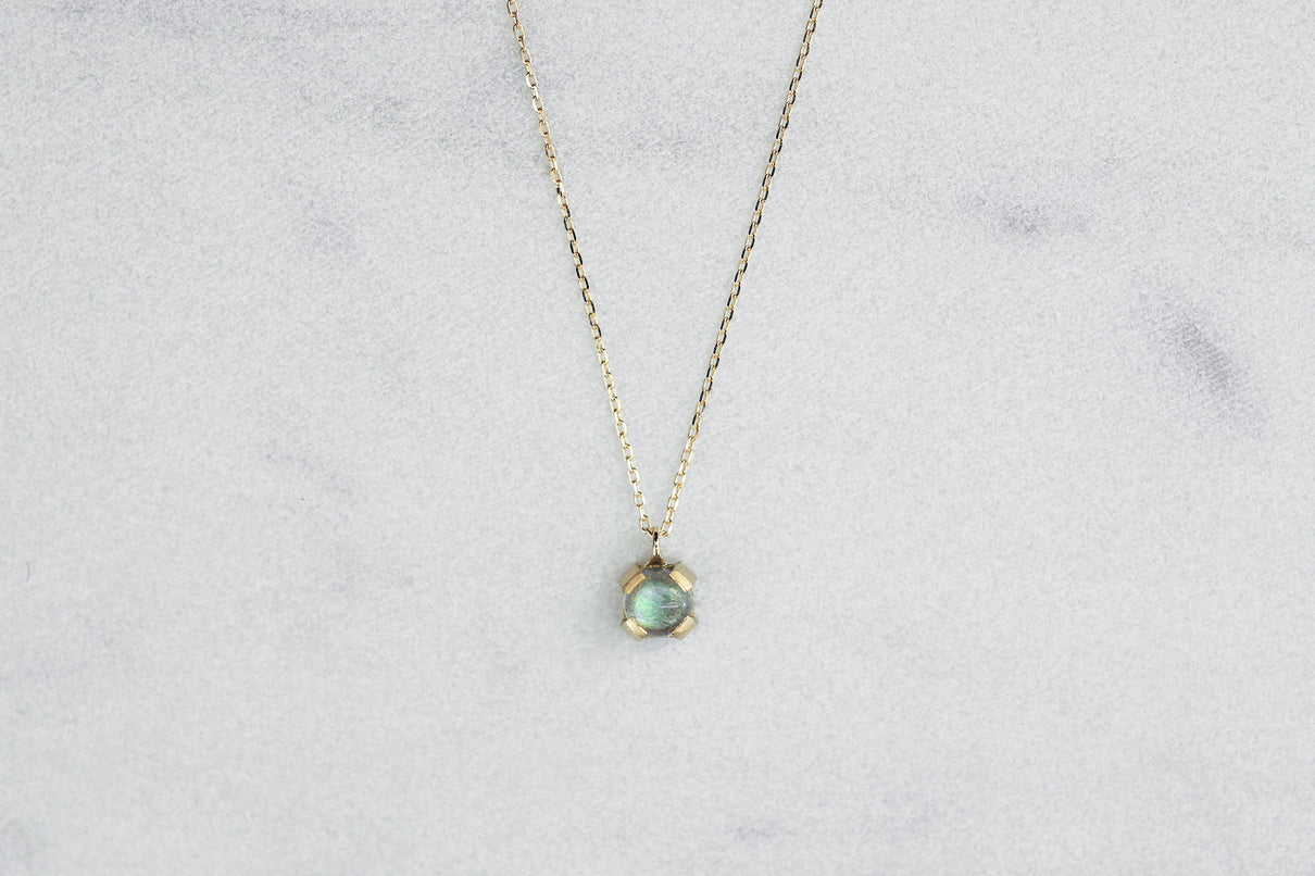 ブルーラブラドライトを用いた1点もののネックレス。角度を変えるたび、ブルーを基調としたオーロラのような複雑な色を放ちつつ、幻想的に彩りながら輝く様は、ずっと眺めていたくなるような美しさです。この特徴的な虹色は、「ラブラドレッセンス」と呼ばれる、ラブラドライト特有の光の干渉によるものです。石を受け止める、プレーンなマットテクスチャーを施した平らなK18ゴールドの爪部分は、小ぶりなカボションカットをシンプルかつ個性が引き立つようなフォルムで仕上げることで、スタイリッシュでシックな印象に。日常的に身に着けやすいサイズ感で、さりげない華やぎを添えるアイテムです。