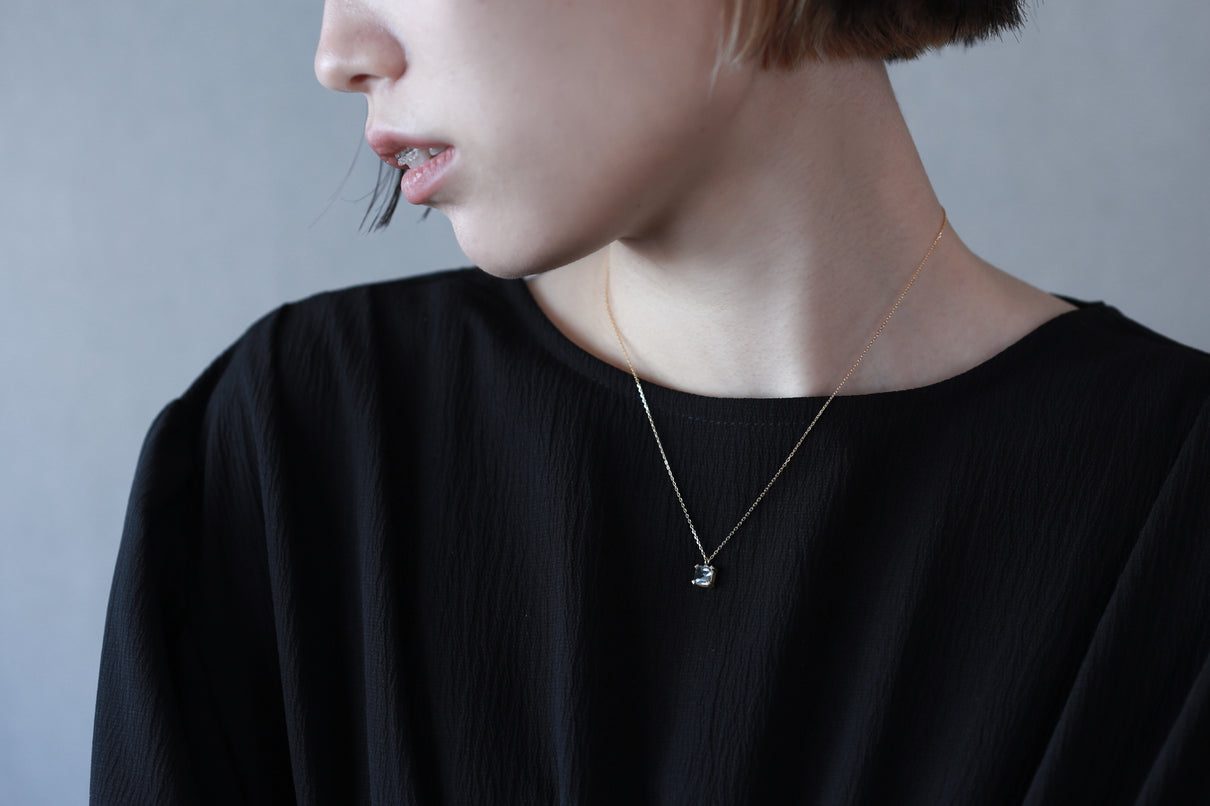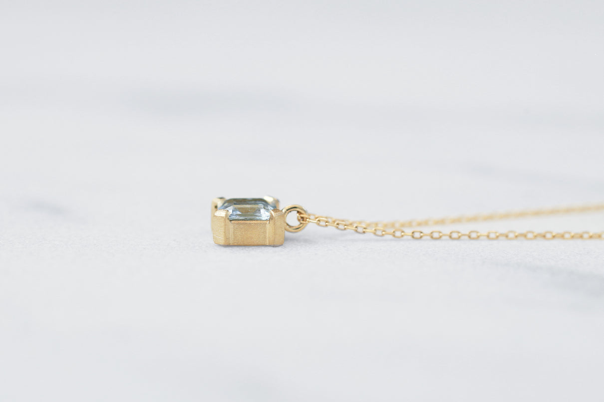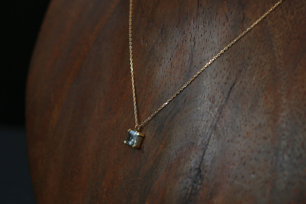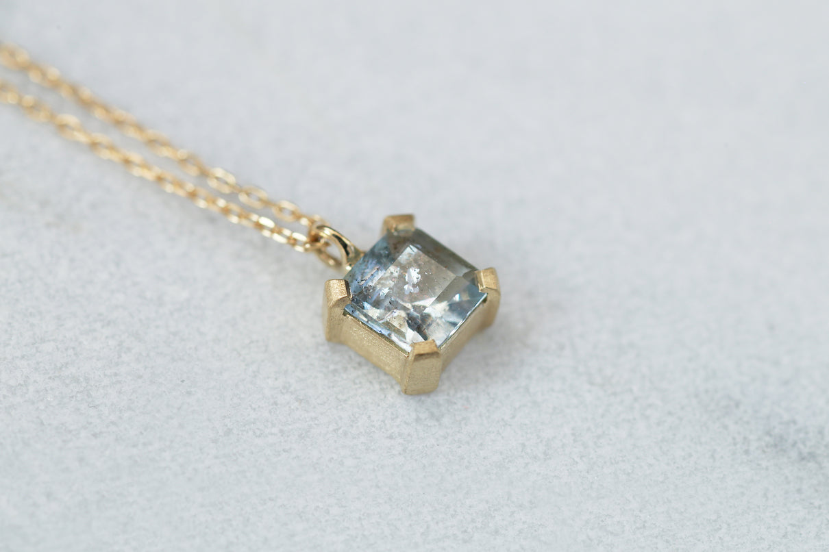 淡い水色が印象的なモスアクアマリンで仕立てた1点もののネックレス。アクアマリンにチタン鉄鉱と呼ばれる液膜状のインクルージョンが閉じ込められた、流通量も少ない希少な天然石です。すっきりとしたスクエアのフォルムにさりげなく浮かぶ苔のようなインクルージョンと、金属の薄片のような煌めきが閉じ込められた、美しい表情を見せる1ピース。プレーンなマットテクスチャーを施した石座と爪部分は、シンプルながらも石のフォルムとリンクするようなさりげない個性を込めることで、石の魅力を引き立たせるデザインに仕立てました。日々の装いに取り入れやすいサイズ感ながらも力強く煌めき、シックな雰囲気を添えてくれるアイテム3月の誕生石としても親しまれているアクアマリンは、3月生まれの方の特別なお守りとしてもお勧めです。