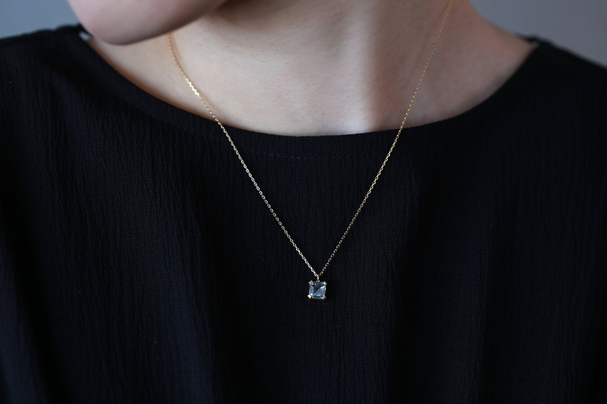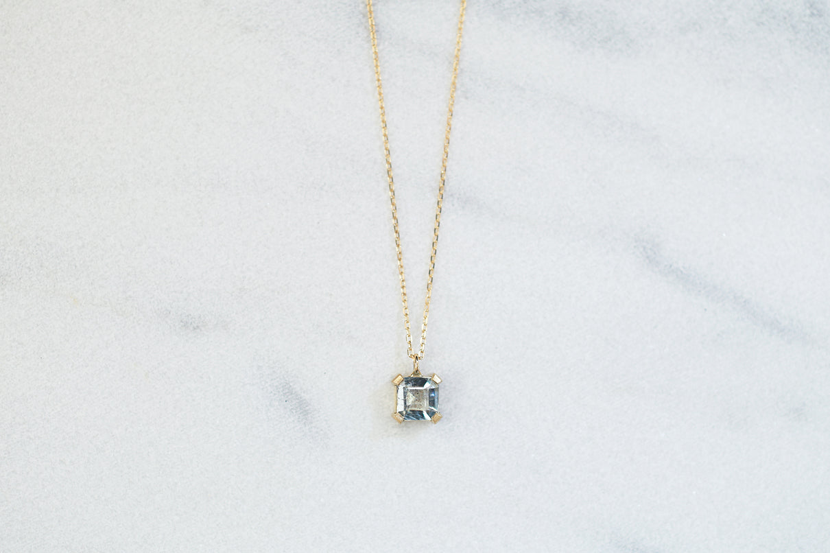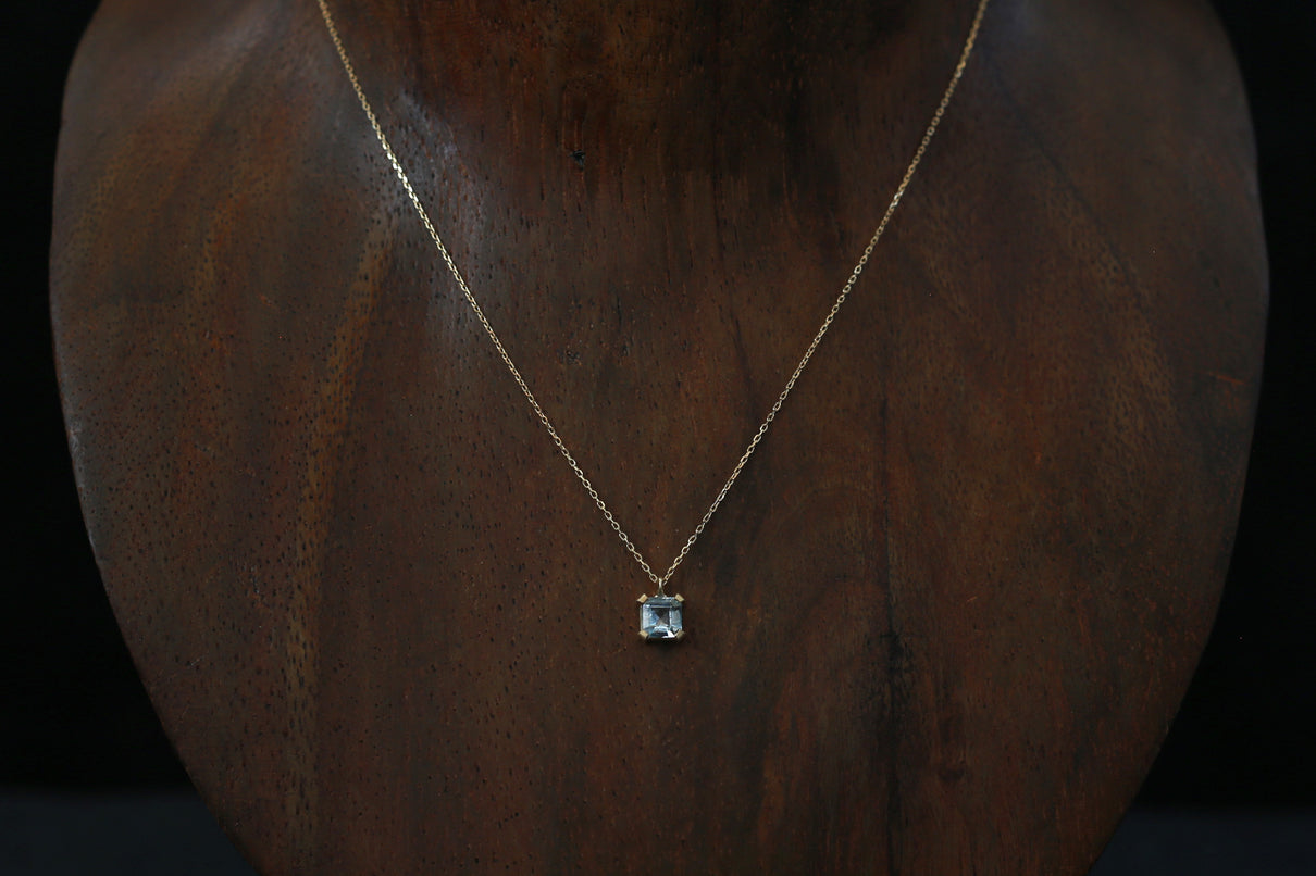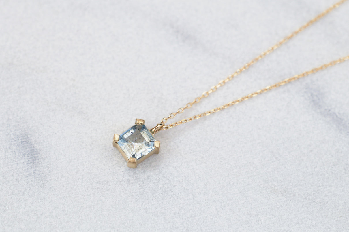 淡い水色が印象的なモスアクアマリンで仕立てた1点もののネックレス。アクアマリンにチタン鉄鉱と呼ばれる液膜状のインクルージョンが閉じ込められた、流通量も少ない希少な天然石です。すっきりとしたスクエアのフォルムにさりげなく浮かぶ苔のようなインクルージョンと、金属の薄片のような煌めきが閉じ込められた、美しい表情を見せる1ピース。プレーンなマットテクスチャーを施した石座と爪部分は、シンプルながらも石のフォルムとリンクするようなさりげない個性を込めることで、石の魅力を引き立たせるデザインに仕立てました。日々の装いに取り入れやすいサイズ感ながらも力強く煌めき、シックな雰囲気を添えてくれるアイテム3月の誕生石としても親しまれているアクアマリンは、3月生まれの方の特別なお守りとしてもお勧めです。