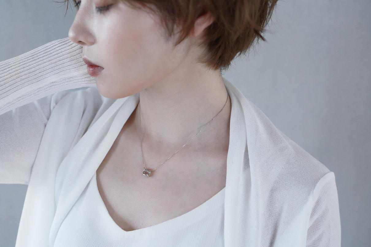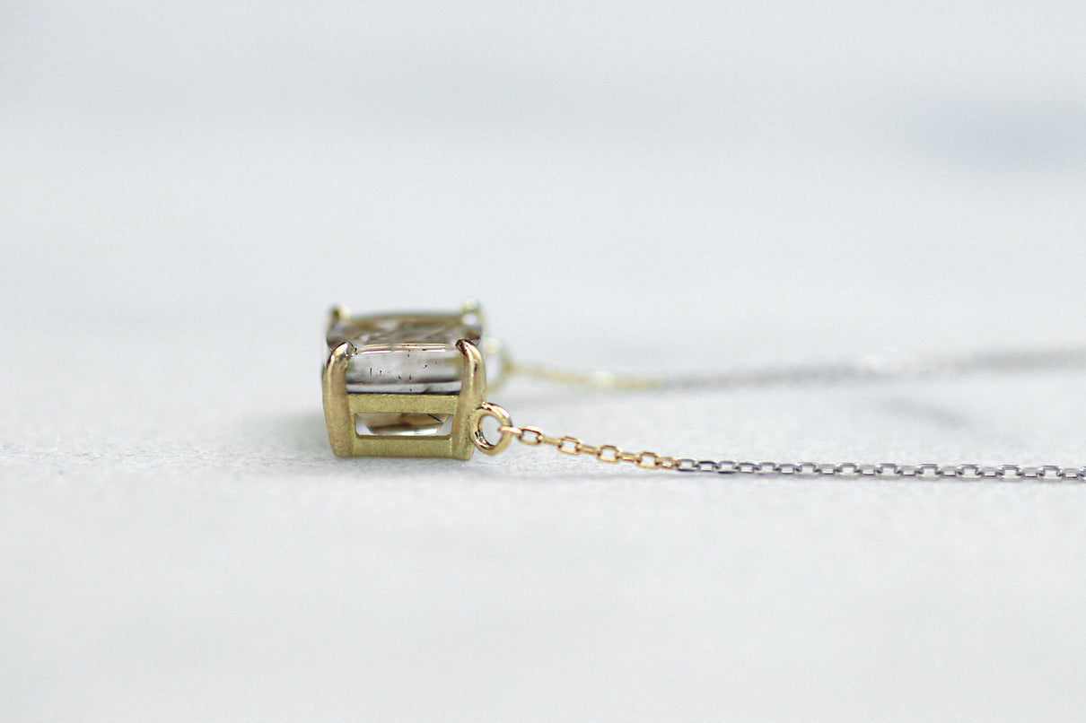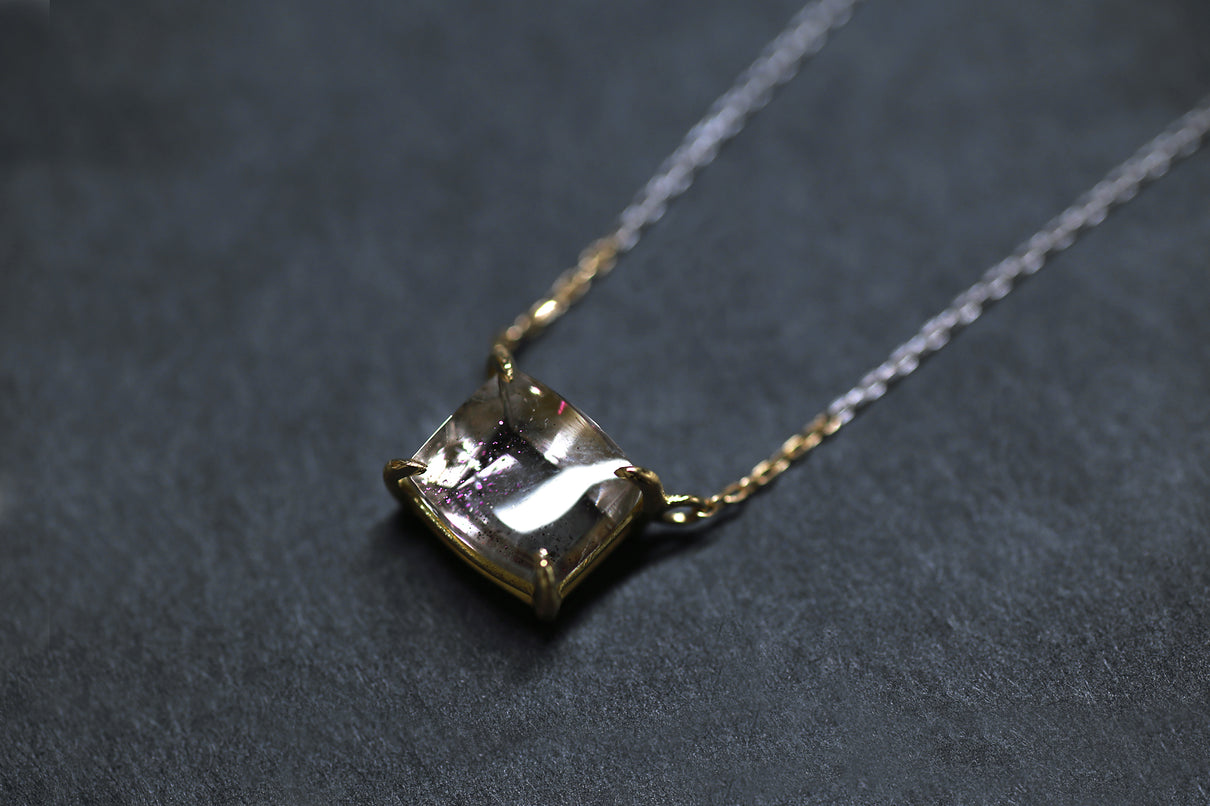 クォーツの中に砂粒が漂うように見えるコーベライトと呼ばれる微細な鉱物が、一定の角度で光を反射し、ピカッと花火のようにマゼンタピンクカラーの閃光を放ち煌めく、ピンクファイヤークォーツで仕立てたネックレス。産出量が極めて少なく、原石も入手困難のため数ある鉱石の中でも大変希少価値の高い天然石です。美しいクォーツをどの角度から眺めてもお愉しみいただけるような構造のシンプルなデザインに落とし込み、プラチナとK18ゴールドのコンビカラーで仕立てました。チェーンひとコマでの素材の切り替えは、1mm以下の作業を必要とする高度な手仕事です。角度を変えると不意に現れる、細かく鮮やかなコントラストが驚きと高揚感を感じさせ、さりげなく華やかな印象を備えたアイテムです。