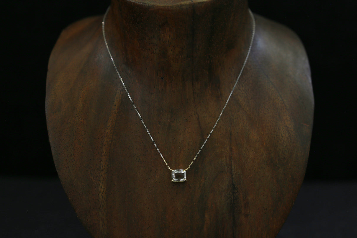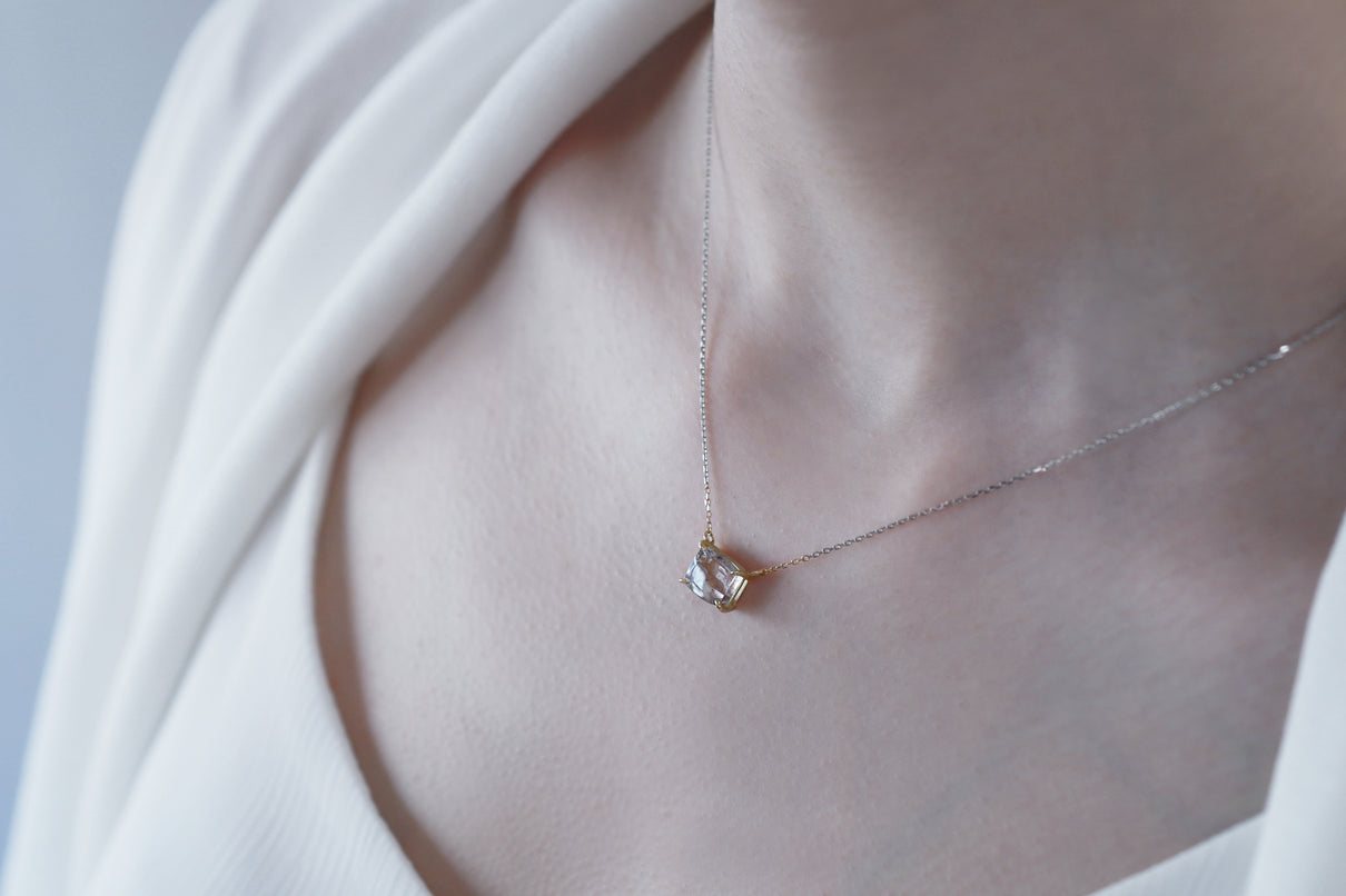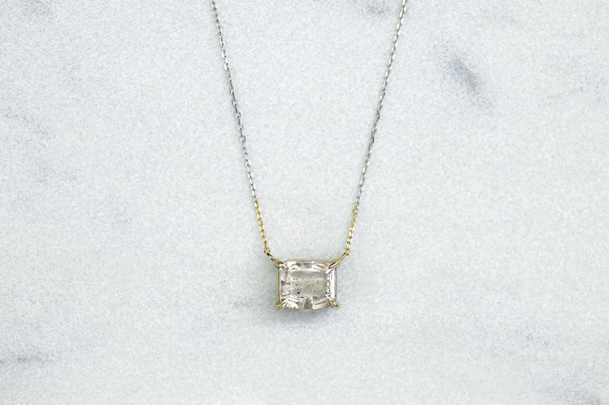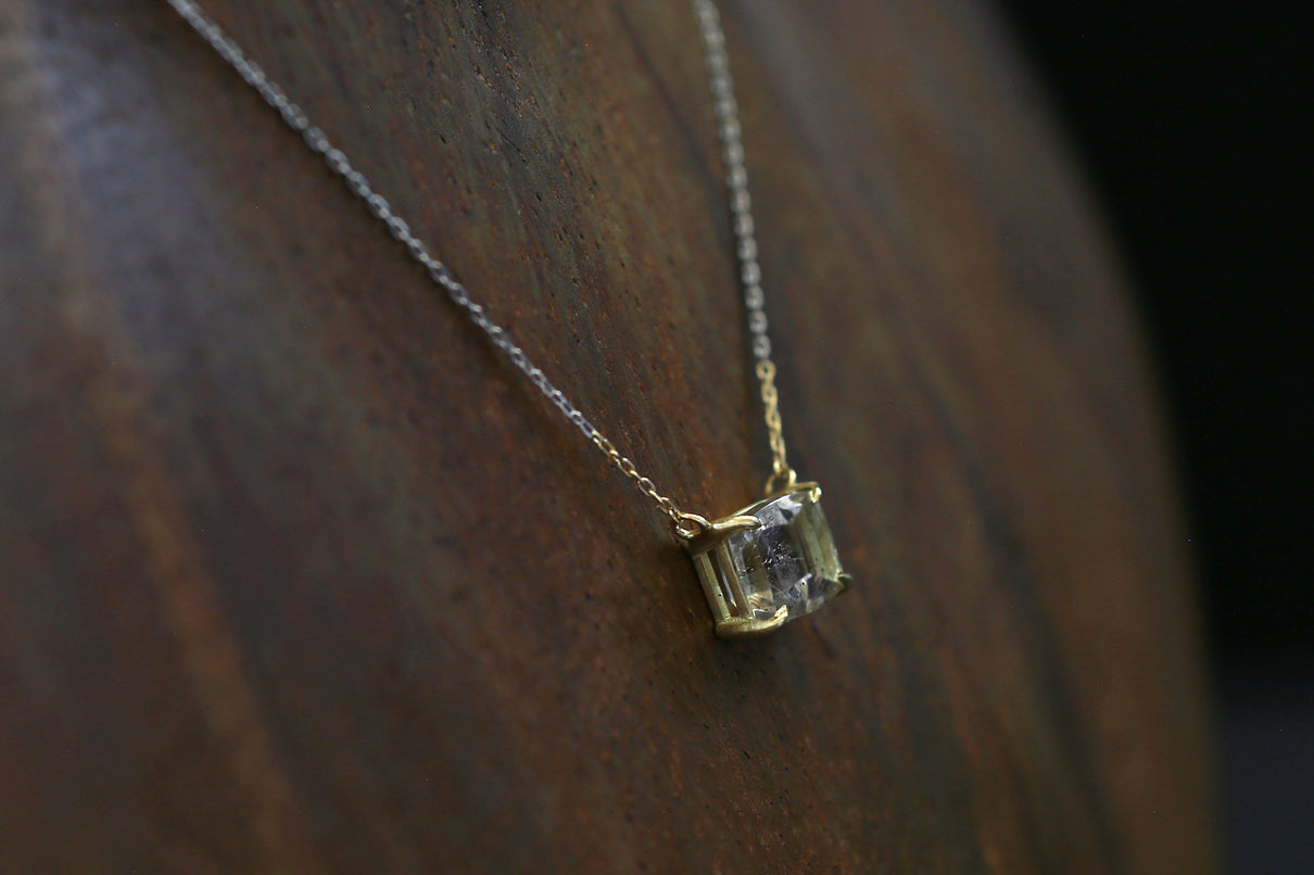 クォーツの中に砂粒が漂うように見えるコーベライトと呼ばれる微細な鉱物が、一定の角度で光を反射し、ピカッと花火のようにマゼンタピンクカラーの閃光を放ち煌めく、ピンクファイヤークォーツで仕立てたネックレス。産出量が極めて少なく、原石も入手困難のため数ある鉱石の中でも大変希少価値の高い天然石です。美しいクォーツをどの角度から眺めてもお愉しみいただけるような構造のシンプルなデザインに落とし込み、プラチナとK18ゴールドのコンビカラーで仕立てました。チェーンひとコマでの素材の切り替えは、1mm以下の作業を必要とする高度な手仕事です。角度を変えると不意に現れる、細かく鮮やかなコントラストが驚きと高揚感を感じさせ、さりげなく華やかな印象を備えたアイテムです。