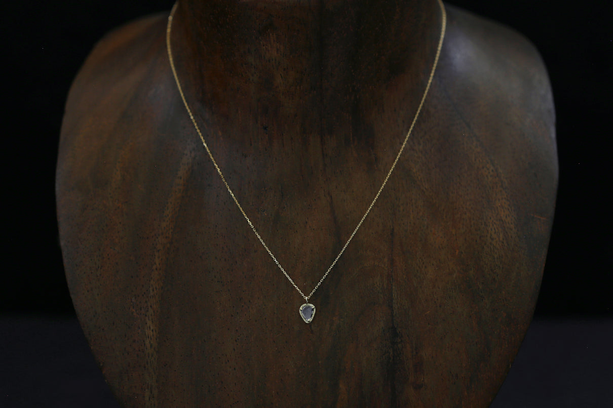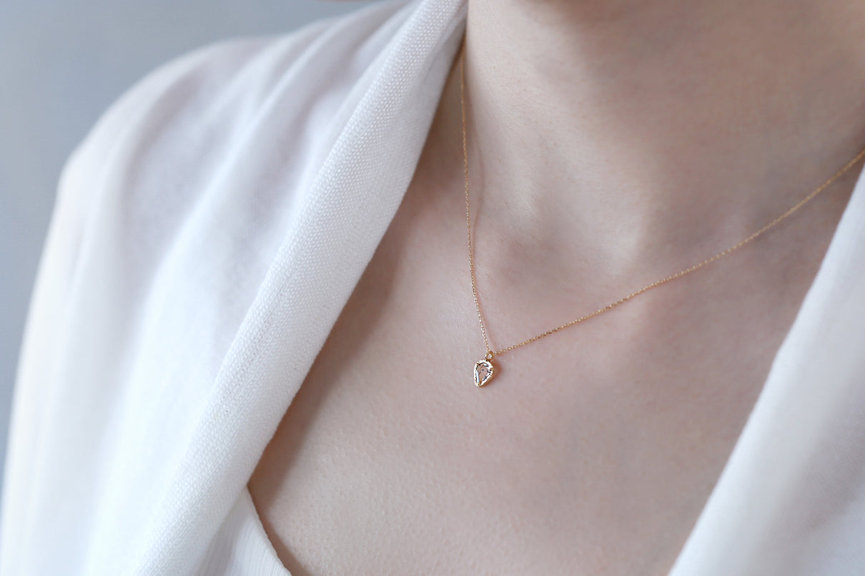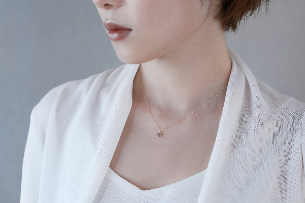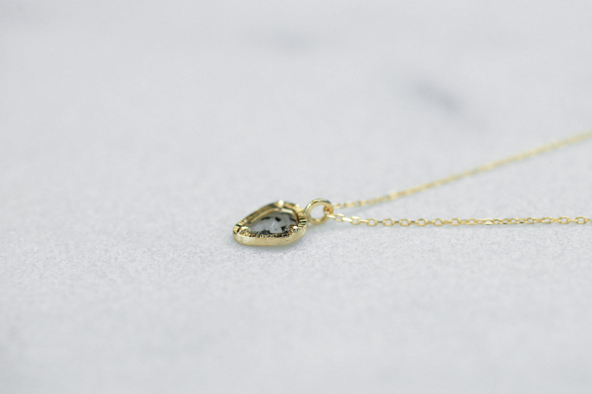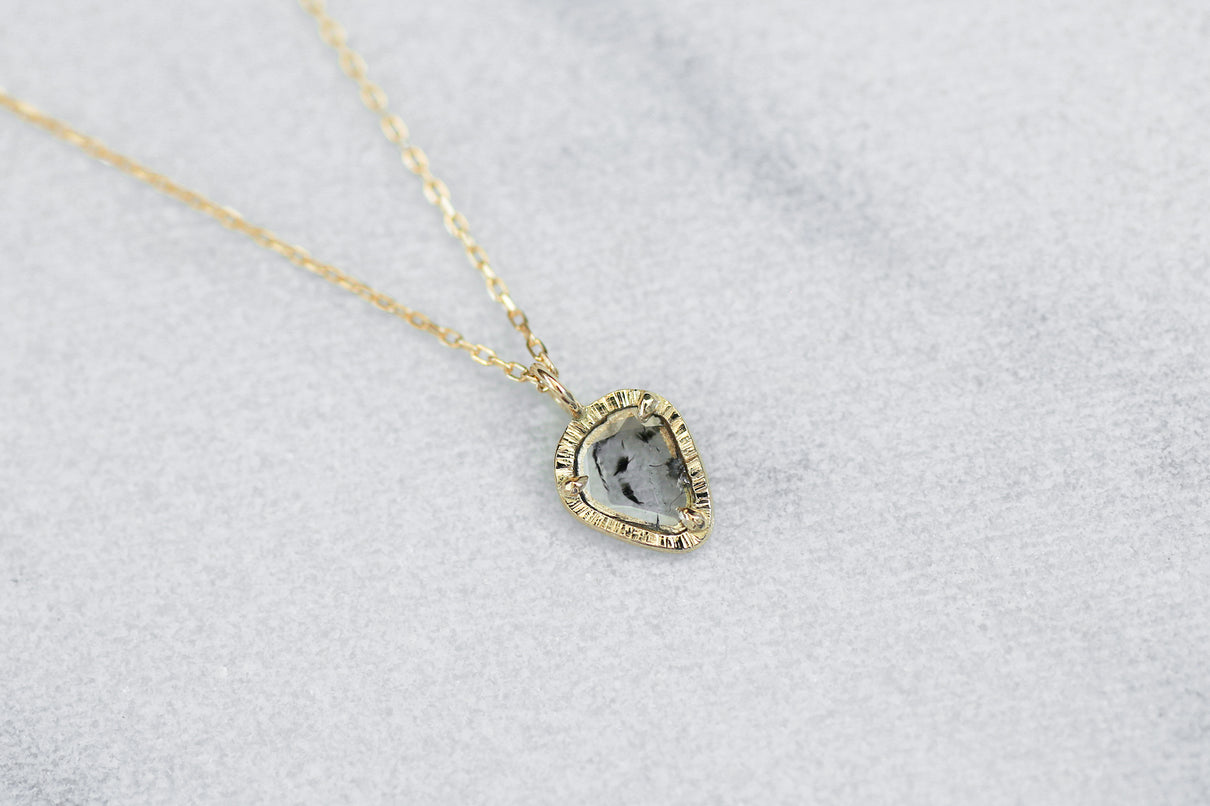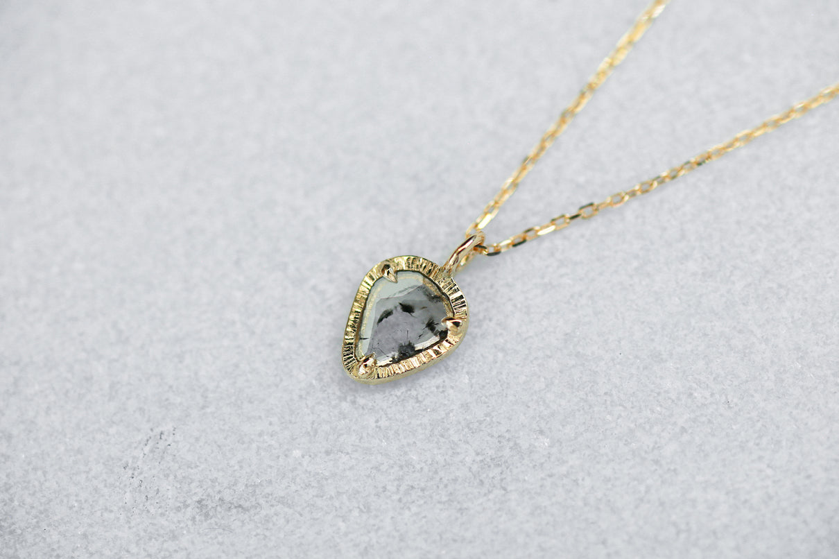 インクルージョンが閉じ込められたダイヤモンドで仕立てた1点もののネックレス。採掘されたままの姿でスライスカットすることにより、自然が形づくる豊かなフォルムや、独特な模様がさりげなく入りこんだ奥行きのある表情となっています。ダイヤモンドならではの強い輝きを放ち、それを縁取るK18ゴールドに施した繊細に煌めく筋彫りが、一層華やかに引き立てます。日常的に身に着けやすいサイズ感で、装いに華やぎを添えるアイテムです。(*黒色のインクルージョンの他、一部クラック状の内包物が見られます。自然が形づくる天然石ならではの表情としてお愉しみください)