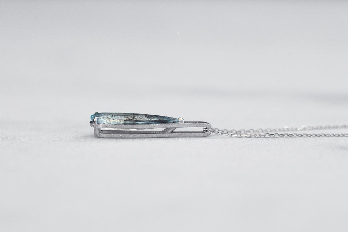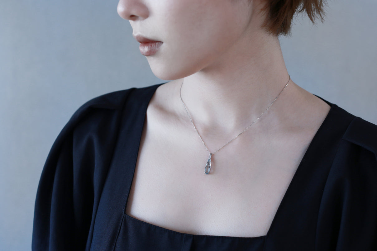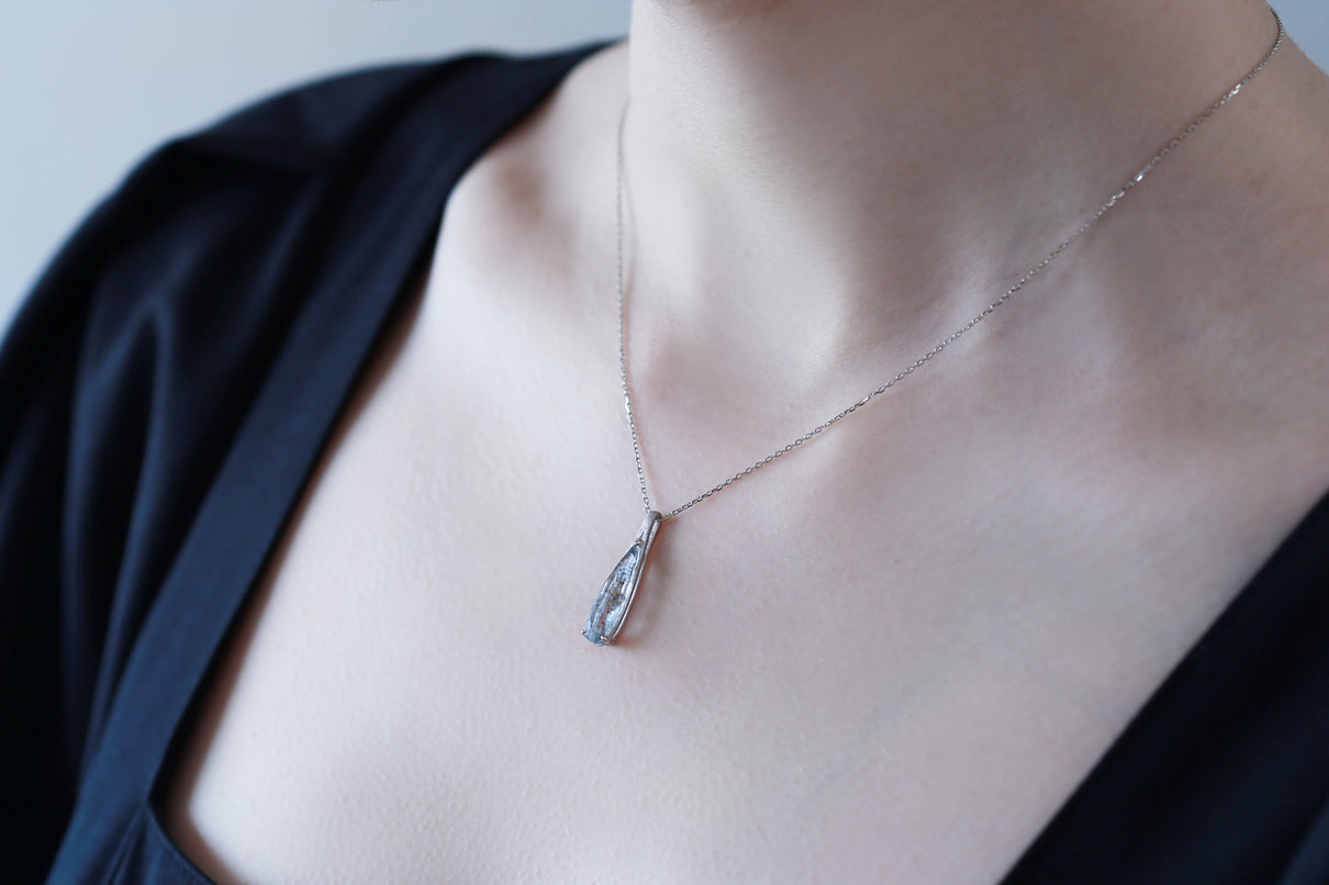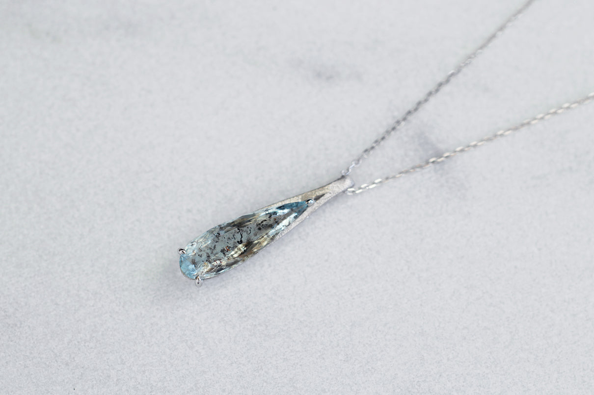 幻想的な表情が美しい、モスアクアマリンで仕立てた1点もののネックレス。アクアマリンにチタン鉄鉱と呼ばれる黒褐色のインクルージョンが閉じ込められた流通量も少ない希少な天然石です。雫型にカットしたフォルムと、澄んだ水中に苔むすような朧げなインクルージョンの表情が美しい1ピースです。真横から眺めた表情も愉しめるよう、プラチナの石座を抜いた建築的なデザインは、石を引き立てながらしっかりとした存在感を放ち、軽やかさを兼ね備えた仕上げに。日々の装いに、凛とした雰囲気を添えてくれるアイテム。3月の誕生石としても親しまれているアクアマリンは、3月生まれの方の特別なお守りとしてもお勧めです。