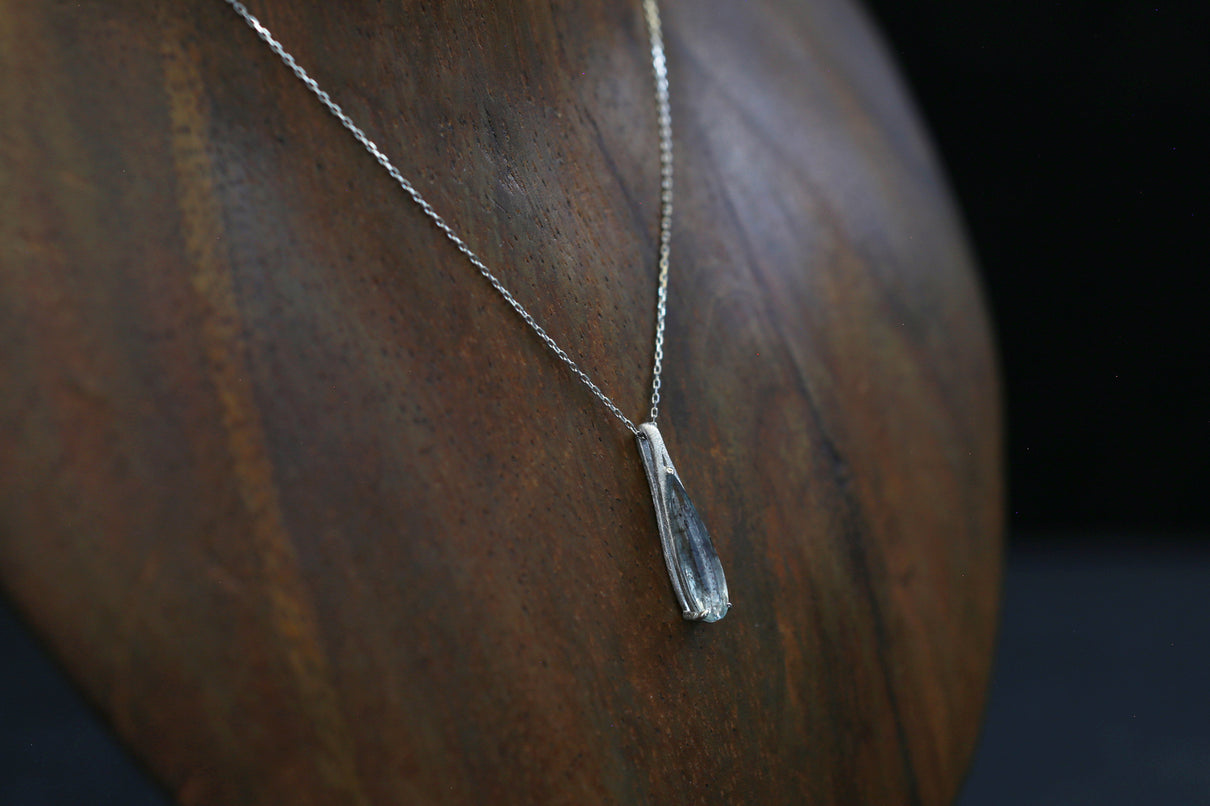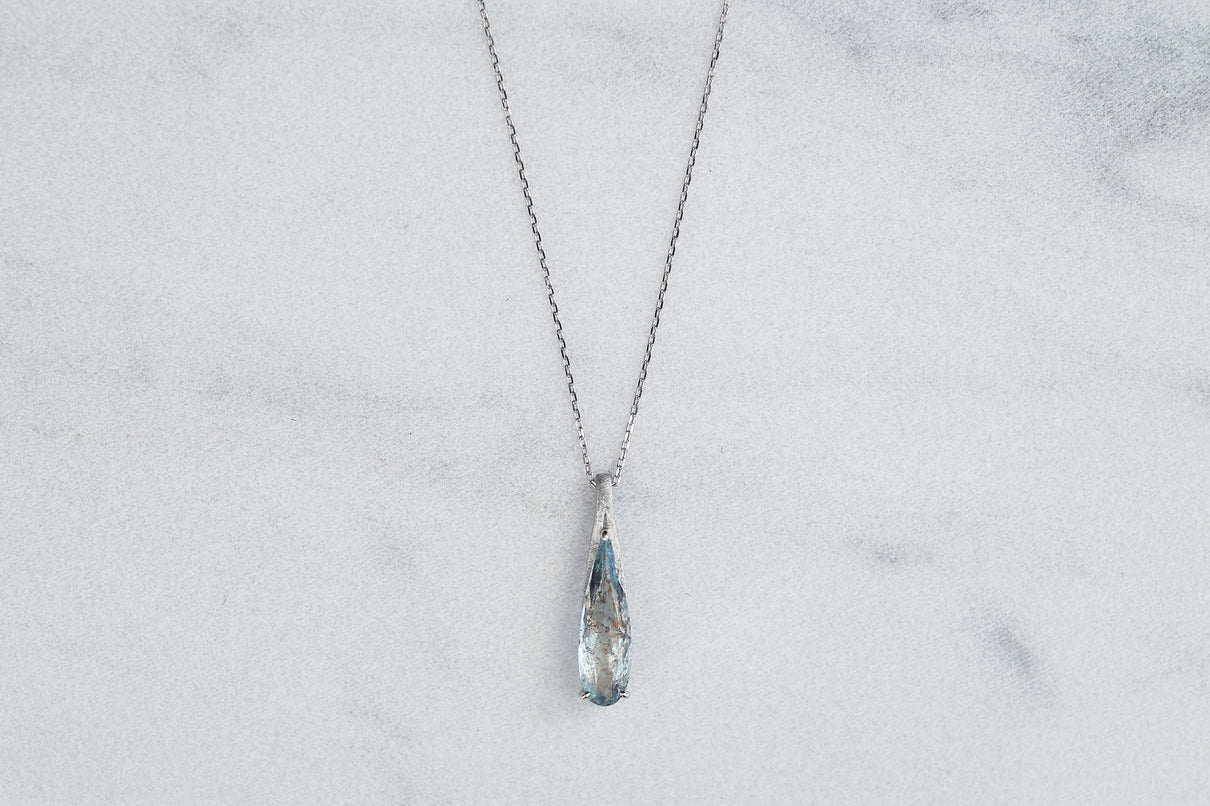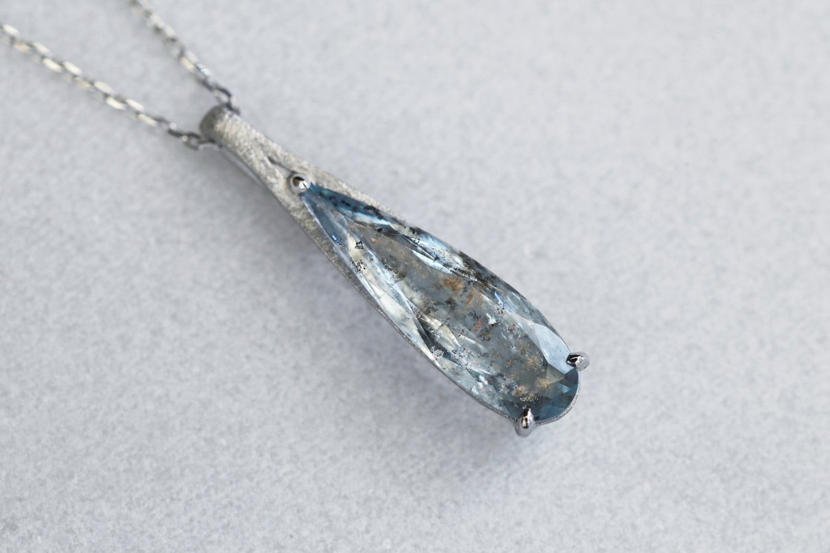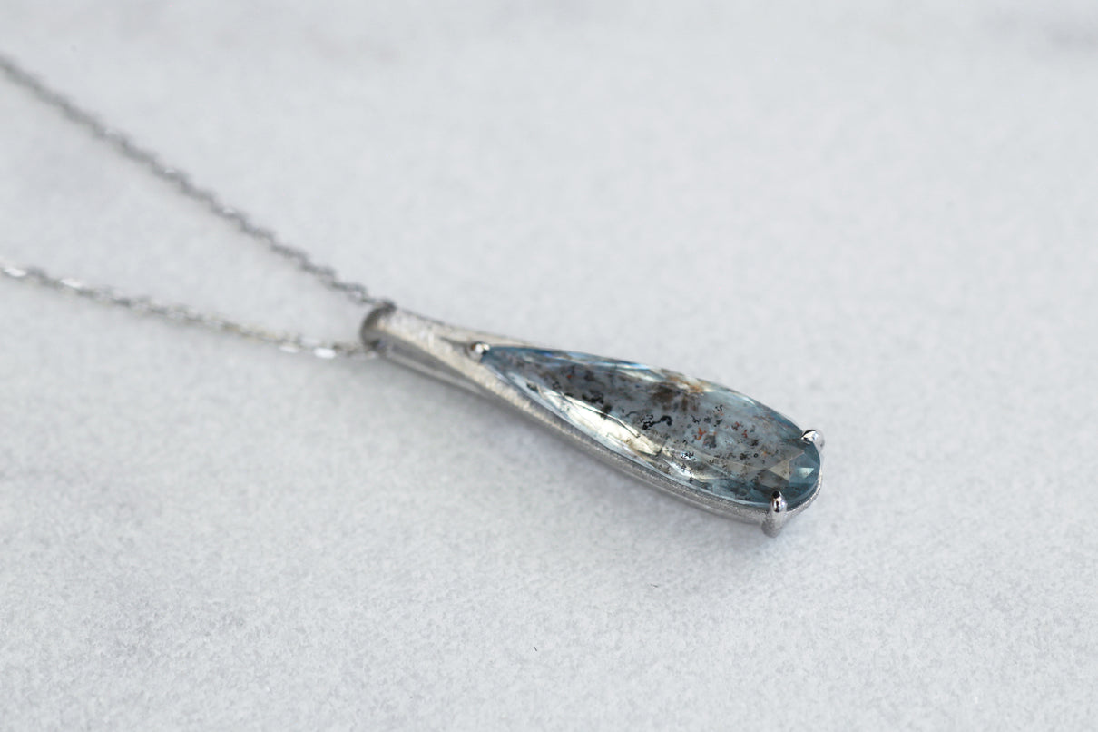 幻想的な表情が美しい、モスアクアマリンで仕立てた1点もののネックレス。アクアマリンにチタン鉄鉱と呼ばれる黒褐色のインクルージョンが閉じ込められた流通量も少ない希少な天然石です。雫型にカットしたフォルムと、澄んだ水中に苔むすような朧げなインクルージョンの表情が美しい1ピースです。真横から眺めた表情も愉しめるよう、プラチナの石座を抜いた建築的なデザインは、石を引き立てながらしっかりとした存在感を放ち、軽やかさを兼ね備えた仕上げに。日々の装いに、凛とした雰囲気を添えてくれるアイテム。3月の誕生石としても親しまれているアクアマリンは、3月生まれの方の特別なお守りとしてもお勧めです。