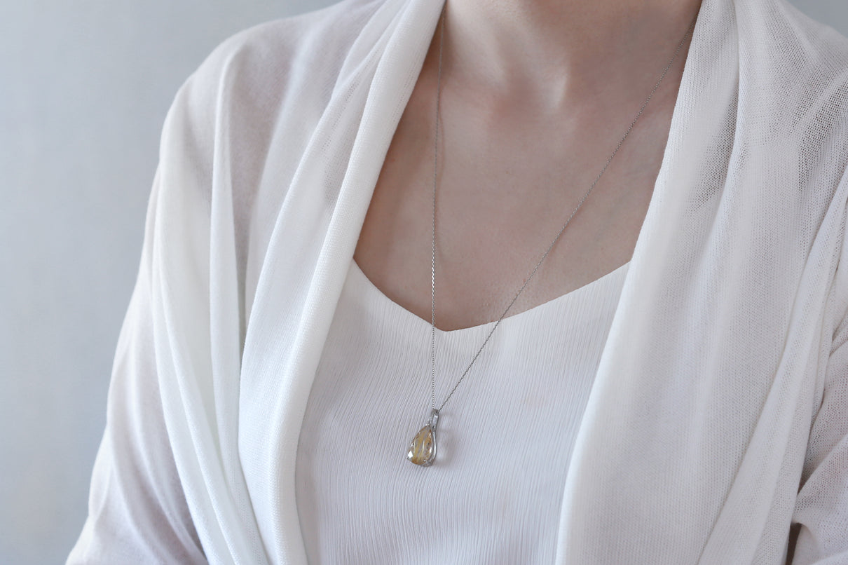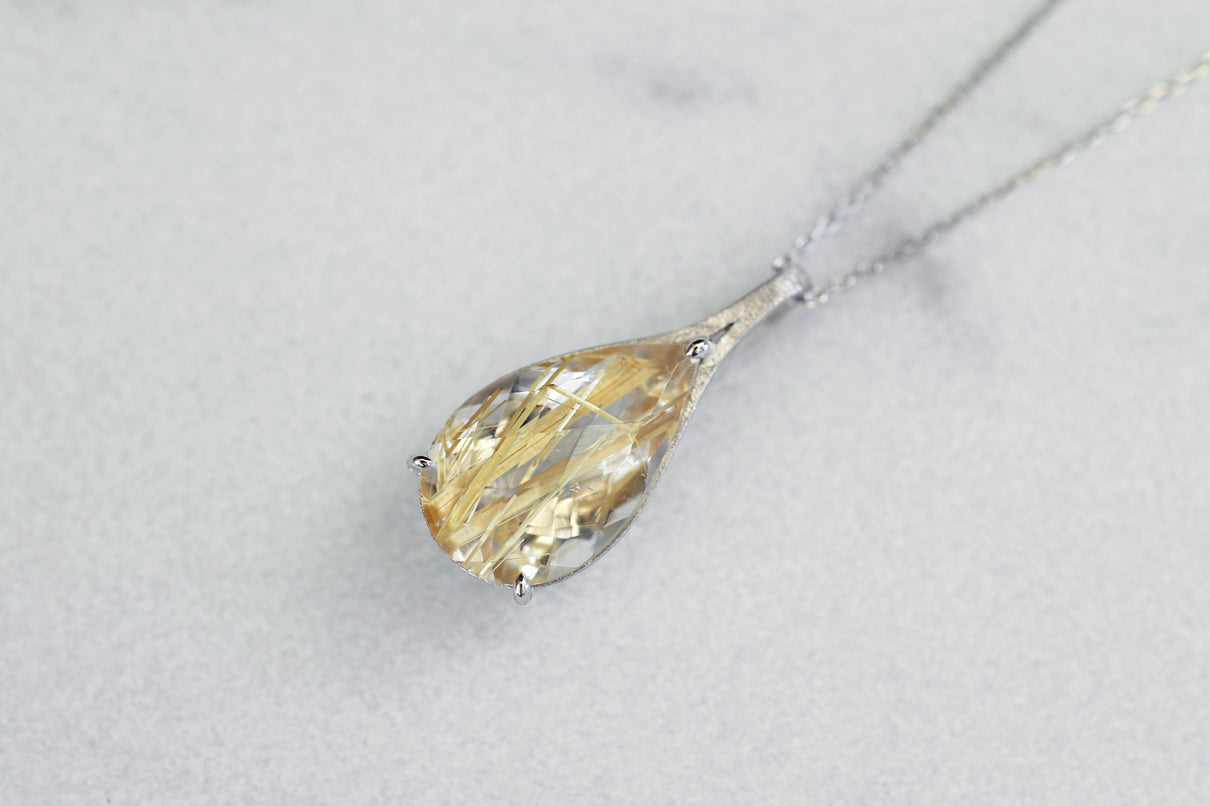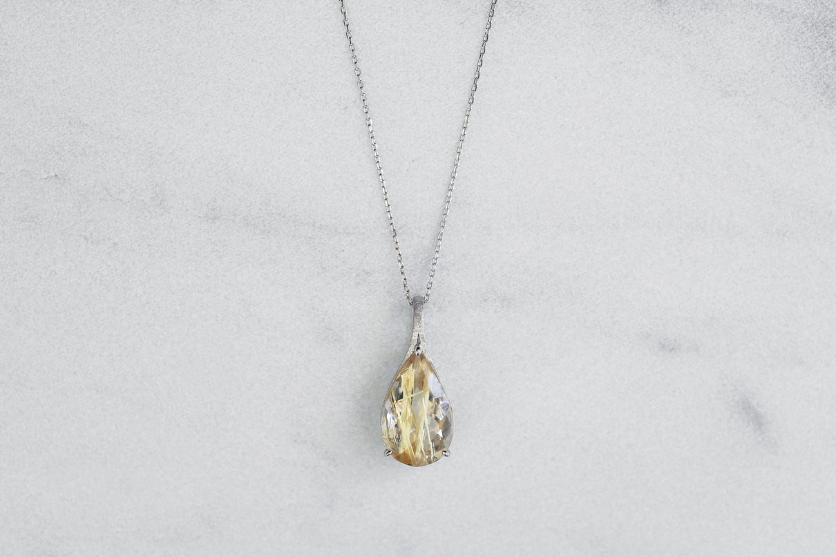クォーツの中に閉じ込められた、黄金色の無数の針のような内包物が個性溢れる、ゴールドルチルクォーツで仕立てた1点もののネックレス。透明度の高いクォーツに潔く入り込んだゴールドルチルの神秘的な輝きが美しく、ドロップ型に施されたファセットカットが一層複雑な煌きを湛えます。プラチナの石座を部分的に抜いた建築的なデザインは、正面からは石の魅力を際立たせ、真横から眺めた表情も愉しめるようにしっかりとした存在感を放ちながら、軽やかさを兼ね備えた仕上げに。装いの主役として、スタイリッシュな華やぎを添えてくれるアイテムです。