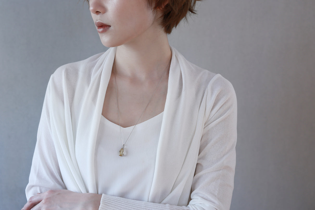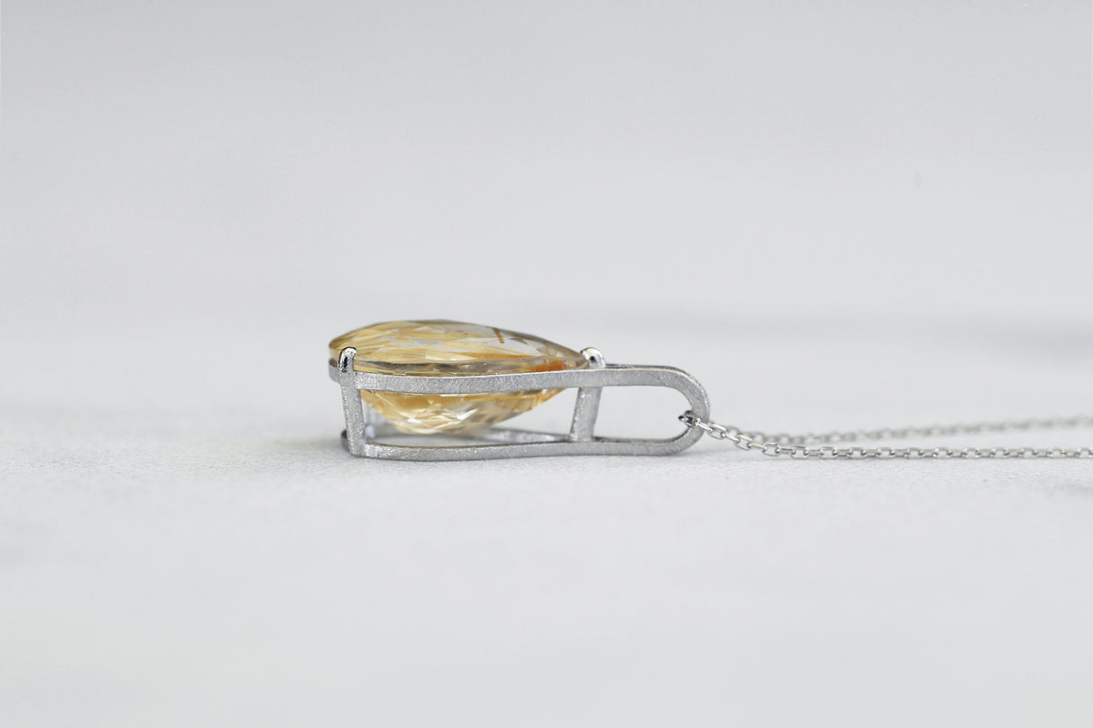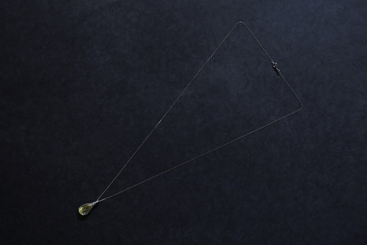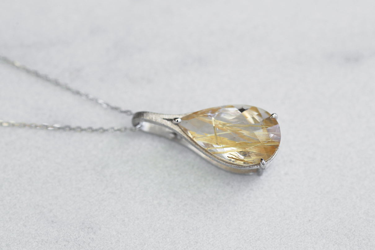 クォーツの中に閉じ込められた、黄金色の無数の針のような内包物が個性溢れる、ゴールドルチルクォーツで仕立てた1点もののネックレス。透明度の高いクォーツに潔く入り込んだゴールドルチルの神秘的な輝きが美しく、ドロップ型に施されたファセットカットが一層複雑な煌きを湛えます。プラチナの石座を部分的に抜いた建築的なデザインは、正面からは石の魅力を際立たせ、真横から眺めた表情も愉しめるようにしっかりとした存在感を放ちながら、軽やかさを兼ね備えた仕上げに。装いの主役として、スタイリッシュな華やぎを添えてくれるアイテムです。