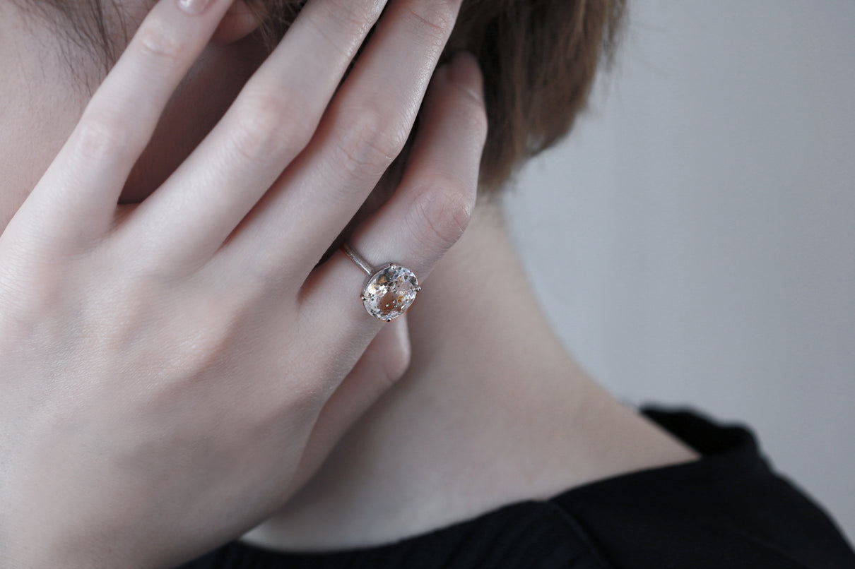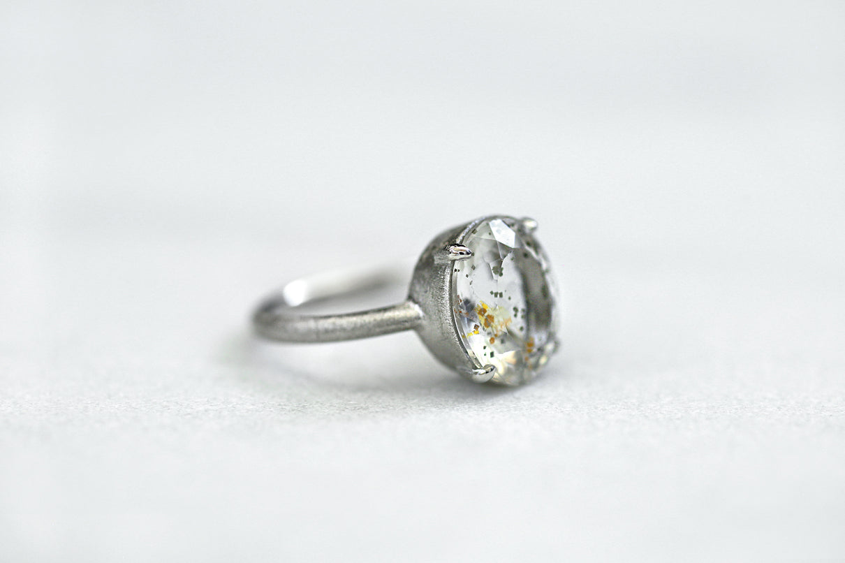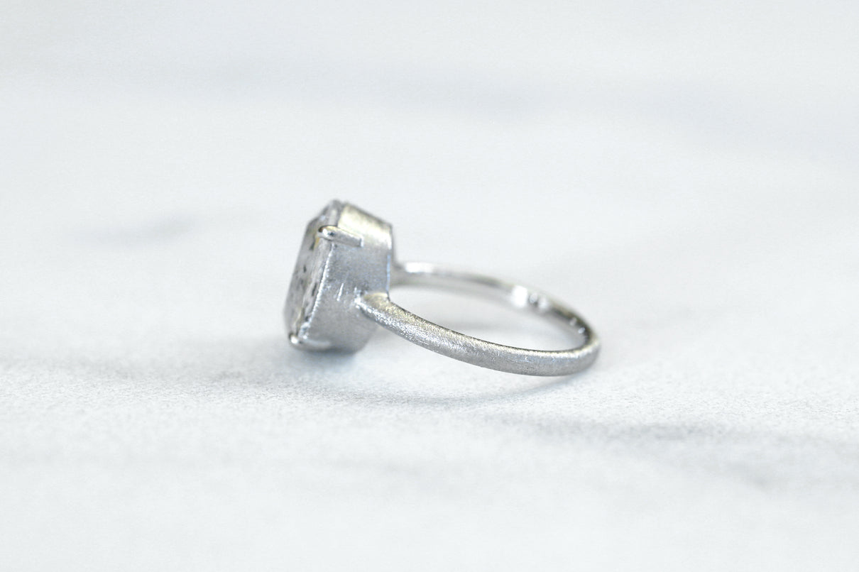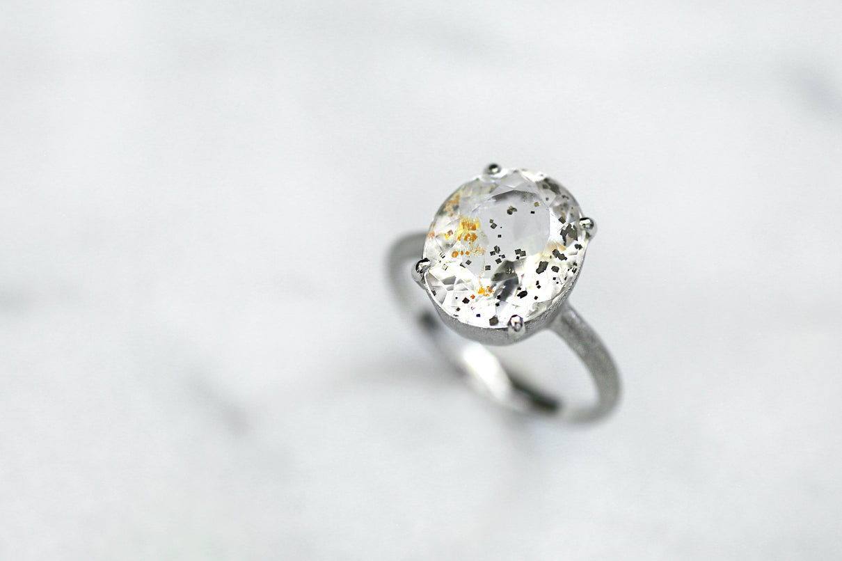 金属箔を彷彿とさせる上品で奥ゆかしい煌めきが美しい、マーカサイトインクォーツで仕立てた1点もののリング。マーカサイトは、硫黄と鉄鉱が結びつくことで生まれた結晶です。それが透明なクォーツが育つ過程で閉じ込められ、幾重もの偶然が重なり合って出来た鉱石がマーカサイトインクォーツです。透明度の高いクォーツの中に散りばめられた幾何学状のマーカサイトの他、炎のような色をしたライモナイト(褐鉄鉱)も見られ、幻想的な表情を湛えた天然石ならではの美しい1ピース。プラチナのリング部分や石を受け止める石座部分はプレーンなマットテクスチャーを施し、石を留める小さな爪部分のみ艶仕上げにすることによって、主役の石を凛と引き立てます。装いの主役として、手元から個性と華やぎを添えるアイテムです。