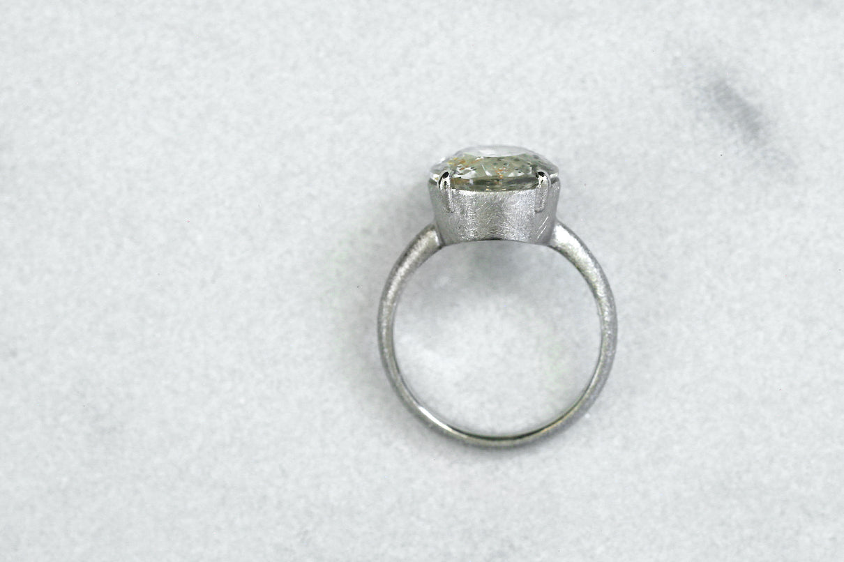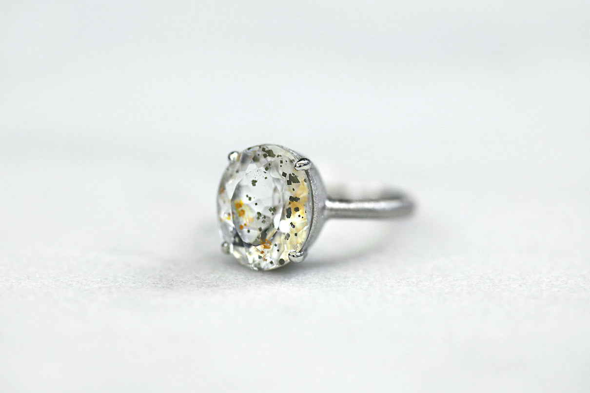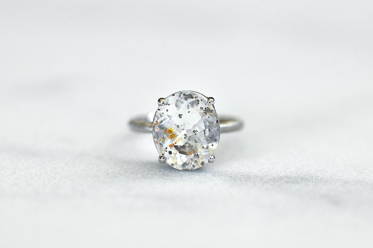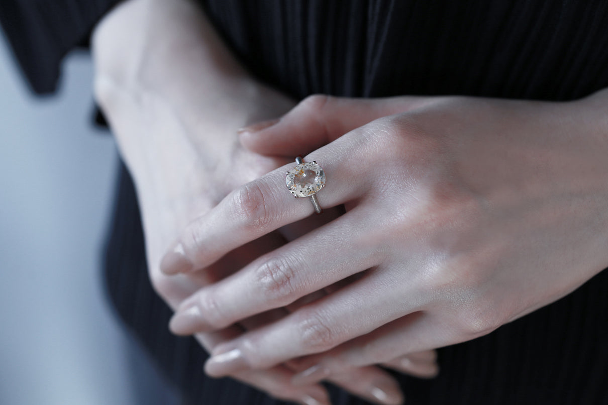 金属箔を彷彿とさせる上品で奥ゆかしい煌めきが美しい、マーカサイトインクォーツで仕立てた1点もののリング。マーカサイトは、硫黄と鉄鉱が結びつくことで生まれた結晶です。それが透明なクォーツが育つ過程で閉じ込められ、幾重もの偶然が重なり合って出来た鉱石がマーカサイトインクォーツです。透明度の高いクォーツの中に散りばめられた幾何学状のマーカサイトの他、炎のような色をしたライモナイト(褐鉄鉱)も見られ、幻想的な表情を湛えた天然石ならではの美しい1ピース。プラチナのリング部分や石を受け止める石座部分はプレーンなマットテクスチャーを施し、石を留める小さな爪部分のみ艶仕上げにすることによって、主役の石を凛と引き立てます。装いの主役として、手元から個性と華やぎを添えるアイテムです。