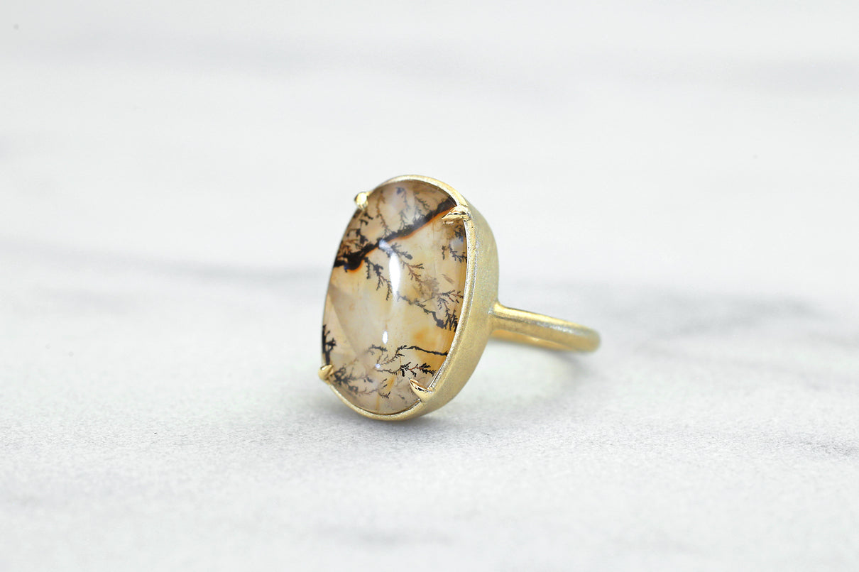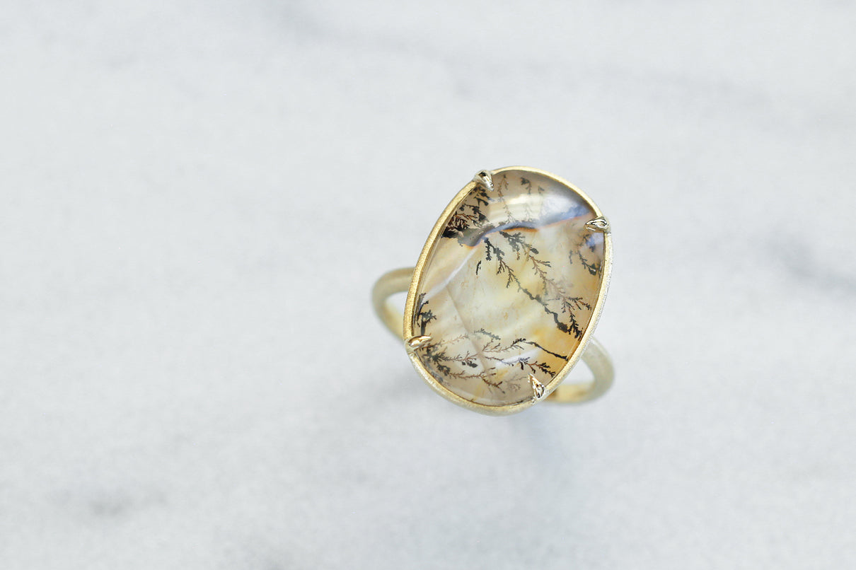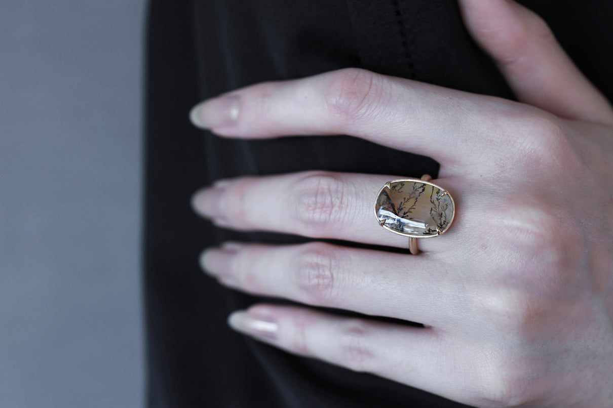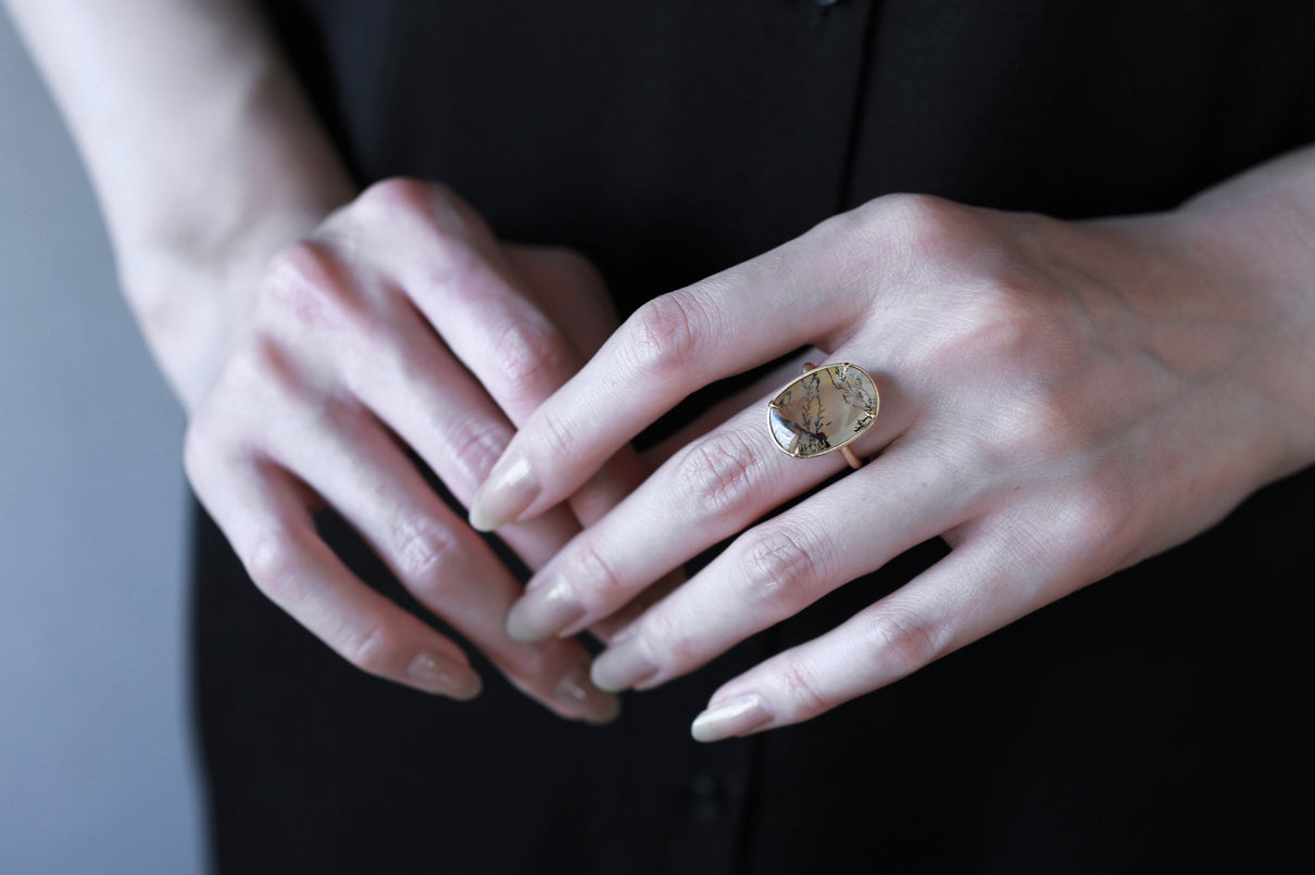 樹枝を思わせるような幻想的な表情が美しい、デンドリティッククォーツで仕立てた1点もののリング。その模様は二酸化マンガンや酸化鉄などが入り込み、再結晶化することにより生み出された自然の産物です。様々な角度から滲むように伸びる落ち着いた色彩は、オーバル型の水晶のキャンバスの中で層を違えて交差、重なり合い、奥行きのある立体感で黒やグレー、黄、橙色の繊細な表情を描き出します。その絵画のような石を、プレーンなマットテクスチャーを施したK18ゴールドのリング部分や石座が引き立て、装いの主役として、手元から華やぎを添えるアイテムです。