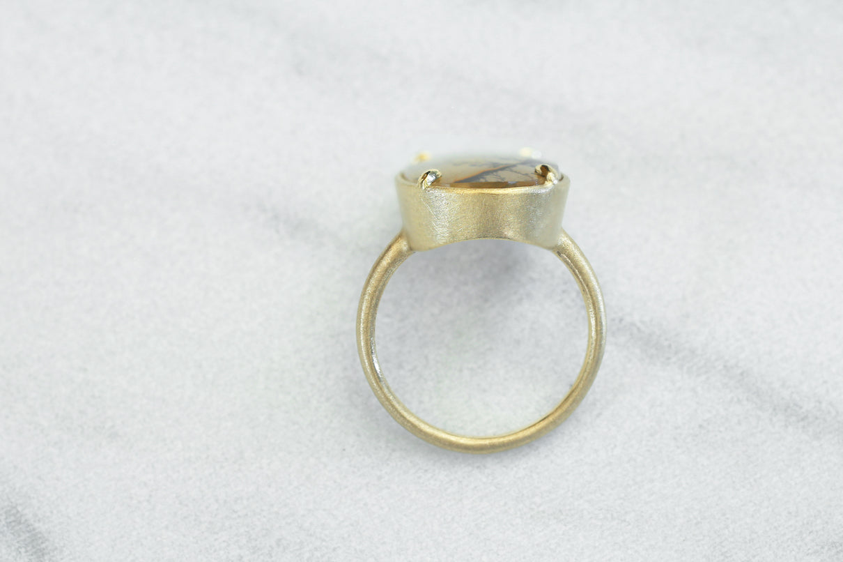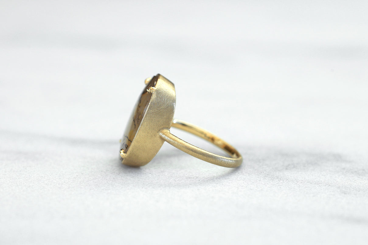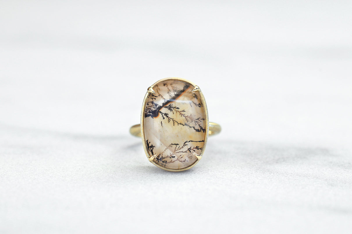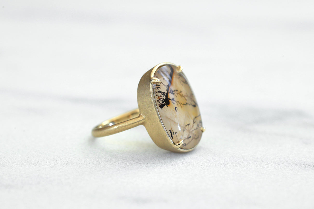 樹枝を思わせるような幻想的な表情が美しい、デンドリティッククォーツで仕立てた1点もののリング。その模様は二酸化マンガンや酸化鉄などが入り込み、再結晶化することにより生み出された自然の産物です。様々な角度から滲むように伸びる落ち着いた色彩は、オーバル型の水晶のキャンバスの中で層を違えて交差、重なり合い、奥行きのある立体感で黒やグレー、黄、橙色の繊細な表情を描き出します。その絵画のような石を、プレーンなマットテクスチャーを施したK18ゴールドのリング部分や石座が引き立て、装いの主役として、手元から華やぎを添えるアイテムです。