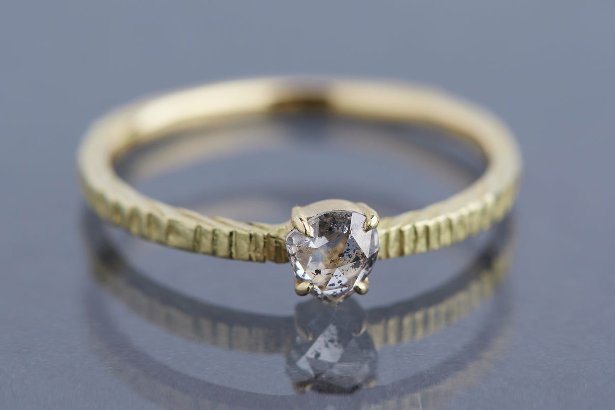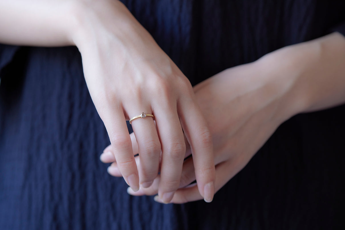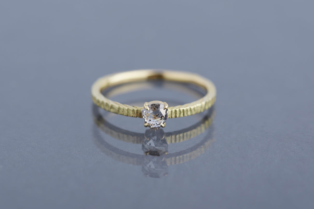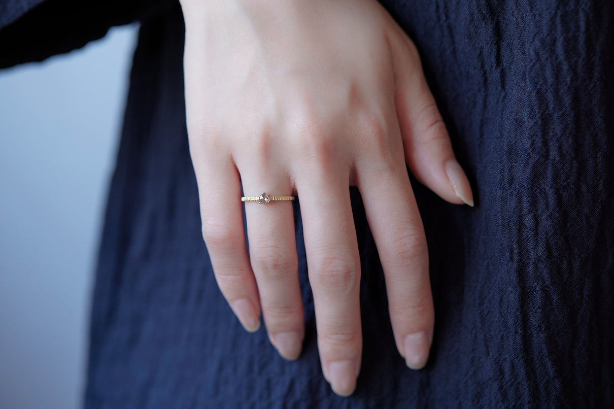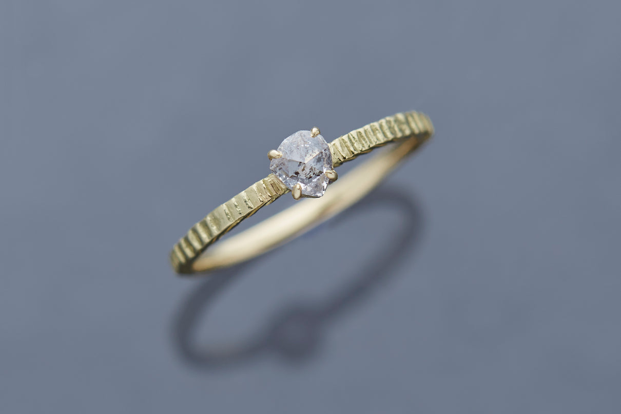 "立ち止まり、目を向ければ 大切なことは 変わらずいつもそこに在る ー" 2023 collection 「Unknown knowns」シリーズのリングベースに個性的なローズカットダイヤモンドを留めた一点もののリング。こちらの「ソルト&ペッパーダイヤモンド」と呼ばれるダイヤモンドは、よく見ると塩と胡椒が絶妙に散りばめられたような独特の模様を内包しています。希少性の高さから日本ではまだ流通量が少なく、光を受けて内包物が中で遊び心を持って輝く様子は神秘的で、一点ものならではの独自の存在感を放ちます。細身のアームは軽やかな付け心地で、普段使いのリングとしてもおすすめです。