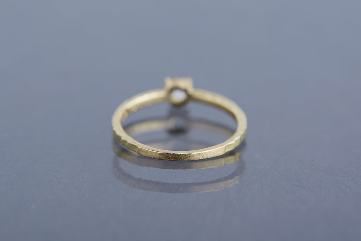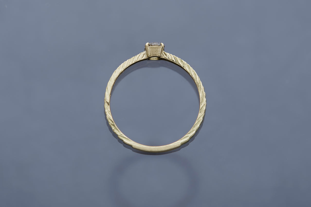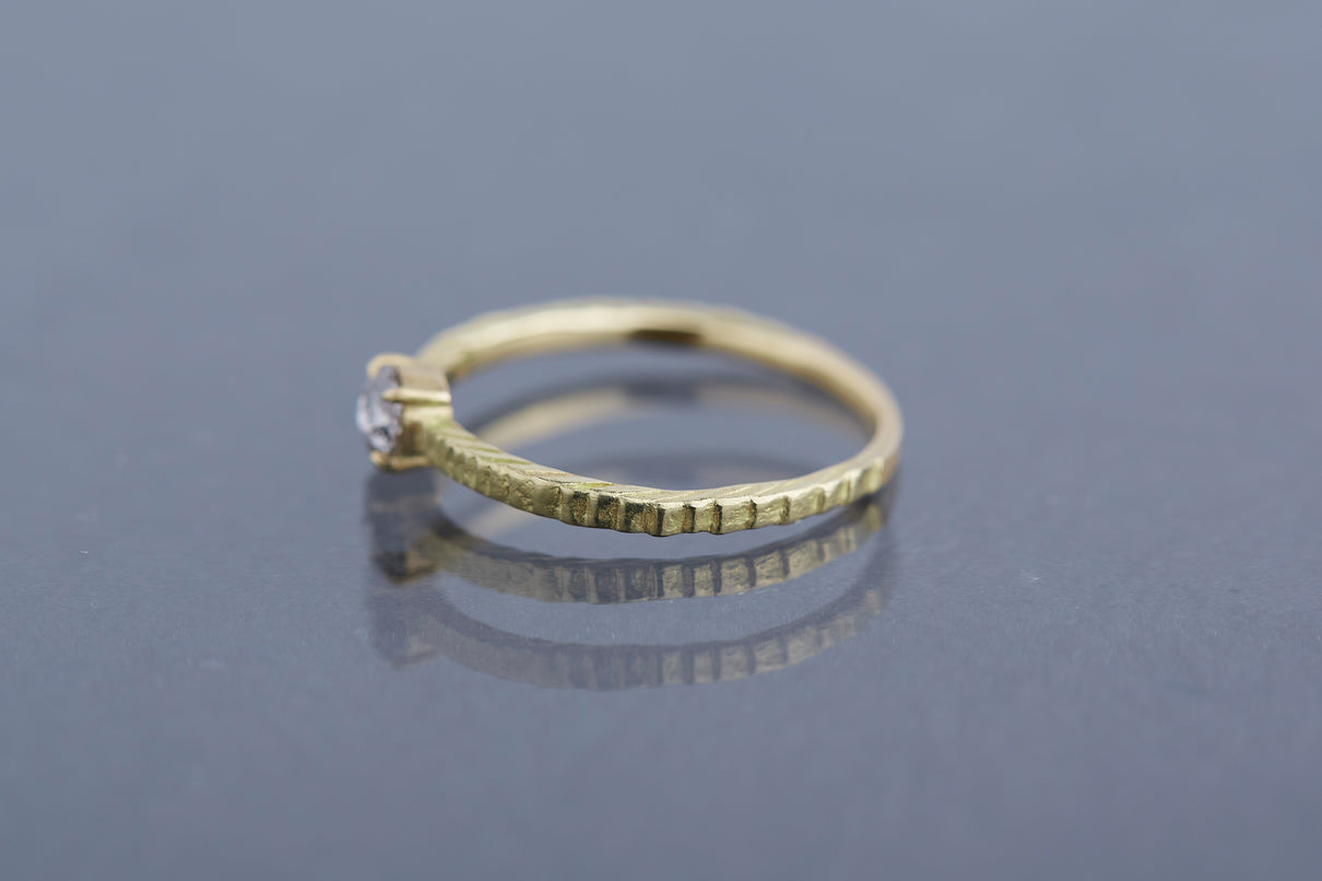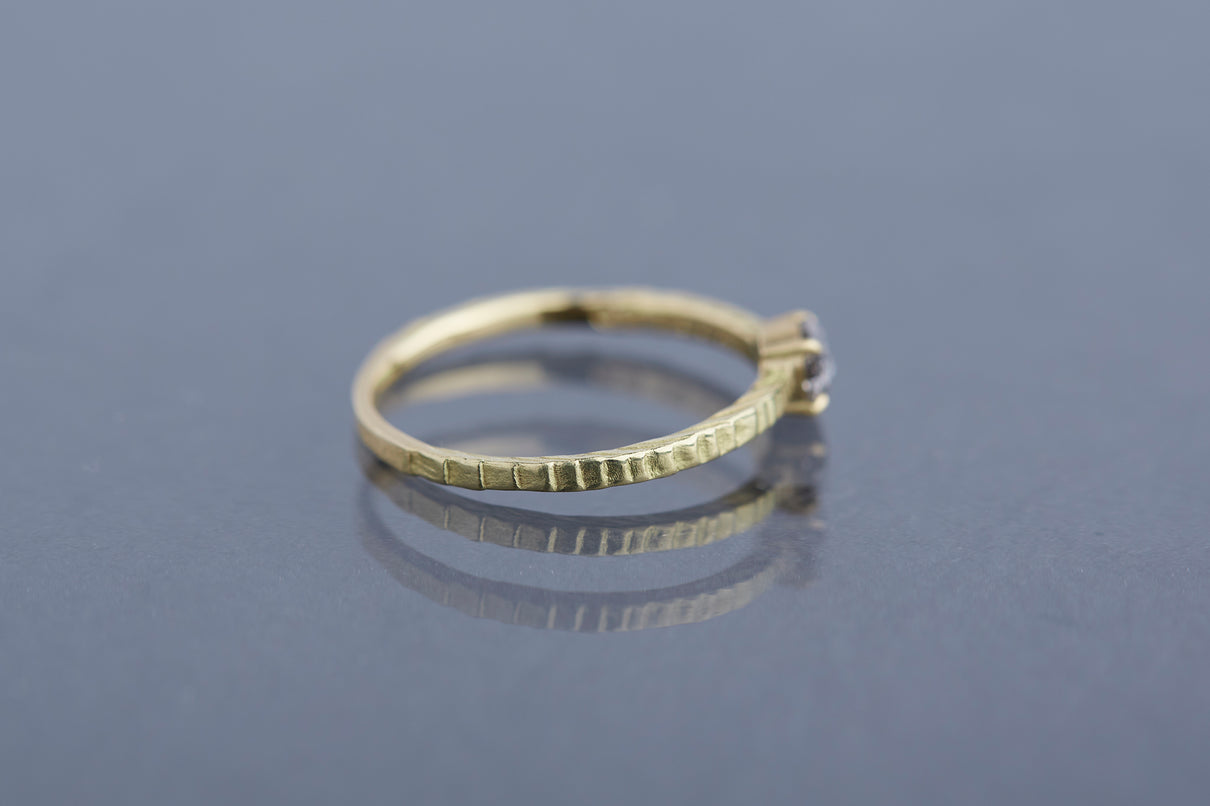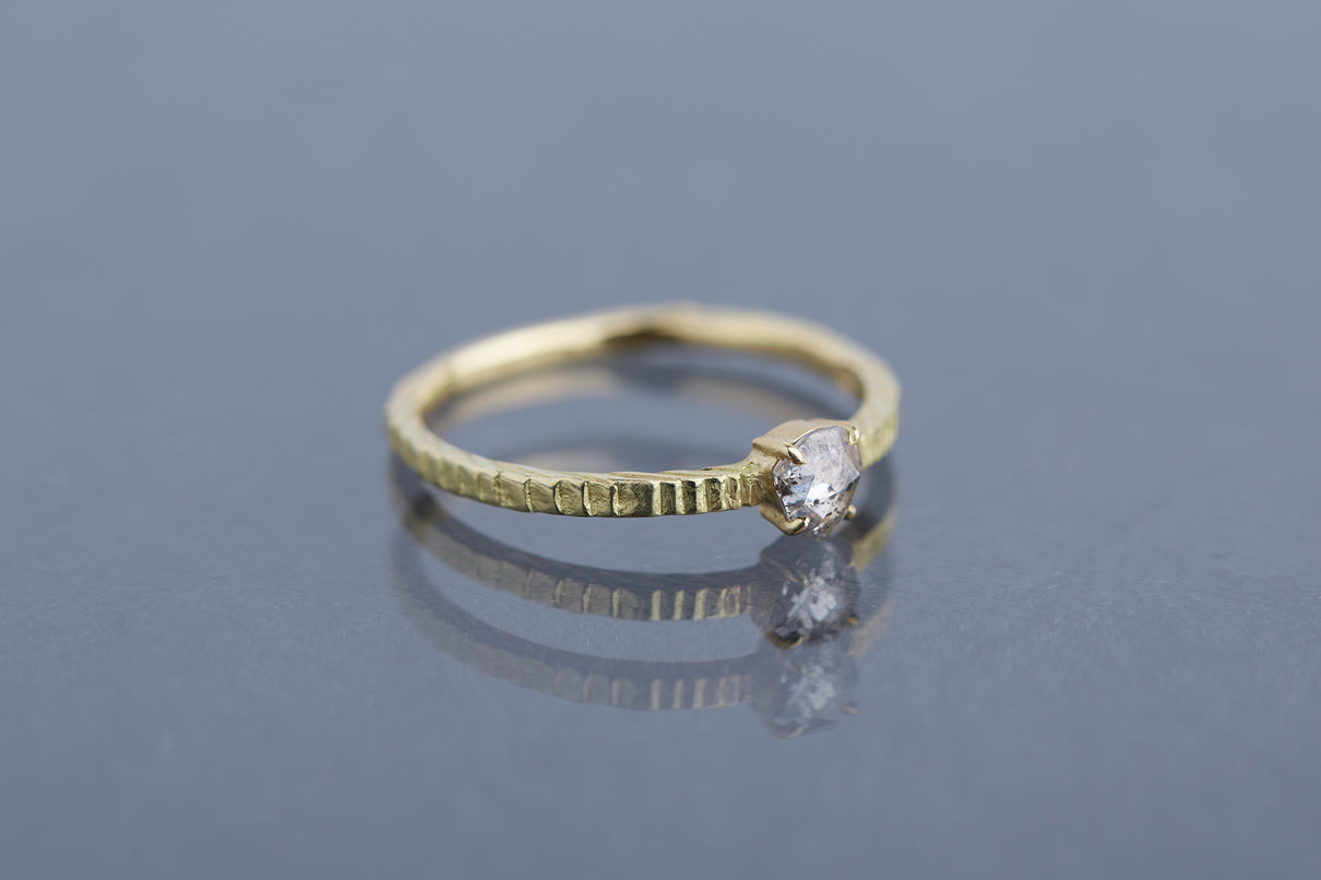 "立ち止まり、目を向ければ 大切なことは 変わらずいつもそこに在る ー" 2023 collection 「Unknown knowns」シリーズのリングベースに個性的なローズカットダイヤモンドを留めた一点もののリング。こちらの「ソルト&ペッパーダイヤモンド」と呼ばれるダイヤモンドは、よく見ると塩と胡椒が絶妙に散りばめられたような独特の模様を内包しています。希少性の高さから日本ではまだ流通量が少なく、光を受けて内包物が中で遊び心を持って輝く様子は神秘的で、一点ものならではの独自の存在感を放ちます。細身のアームは軽やかな付け心地で、普段使いのリングとしてもおすすめです。