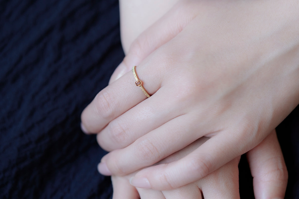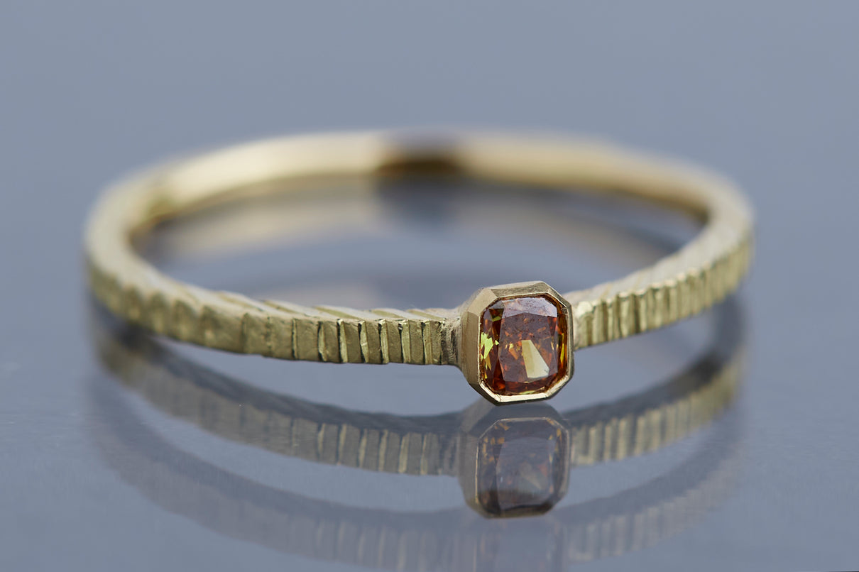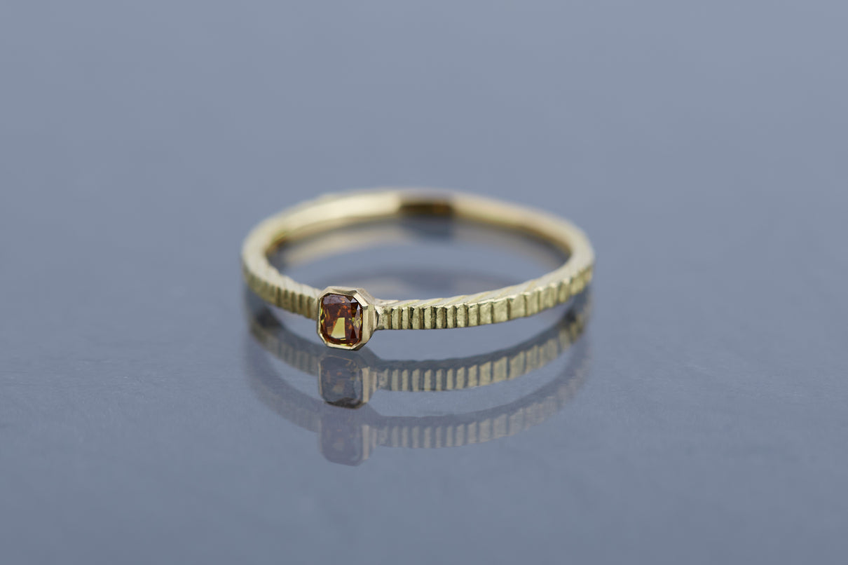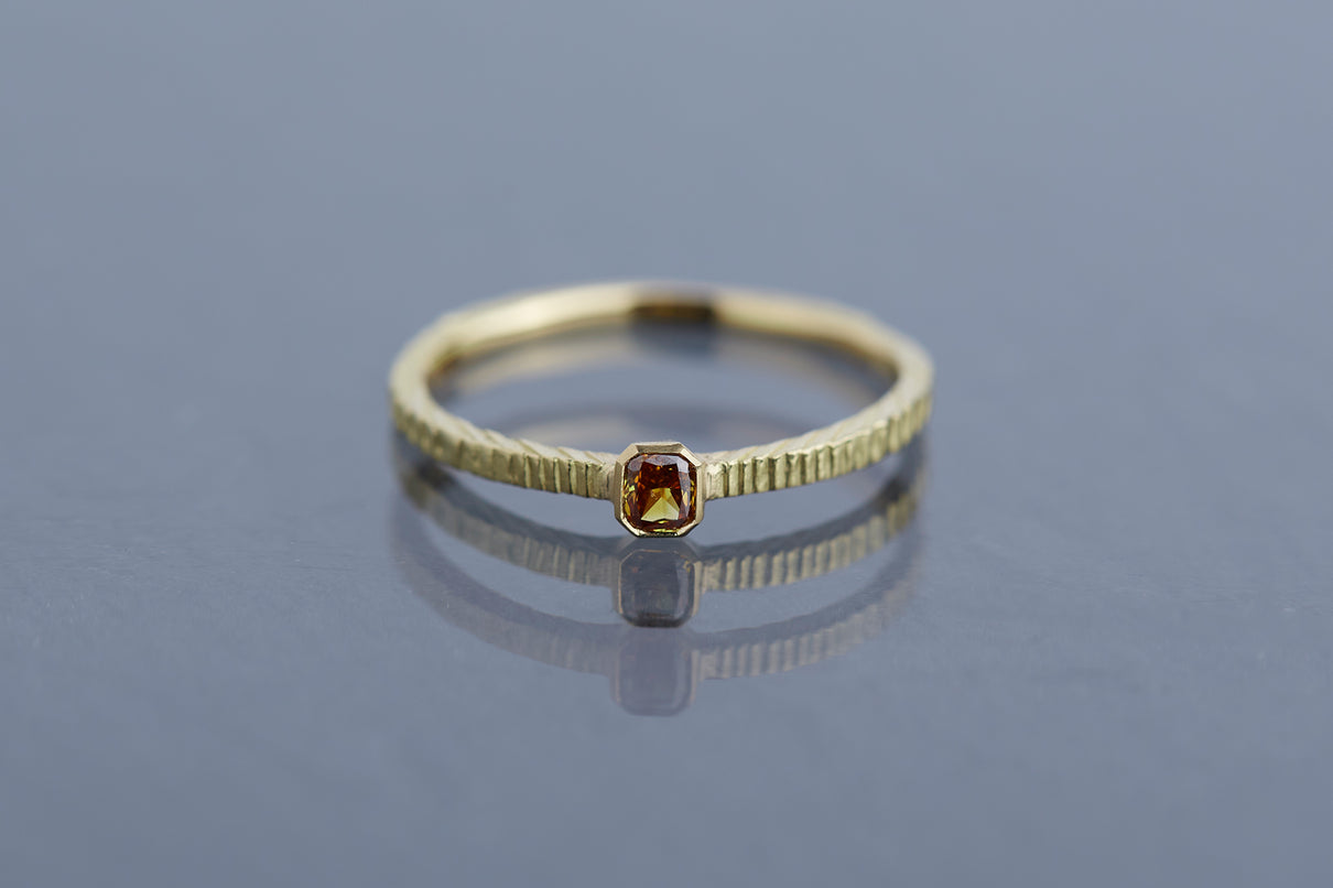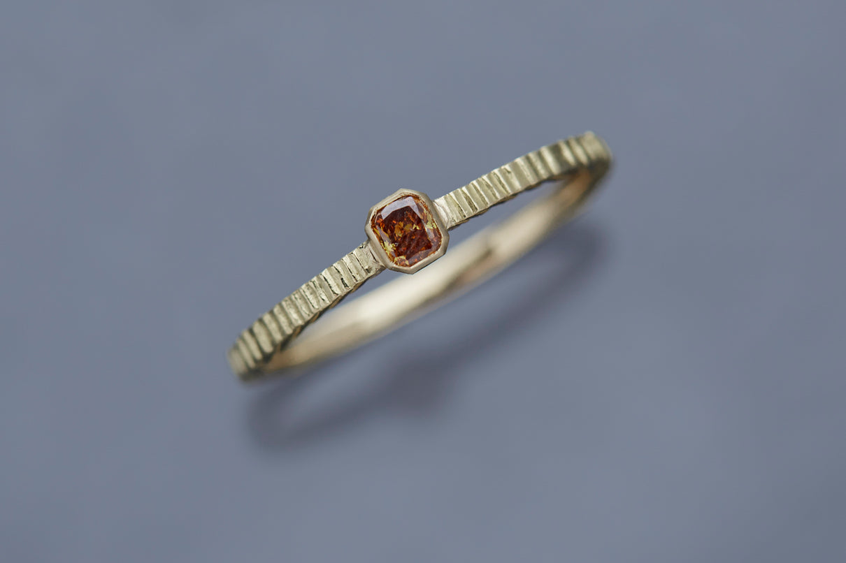 "立ち止まり、目を向ければ 大切なことは 変わらずいつもそこに在る ー" 2023 collection 「Unknown knowns」シリーズのリングベースに、オレンジブラウンのダイヤモンドを留めた一点もののリング。森の中、小さな木の実を見つけた時のような悦びが感じられます。煌めきの強い鮮やかなカラーで小粒ながらも目を惹く存在感がありますが、暖色系のダイヤモンドは肌馴染みが良く、手元のアクセントにぴったり。細身のアームは軽やかな付け心地で、普段使いのリングとしてもおすすめです。