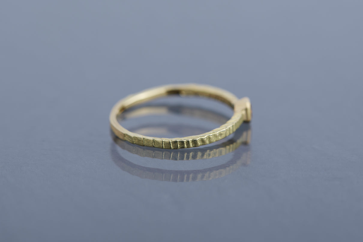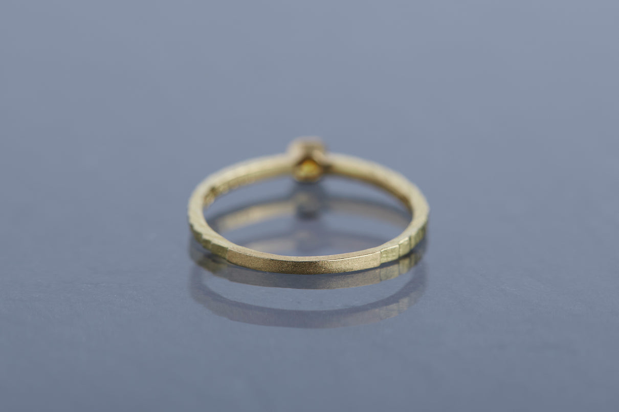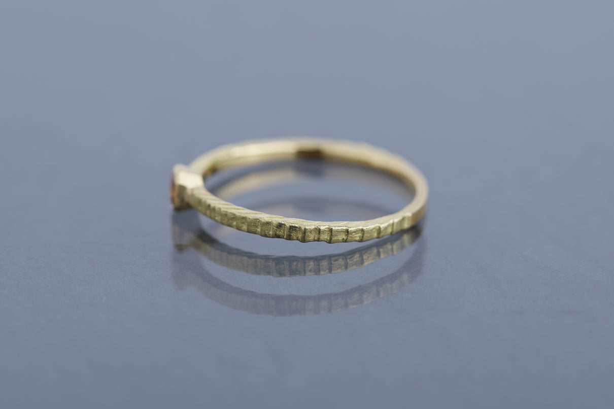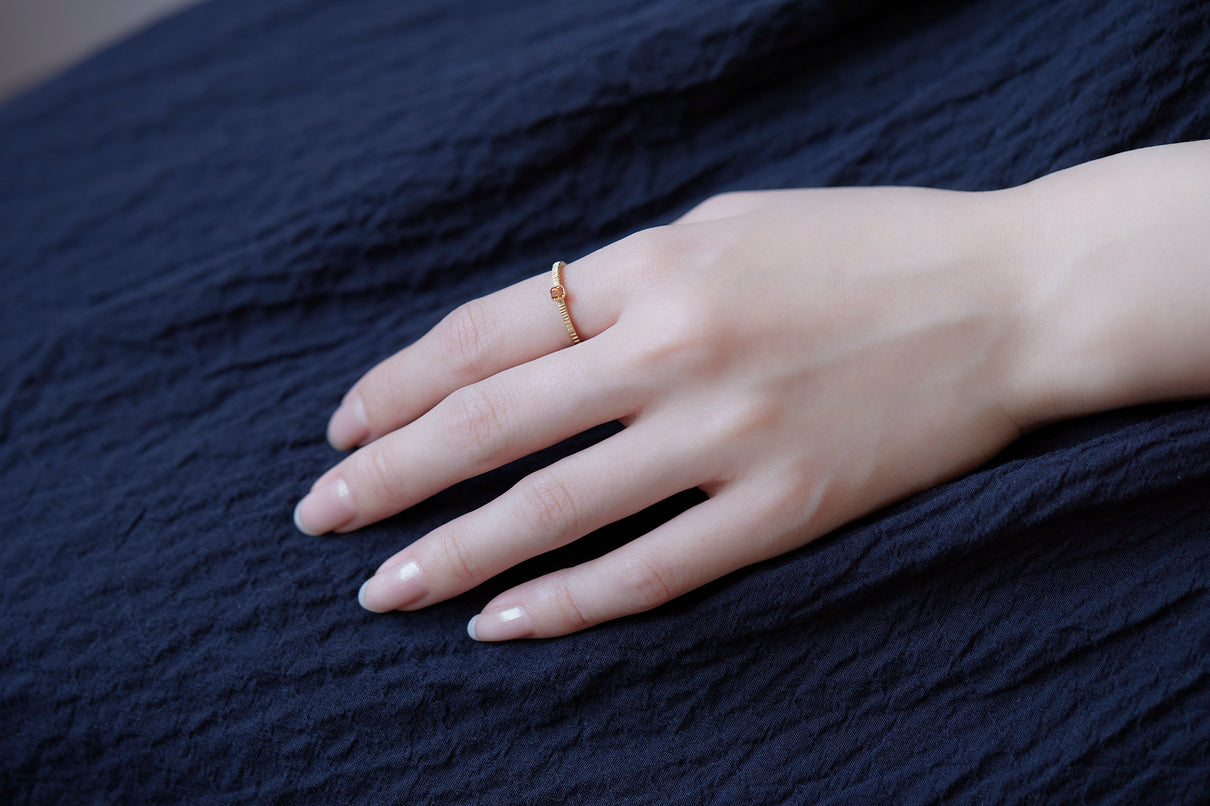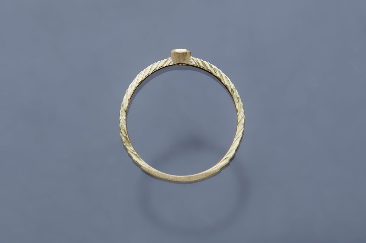 "立ち止まり、目を向ければ 大切なことは 変わらずいつもそこに在る ー" 2023 collection 「Unknown knowns」シリーズのリングベースに、オレンジブラウンのダイヤモンドを留めた一点もののリング。森の中、小さな木の実を見つけた時のような悦びが感じられます。煌めきの強い鮮やかなカラーで小粒ながらも目を惹く存在感がありますが、暖色系のダイヤモンドは肌馴染みが良く、手元のアクセントにぴったり。細身のアームは軽やかな付け心地で、普段使いのリングとしてもおすすめです。
