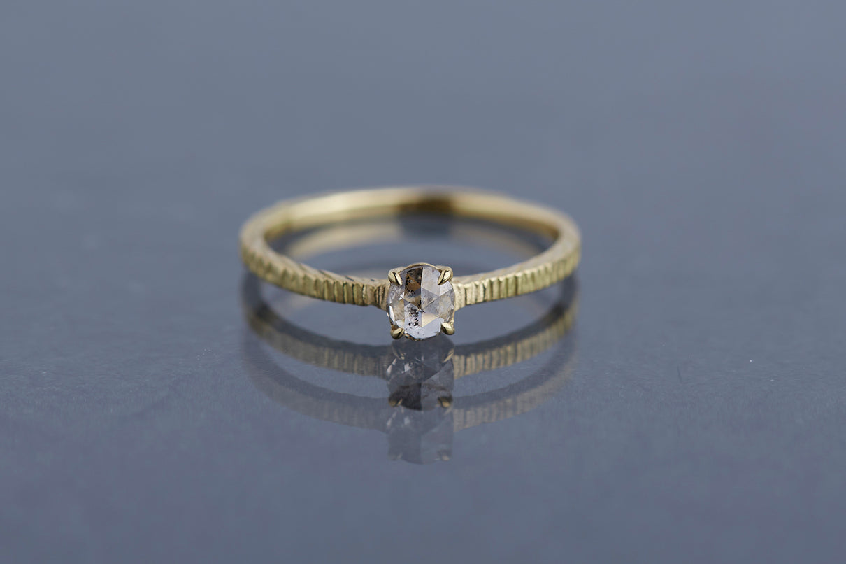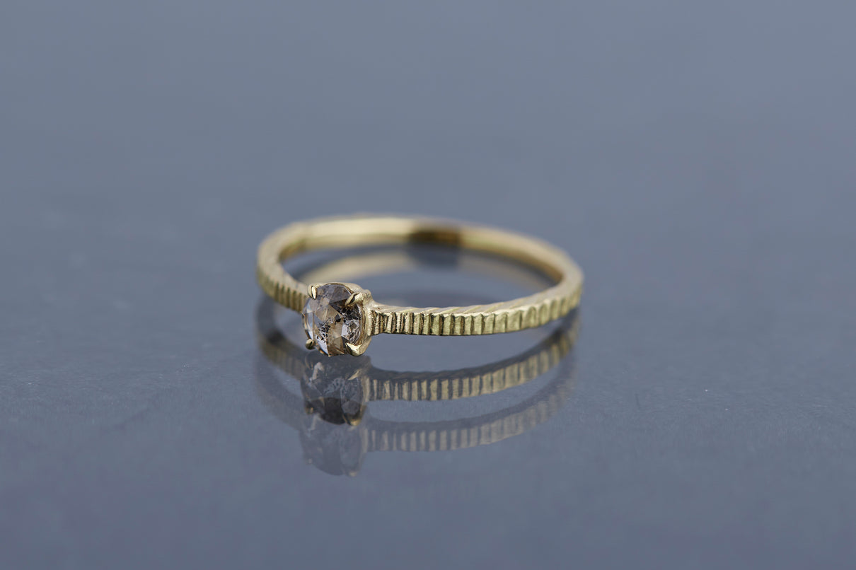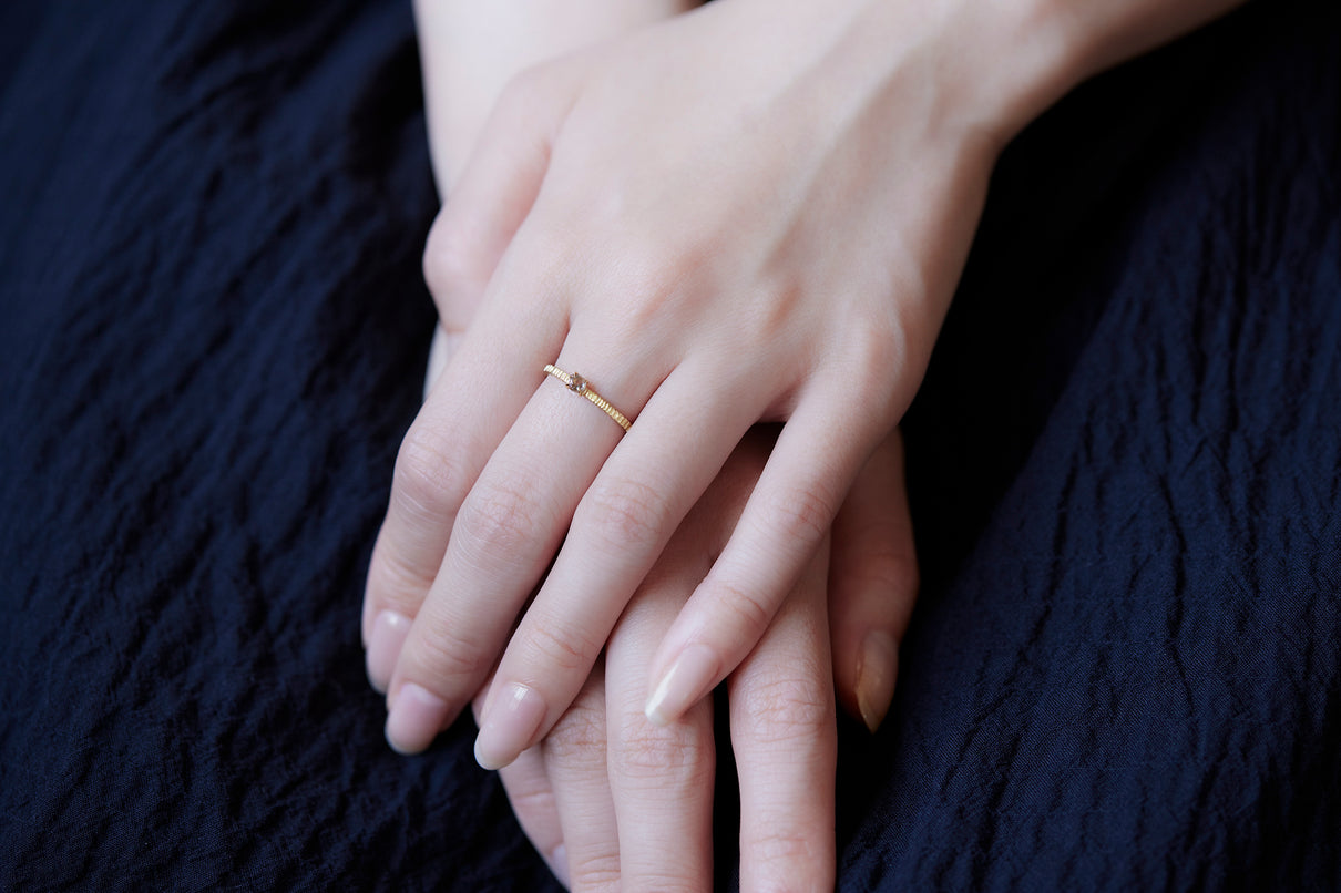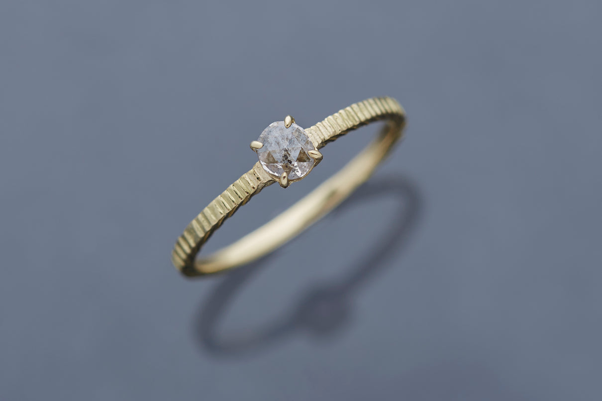"立ち止まり、目を向ければ 大切なことは 変わらずいつもそこに在る ー" 2023 collection 「Unknown knowns」シリーズのリングベースに個性的なローズカットダイヤモンドを留めた一点もののリング。こちらの「ソルト&ペッパーダイヤモンド」と呼ばれるダイヤモンドは、よく見ると塩と胡椒が絶妙に散りばめられたような独特の模様を内包しています。希少性の高さから日本ではまだ流通量が少なく、光を受けて内包物が中で遊び心を持って輝く様子は神秘的で、一点ものならではの独自の存在感を放ちます。細身のアームは軽やかな付け心地で、普段使いのリングとしてもおすすめです。