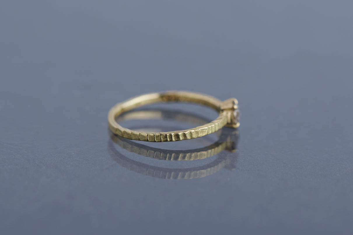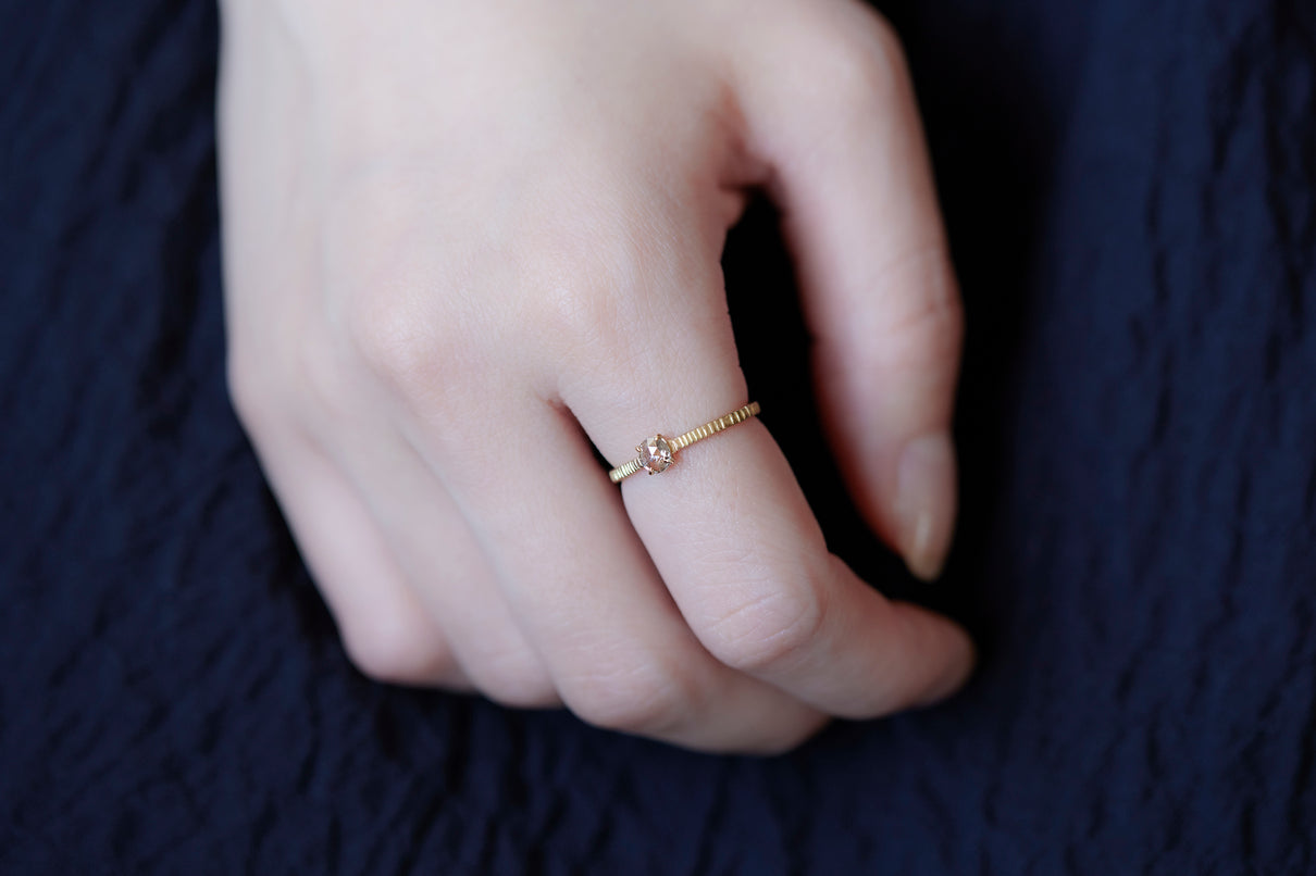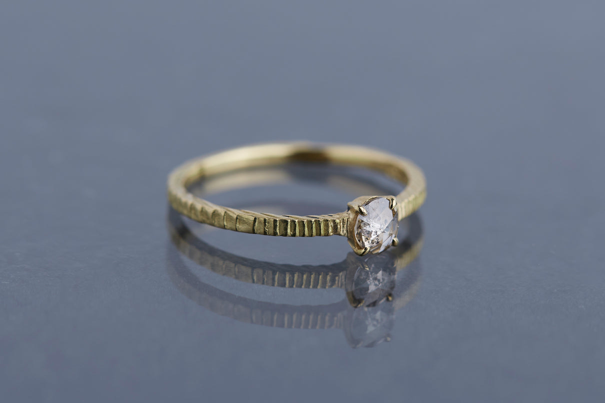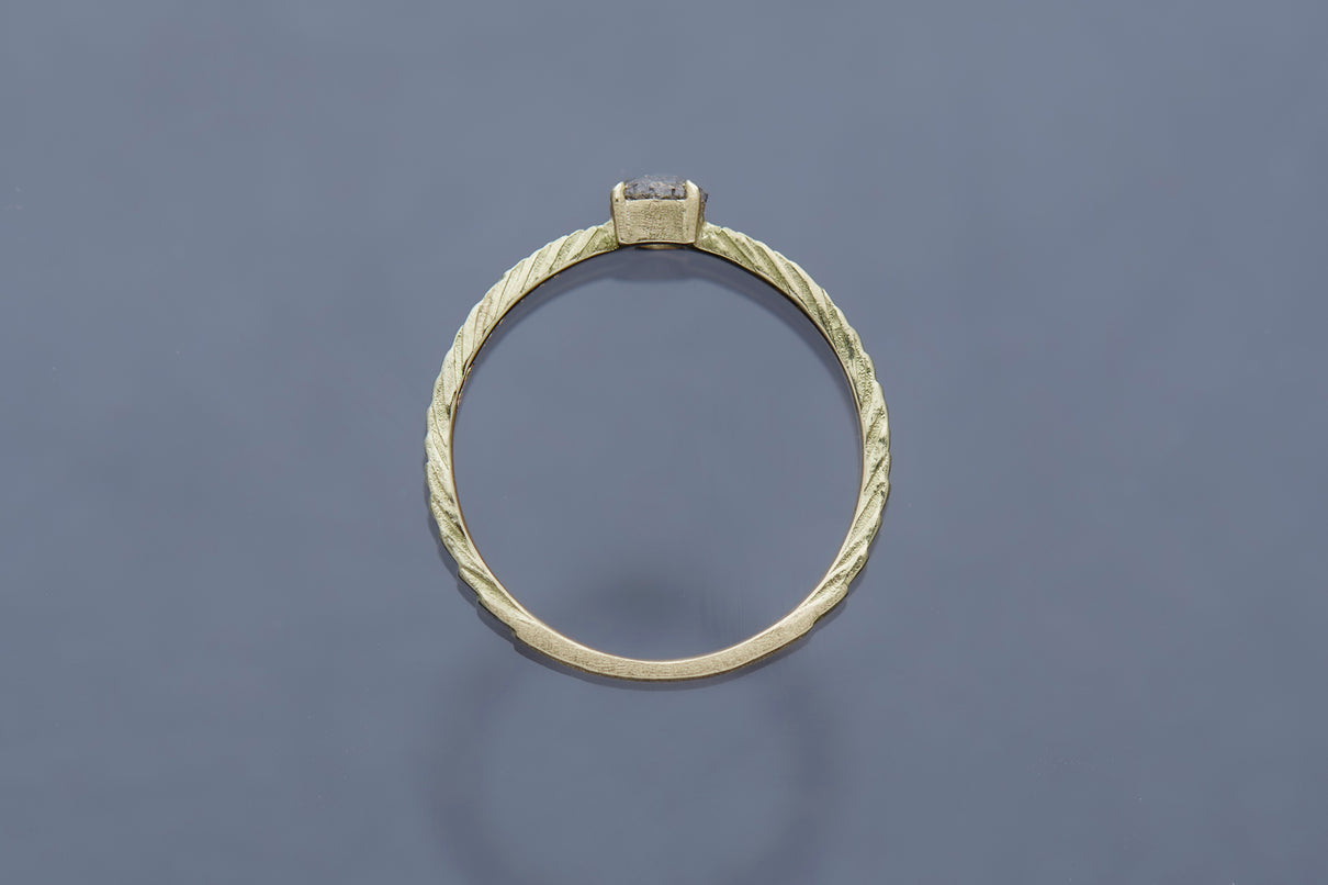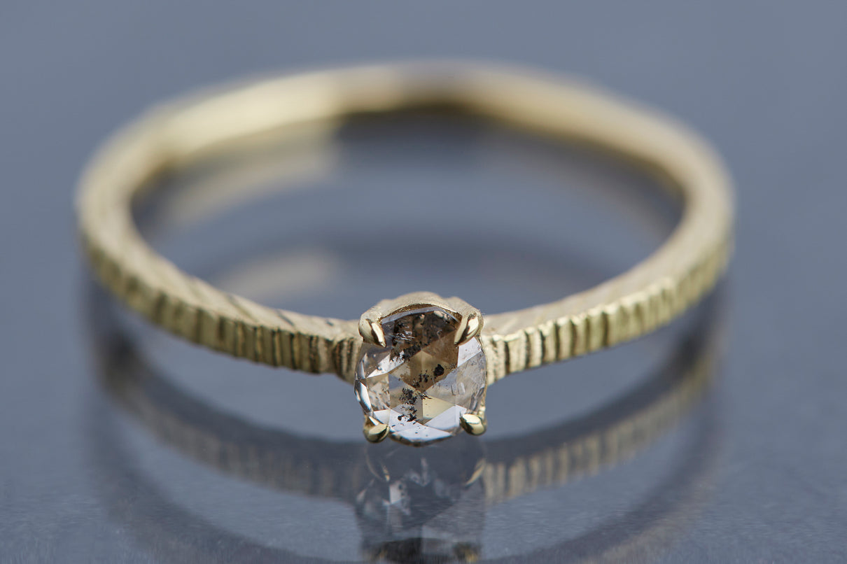 "立ち止まり、目を向ければ 大切なことは 変わらずいつもそこに在る ー" 2023 collection 「Unknown knowns」シリーズのリングベースに個性的なローズカットダイヤモンドを留めた一点もののリング。こちらの「ソルト&ペッパーダイヤモンド」と呼ばれるダイヤモンドは、よく見ると塩と胡椒が絶妙に散りばめられたような独特の模様を内包しています。希少性の高さから日本ではまだ流通量が少なく、光を受けて内包物が中で遊び心を持って輝く様子は神秘的で、一点ものならではの独自の存在感を放ちます。細身のアームは軽やかな付け心地で、普段使いのリングとしてもおすすめです。