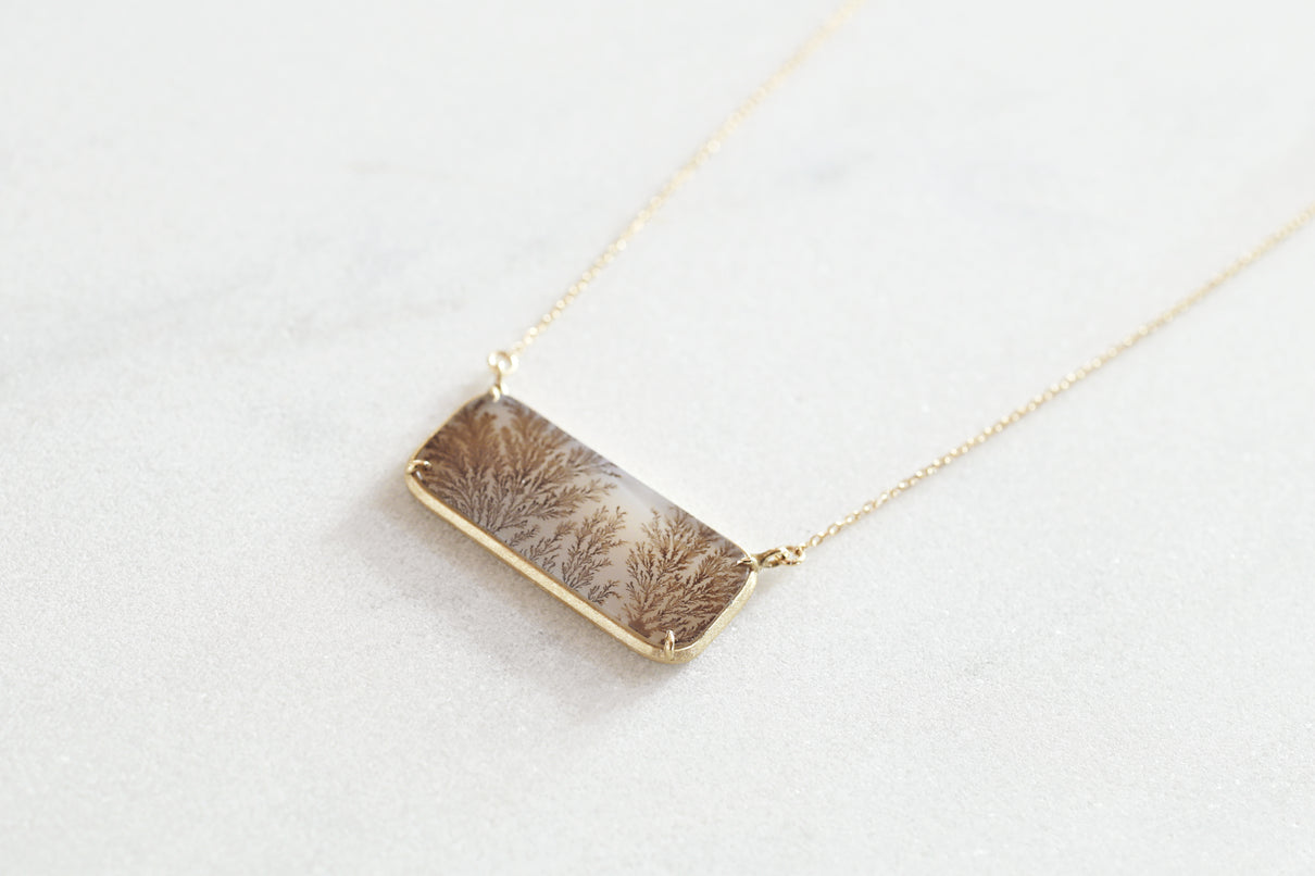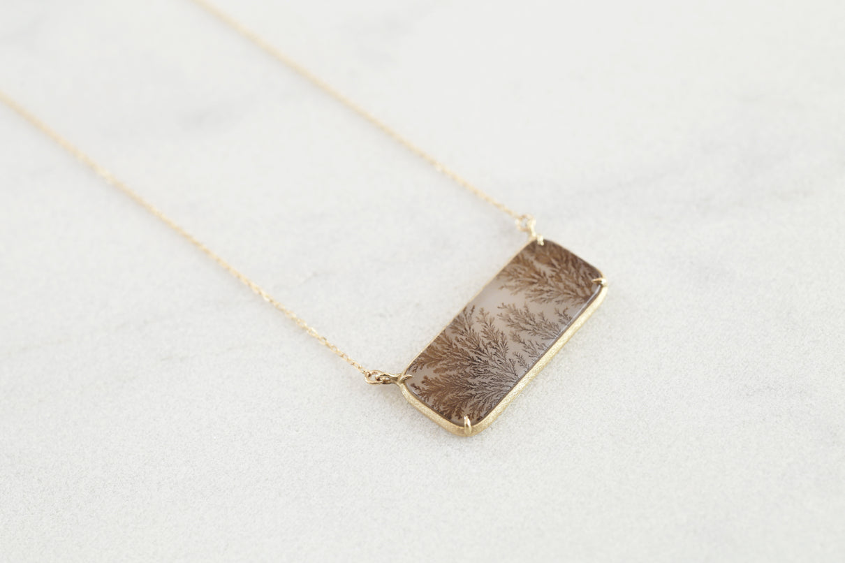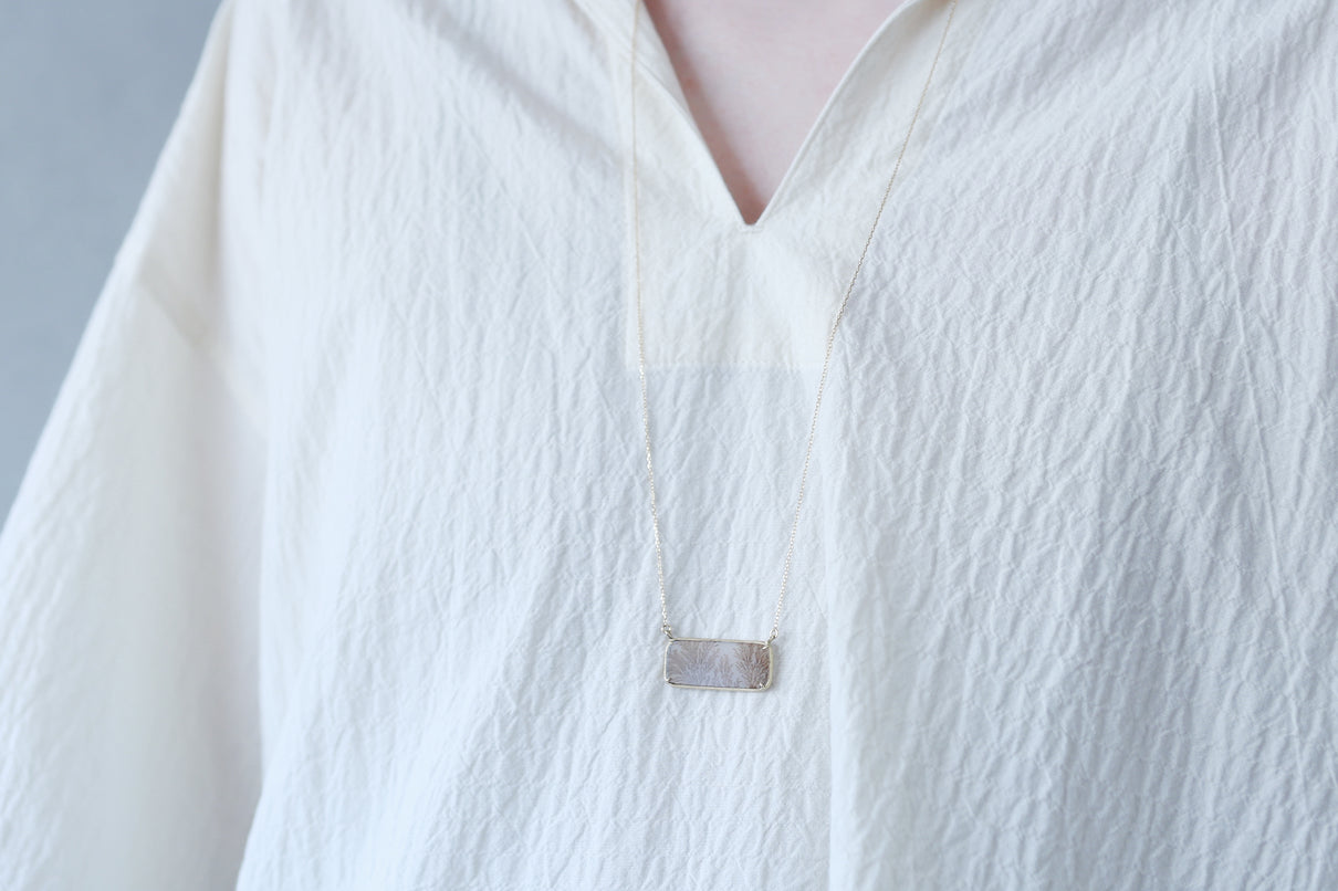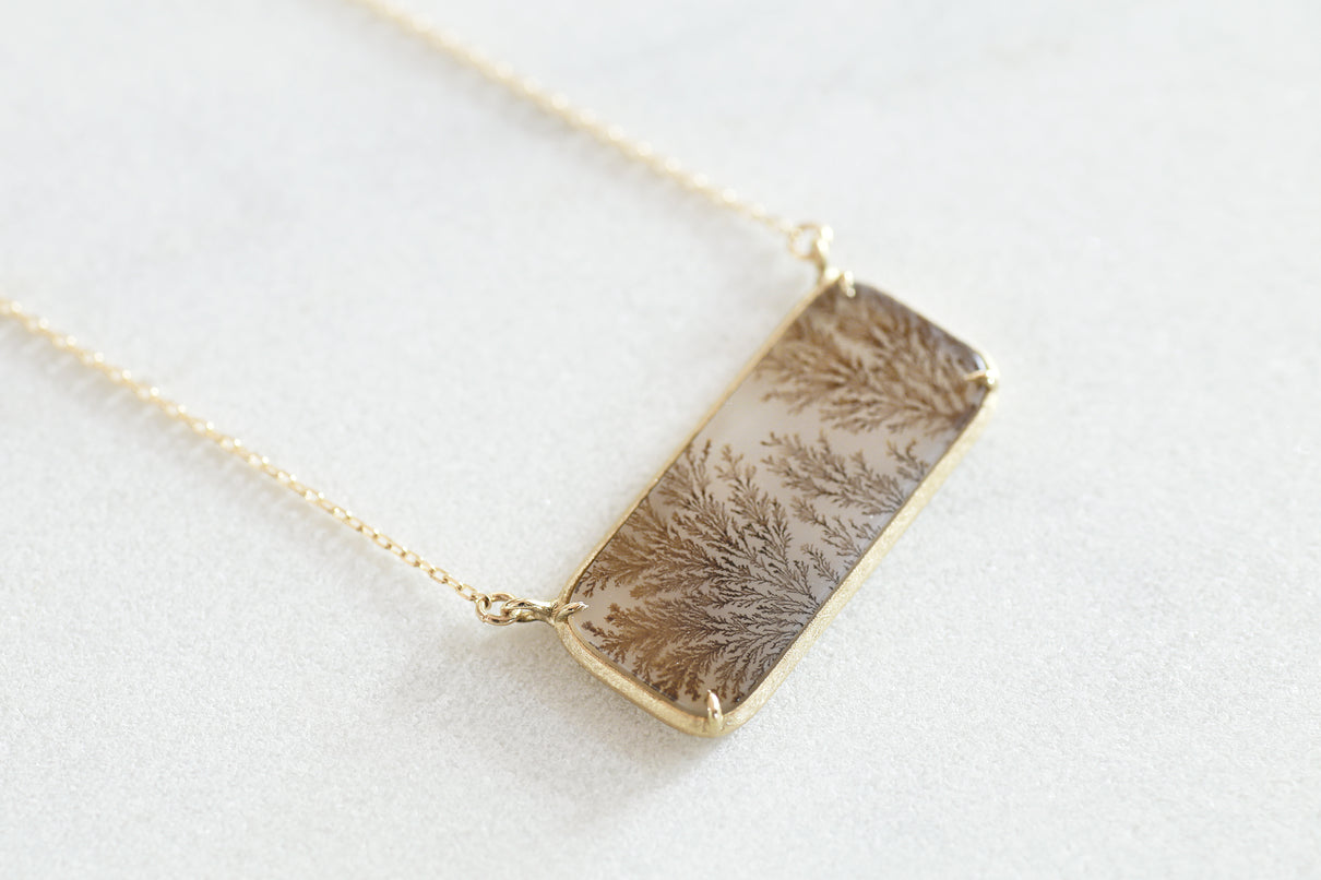 幻想的な美しさを持つデンドリティックアゲートで仕立てたネックレス。デンドリティックアゲートとは、まるで草花や樹木をそのまま石の中に閉じ込めたような緻密なインクルージョンを内包する瑪瑙(メノウ)の一種で、"デンドライト"と呼ばれるこの独特な美しいインクルージョンは、二酸化マンガンや酸化鉄が結晶内に浸透し再結晶化されることによって生まれます。その呼称はギリシャ語の「dendron(樹木)」に由来しており、樹木のエネルギーや生命力を信じる考え方があった古代ギリシャでは、樹木の持つ生命力やエネルギーを秘めた存在として珍重されてきた宝石です。乳白色のレクタングル型の中に浮かび上がる、ブラウンカラーののグラデーションで彩られた繊細な模様が優雅で美しいピースを厳選し、石の魅力を引き立てるようにマットテクスチャーを施したシンプルなデザインで仕立てました。自然が描いたボタニカルアートとも言える、この世に2つと存在しない特別感のあるネックレスです。チェーンは70cmのロングタイプ。装いの色に合わせて、様々な印象でお愉しみいただけます。