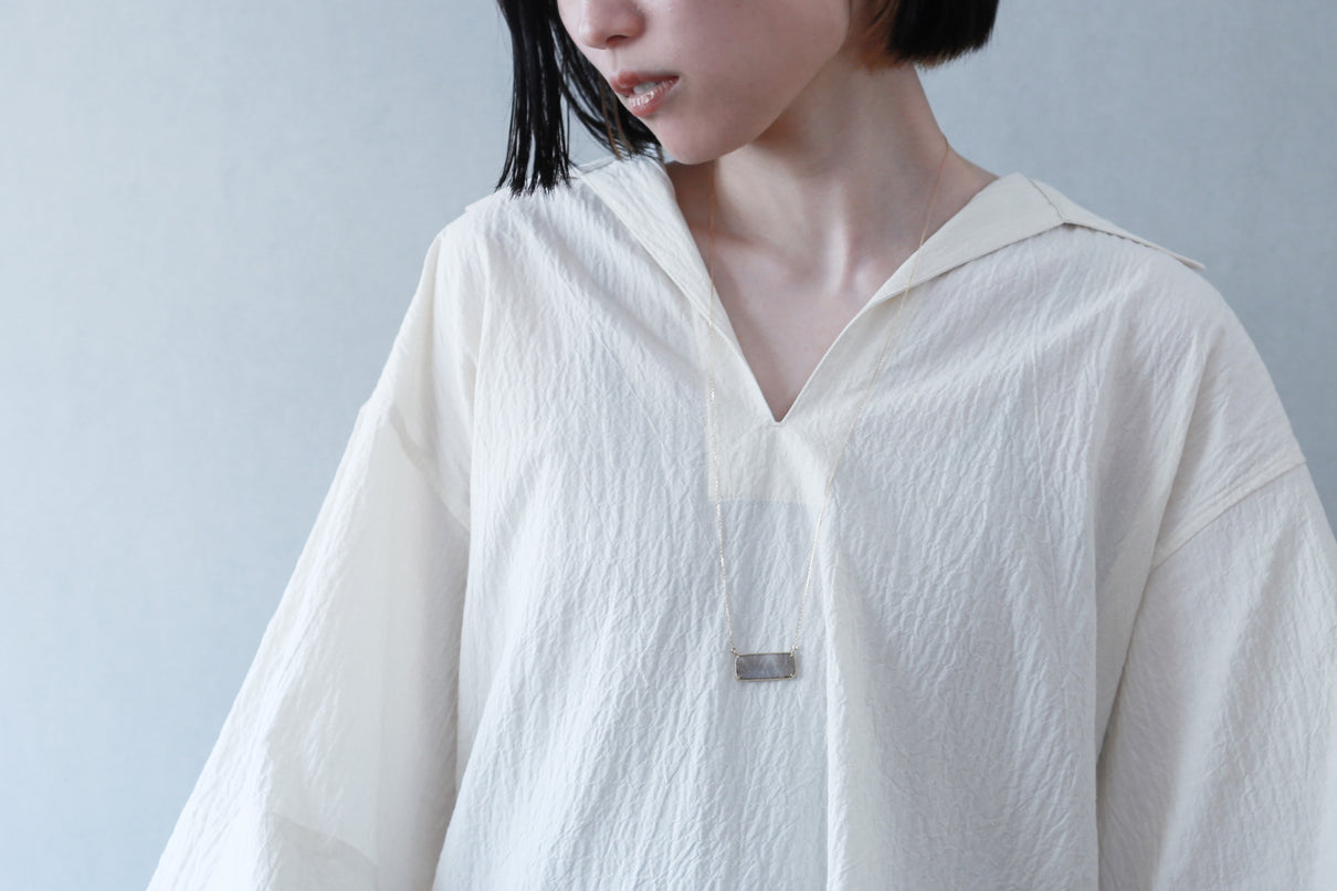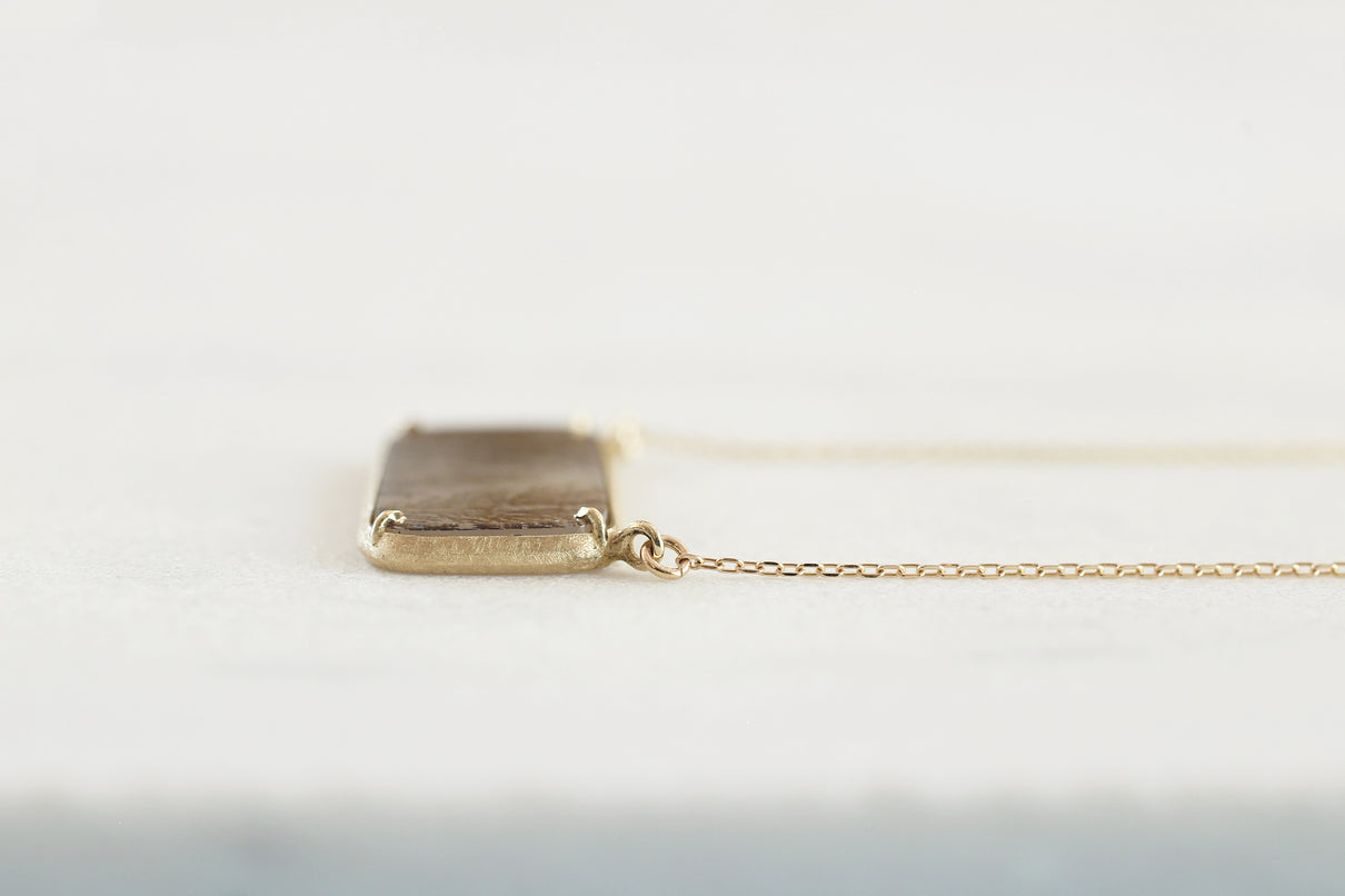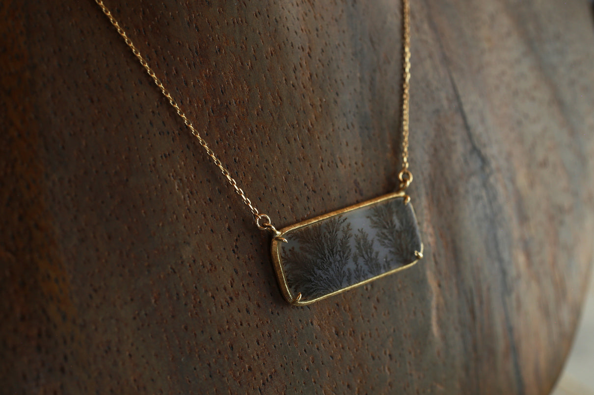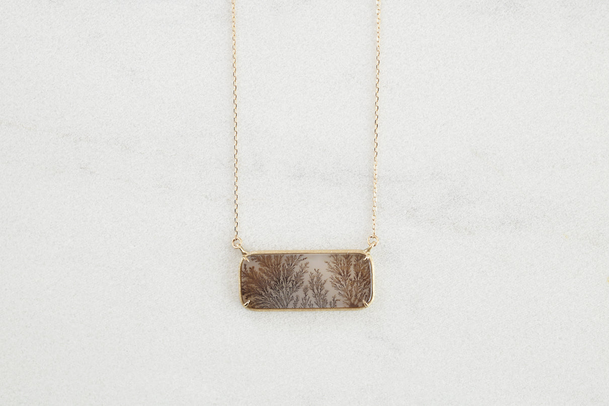 幻想的な美しさを持つデンドリティックアゲートで仕立てたネックレス。デンドリティックアゲートとは、まるで草花や樹木をそのまま石の中に閉じ込めたような緻密なインクルージョンを内包する瑪瑙(メノウ)の一種で、"デンドライト"と呼ばれるこの独特な美しいインクルージョンは、二酸化マンガンや酸化鉄が結晶内に浸透し再結晶化されることによって生まれます。その呼称はギリシャ語の「dendron(樹木)」に由来しており、樹木のエネルギーや生命力を信じる考え方があった古代ギリシャでは、樹木の持つ生命力やエネルギーを秘めた存在として珍重されてきた宝石です。乳白色のレクタングル型の中に浮かび上がる、ブラウンカラーののグラデーションで彩られた繊細な模様が優雅で美しいピースを厳選し、石の魅力を引き立てるようにマットテクスチャーを施したシンプルなデザインで仕立てました。自然が描いたボタニカルアートとも言える、この世に2つと存在しない特別感のあるネックレスです。チェーンは70cmのロングタイプ。装いの色に合わせて、様々な印象でお愉しみいただけます。