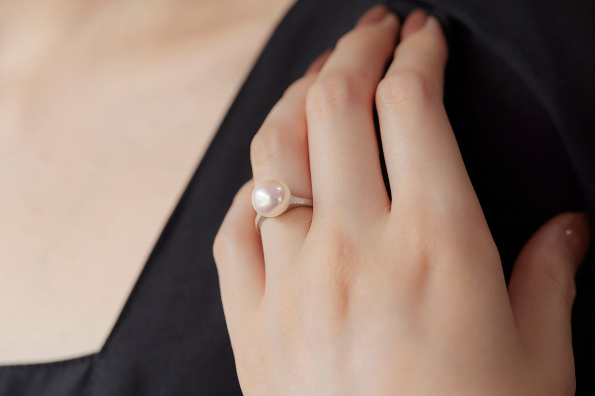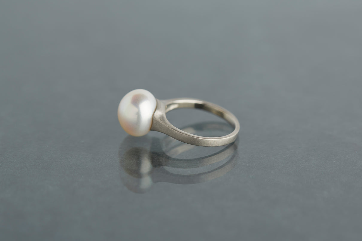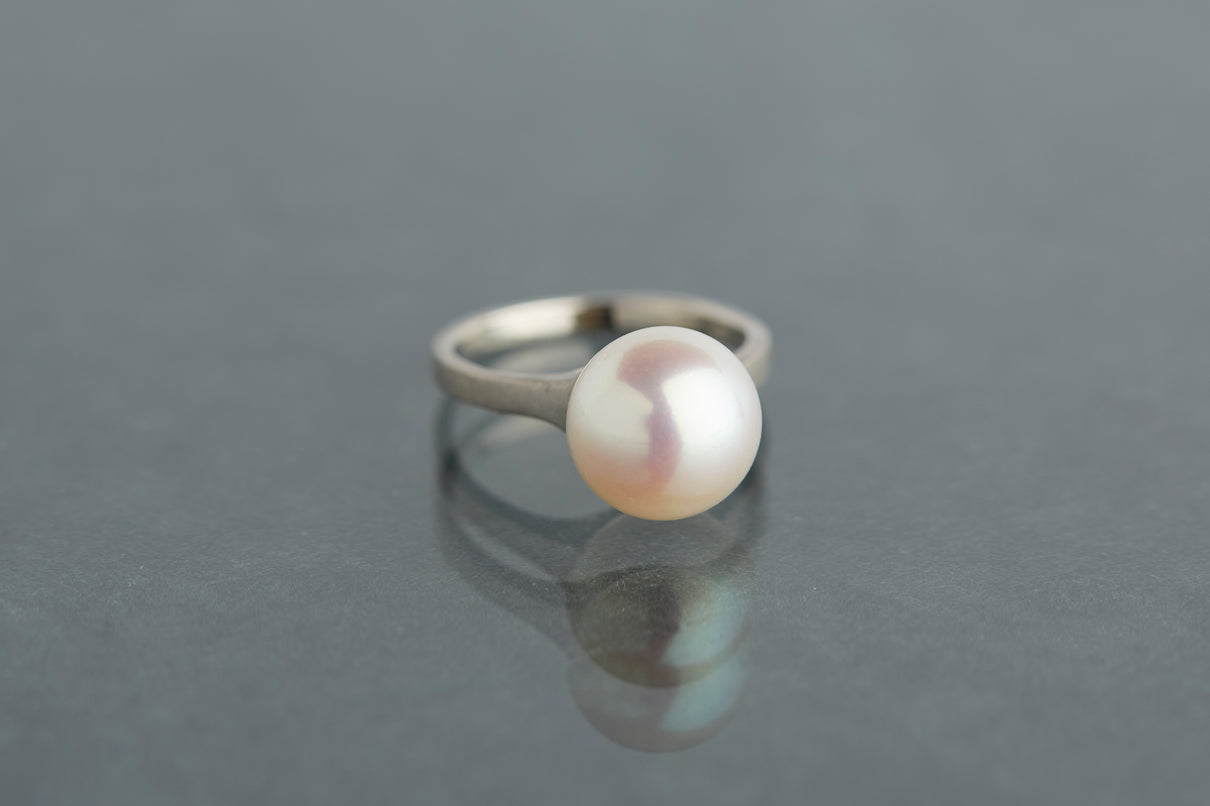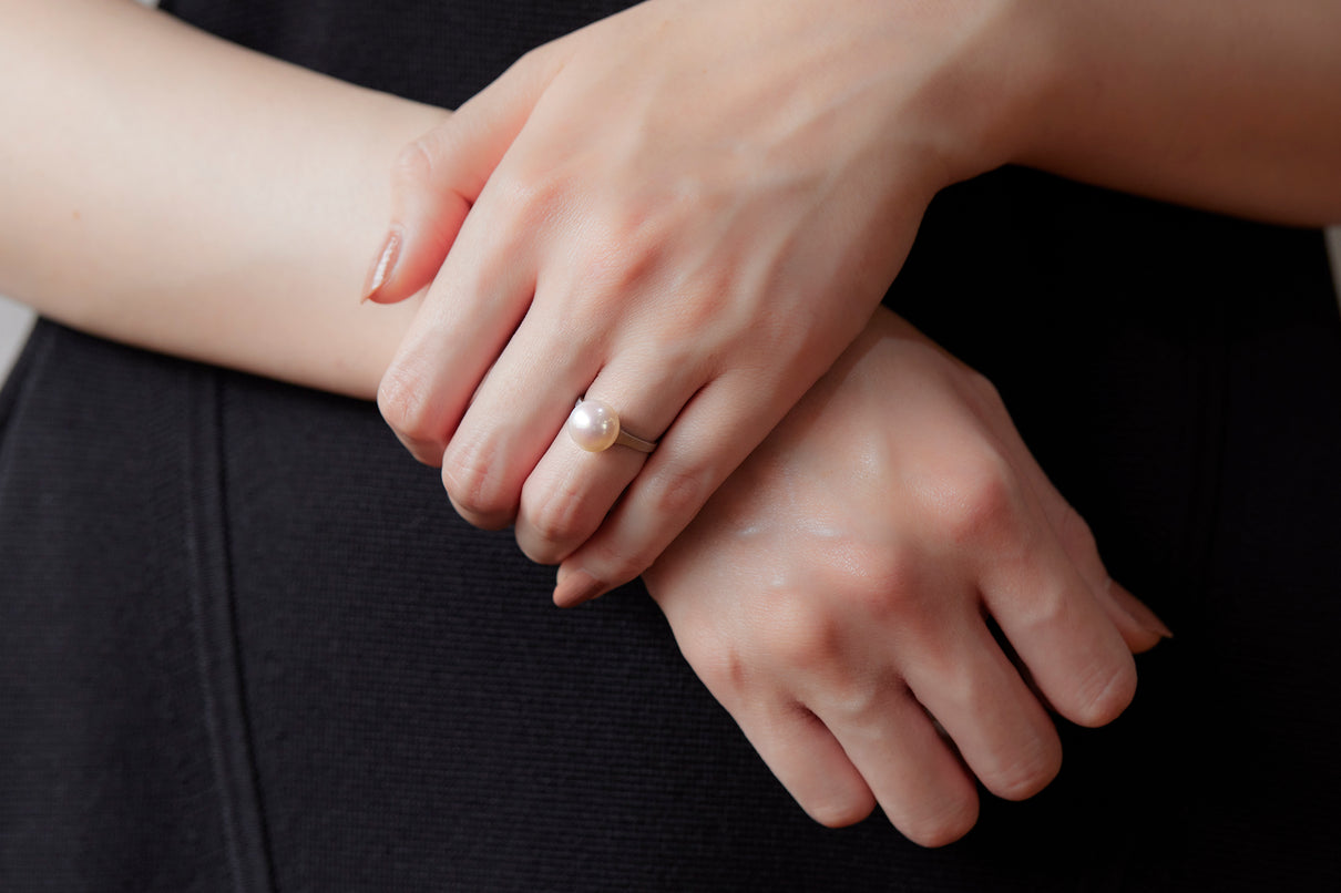まん丸ではない、少しつぶれた形が愛らしいホワイトパールをあしらったシンプルなリング。すっきりとしたフォルムで、マットなテクスチャーが施されたアームに、艶めく上質なパールが映えます。僅かにピンクを感じるホワイトパールはスタンダードで美しく、どんなシーンにもマッチする為、フォーマルな装いはもちろん、日常使いとしても活躍する1点もののアイテムです。