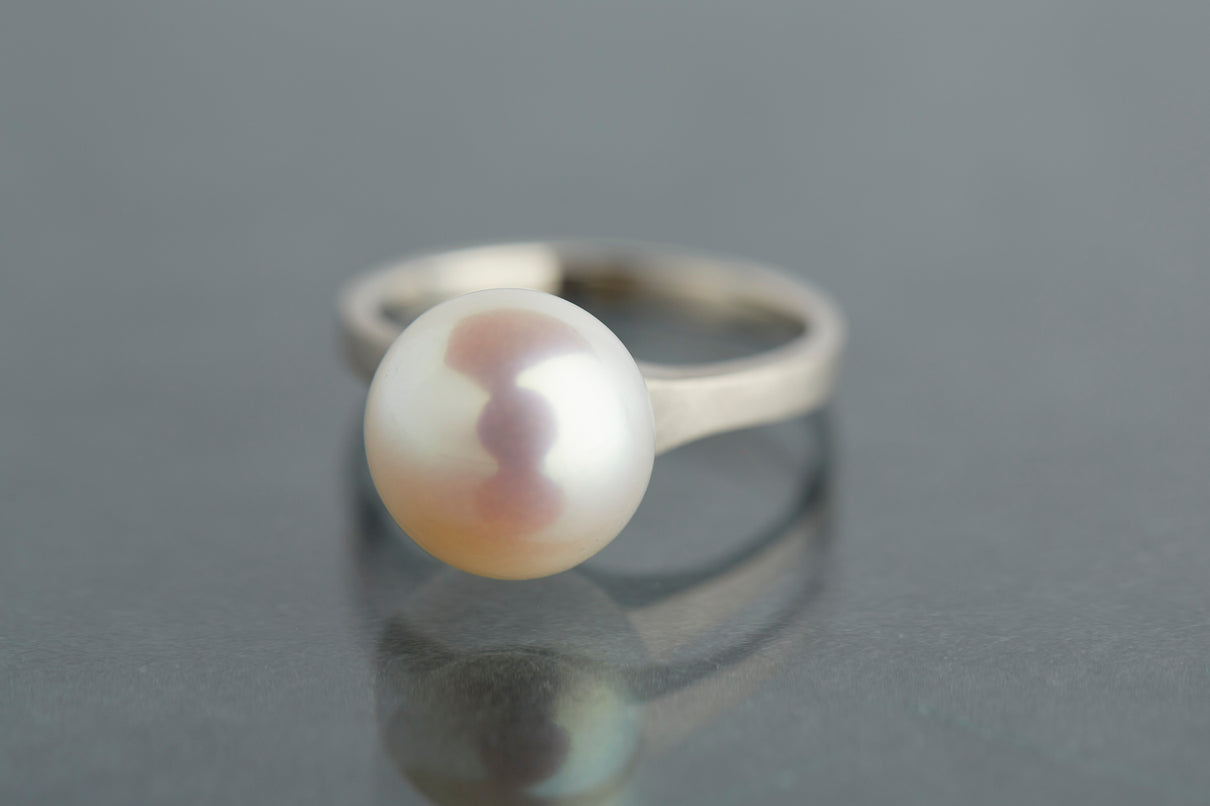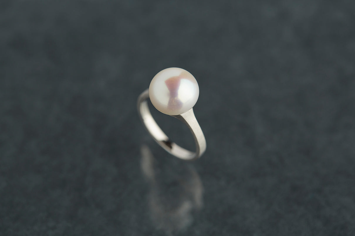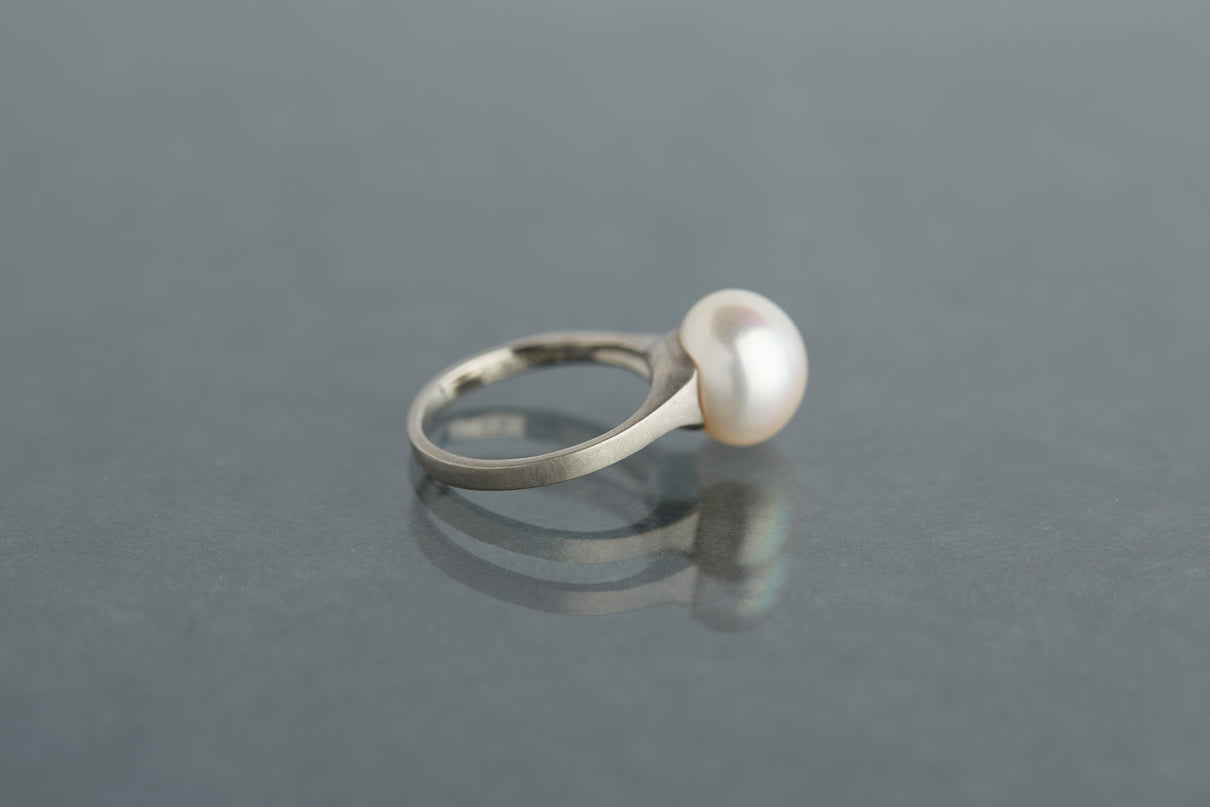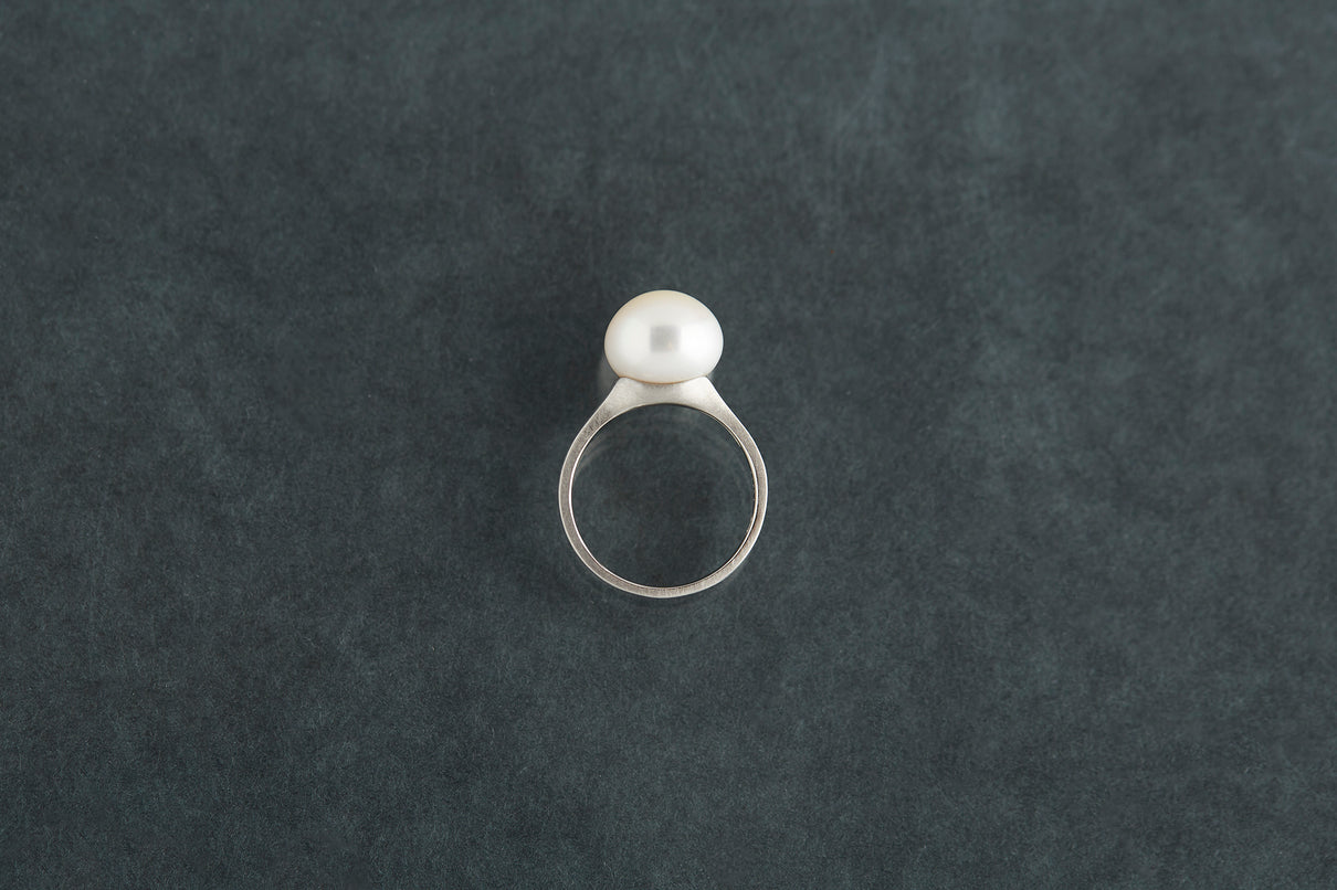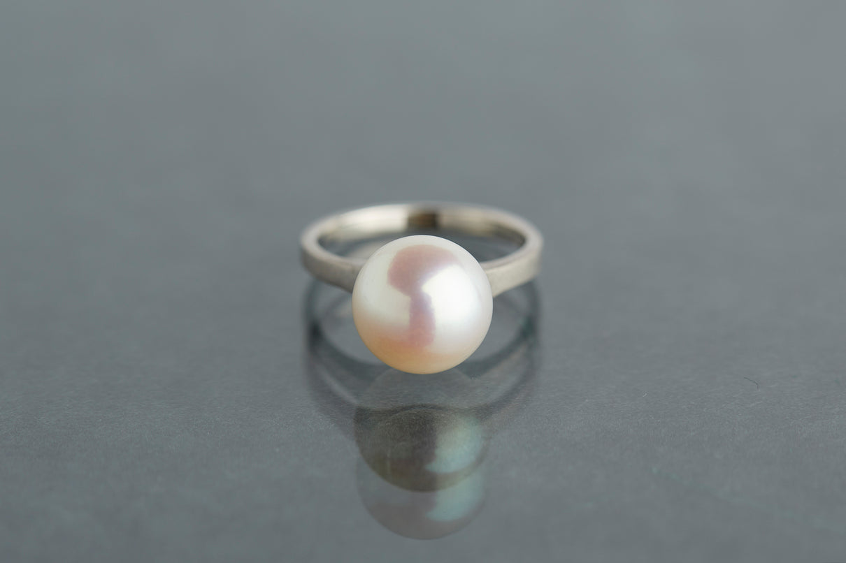 まん丸ではない、少しつぶれた形が愛らしいホワイトパールをあしらったシンプルなリング。すっきりとしたフォルムで、マットなテクスチャーが施されたアームに、艶めく上質なパールが映えます。僅かにピンクを感じるホワイトパールはスタンダードで美しく、どんなシーンにもマッチする為、フォーマルな装いはもちろん、日常使いとしても活躍する1点もののアイテムです。
