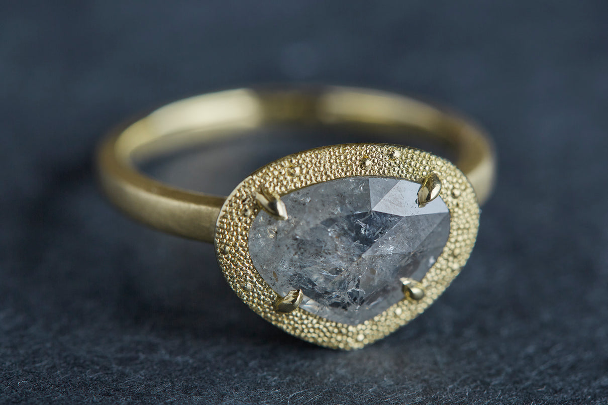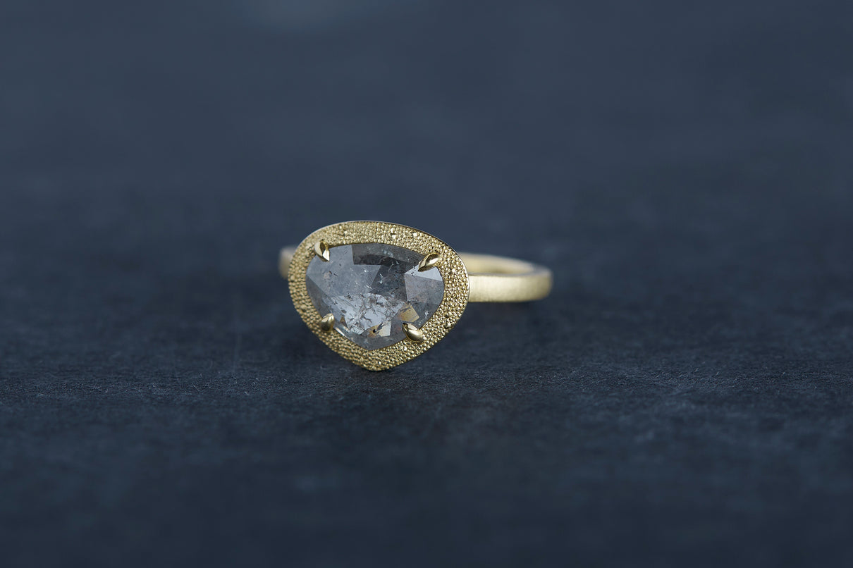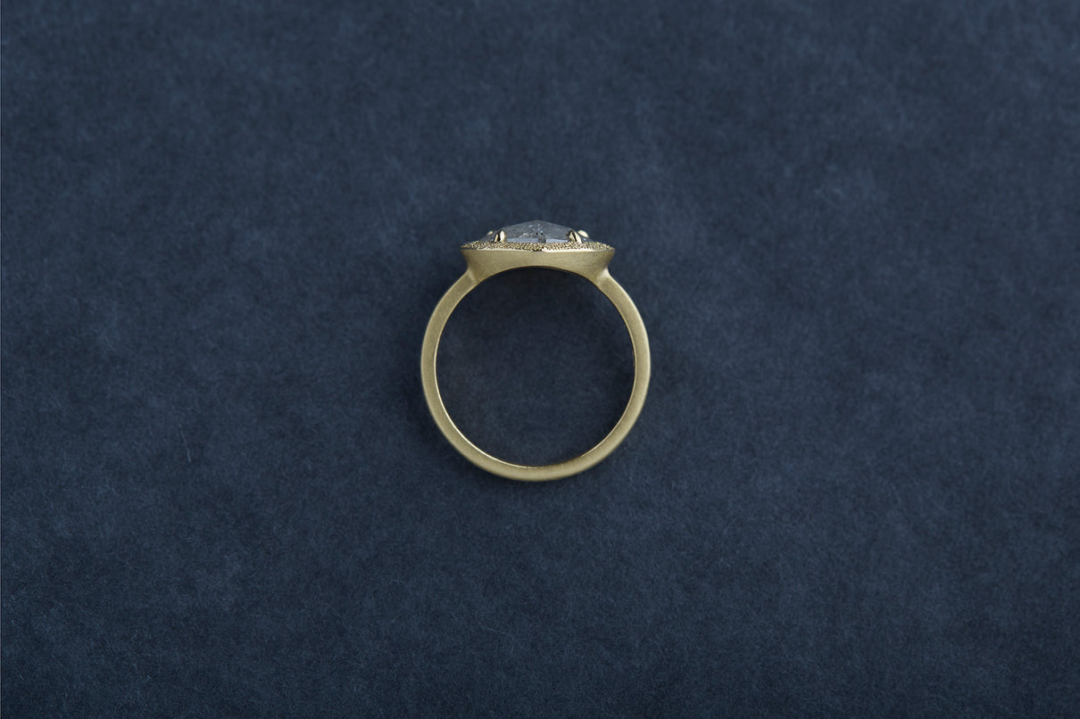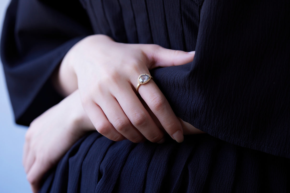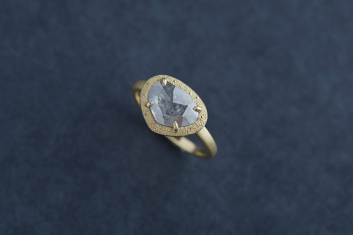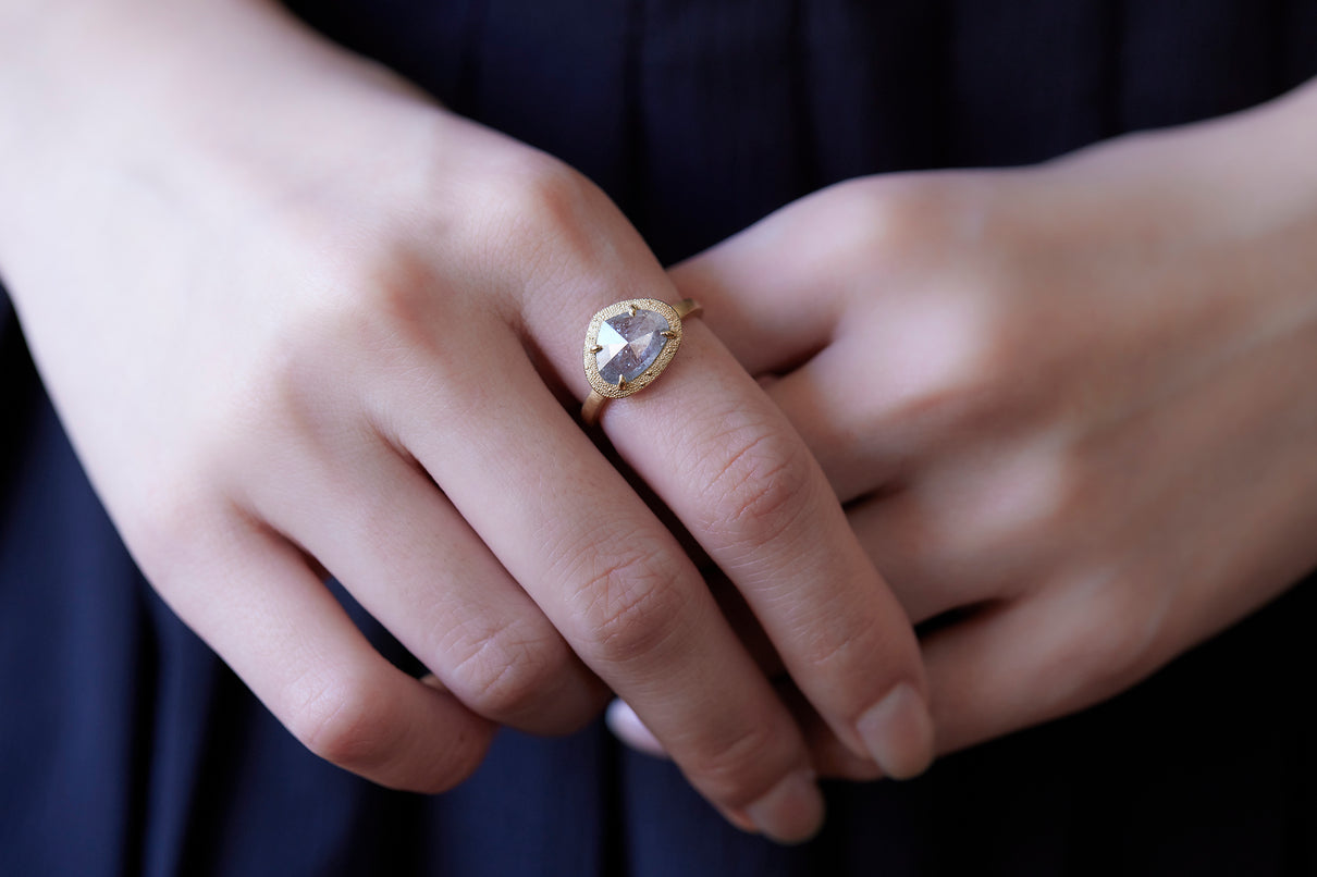 1.7ctもの存在感の有るローズカットダイヤモンドをクラシックなデザインで仕立てた、K18イエローゴールドリング。透明と不透明が美しく混ざり合う奥深いインクルージョンを持ち、壮大なスケール感を感じさせるギャラクシーダイヤモンドは、その名の通り宇宙の銀河を連想させる佇まいです。石座には大小様々なミルグレインを無数に施し、手仕事ならではの温もりが感じられる表情に仕上げました。シンプルながら唯一無二の個性を放つ、魅力溢れるリングです。