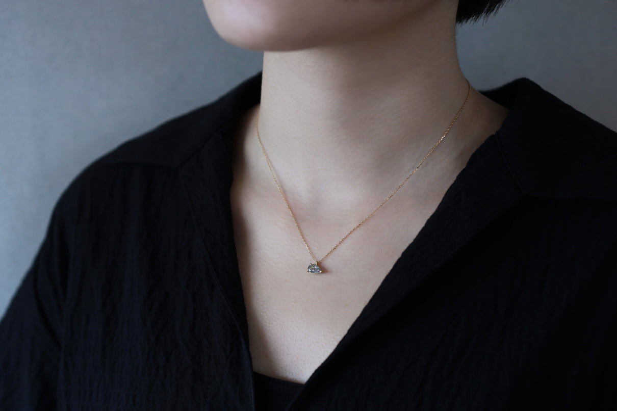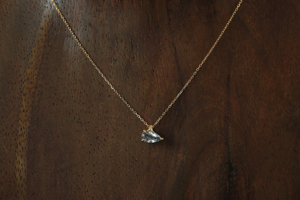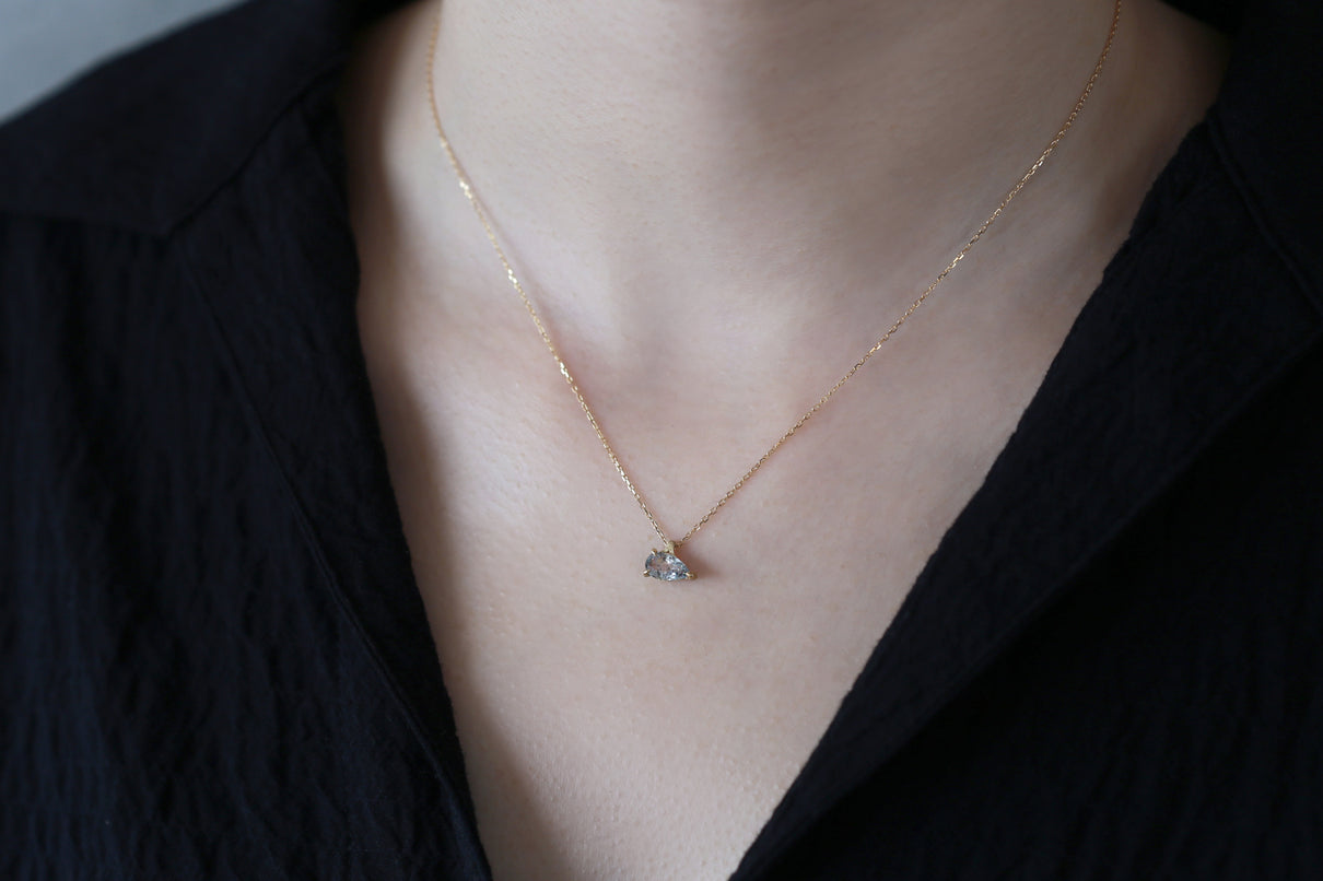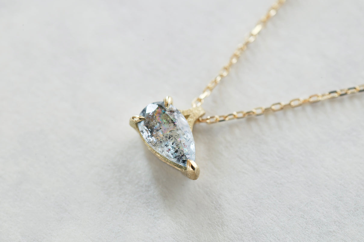 滴り落ちる水のようなアクアマリンに、太陽の眩しい輝きを連想させる複雑な煌めきを放つインクルージョンが美しい、一点もののネックレス。アクアマリンにチタン鉄鉱と呼ばれる液膜状の内包物が閉じ込められて生まれた希少な天然石で、角度を変えて見ると、アクアマリンらしいブルーカラーの中に、虹色の煌めきがはっきりと見られます。左右アシンメトリーになる横向きのデザインで、小粒ながらも個性が映えるアイテム。3月の誕生石としても親しまれているアクアマリンは、3月生まれの方の特別なお守りとして贈りものにも最適なアイテムです。