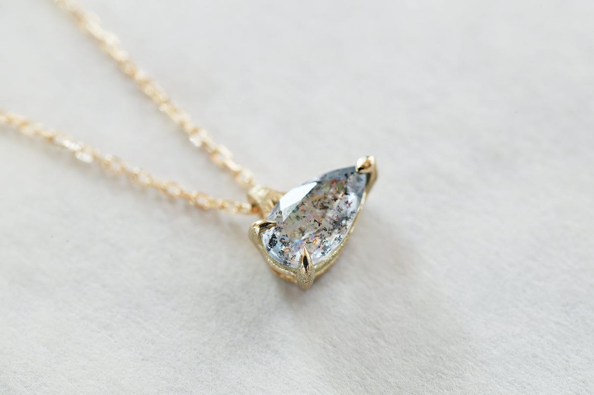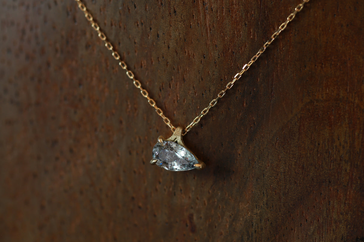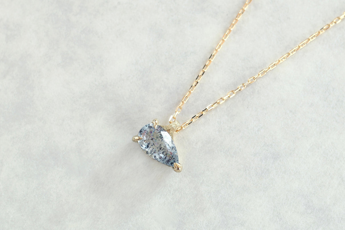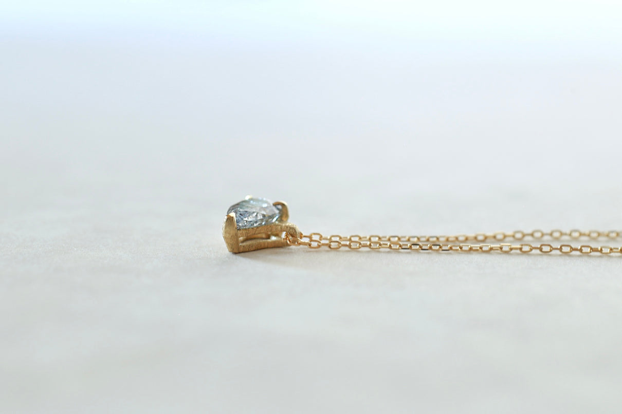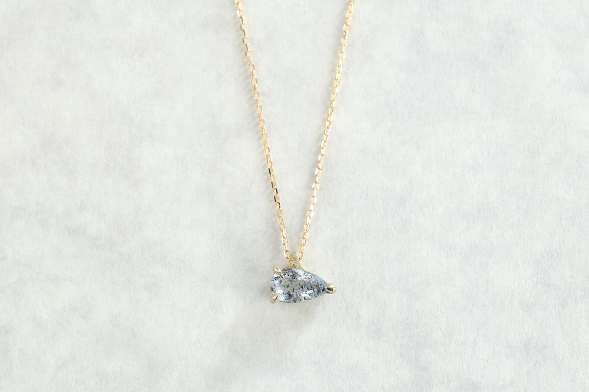 滴り落ちる水のようなアクアマリンに、太陽の眩しい輝きを連想させる複雑な煌めきを放つインクルージョンが美しい、一点もののネックレス。アクアマリンにチタン鉄鉱と呼ばれる液膜状の内包物が閉じ込められて生まれた希少な天然石で、角度を変えて見ると、アクアマリンらしいブルーカラーの中に、虹色の煌めきがはっきりと見られます。左右アシンメトリーになる横向きのデザインで、小粒ながらも個性が映えるアイテム。3月の誕生石としても親しまれているアクアマリンは、3月生まれの方の特別なお守りとして贈りものにも最適なアイテムです。