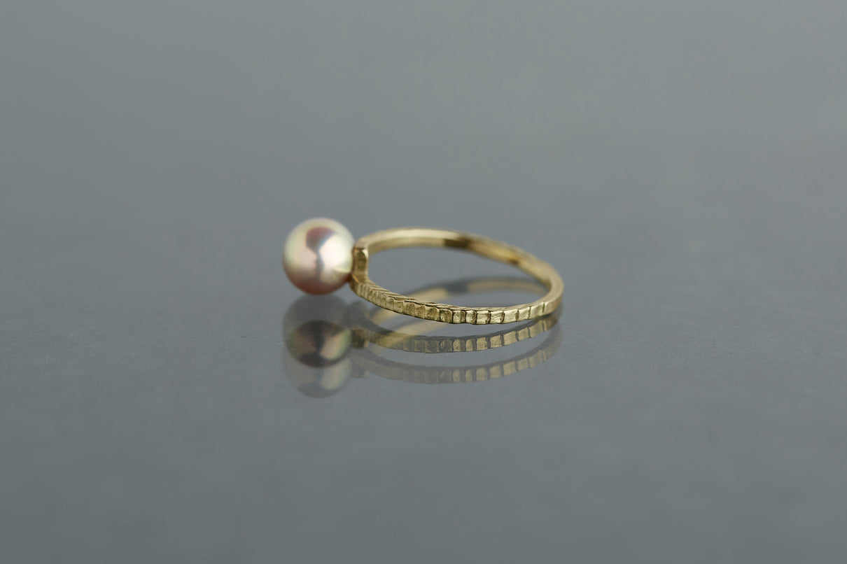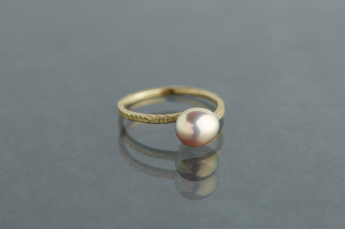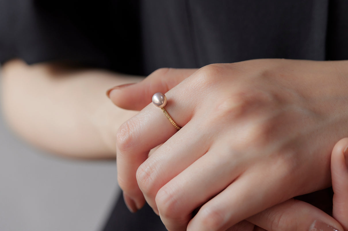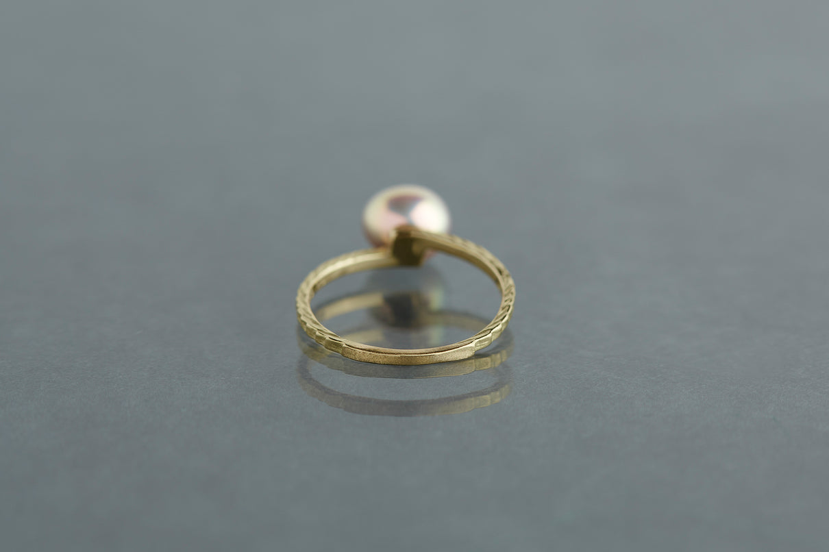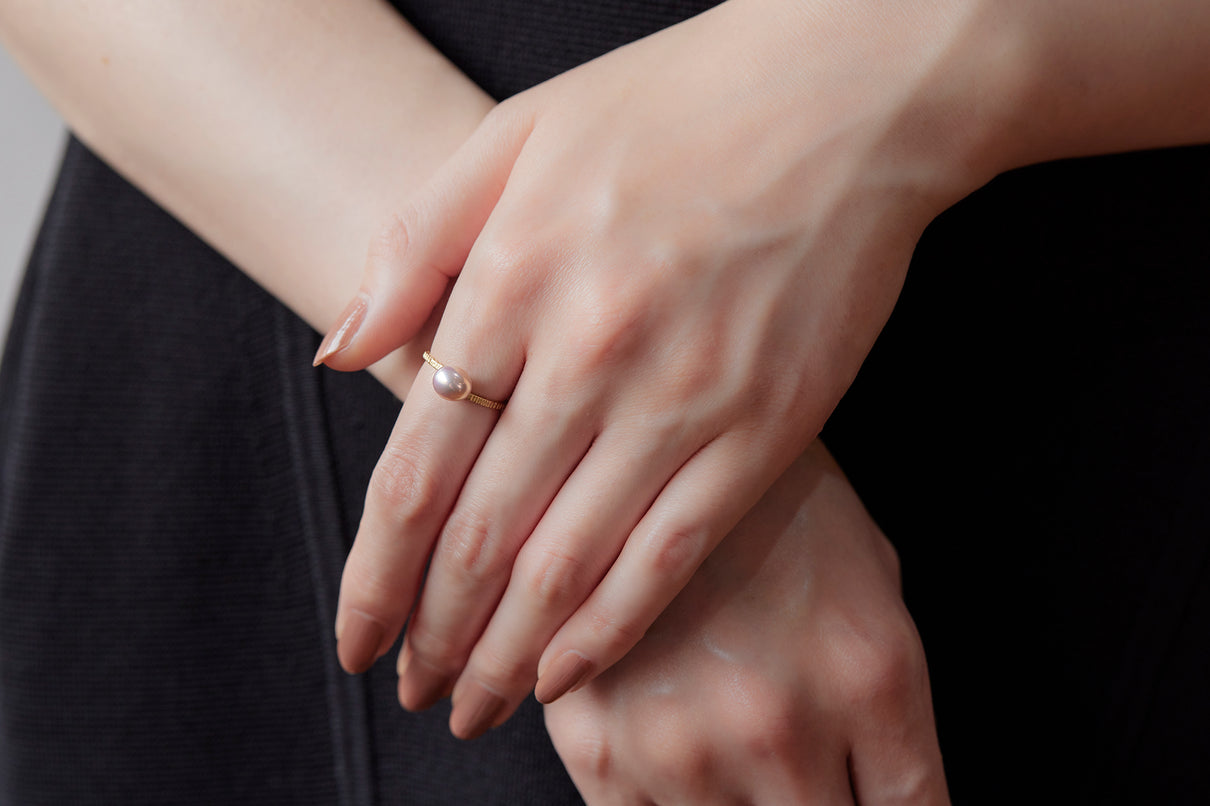 "立ち止まり、目を向ければ 大切なことは 変わらずいつもそこに在る ー" 2023 collection 「Unknown knowns」シリーズのリングベースに、淡水パールの中でも数万個にひとつしか産出されない、希少なメタリックパールを留めた一点もののリング。豊かな自然が育んだたおやかなフォルムのパールは、玉虫色のような奥深い色味が美しく輝き、強い照りが思わず目を惹きます。僅かに左右のアームがずれたデザインで、シンプルながらもひと匙の個性を感じます。ひとつでも重ね付けにも活躍するパールリングです。