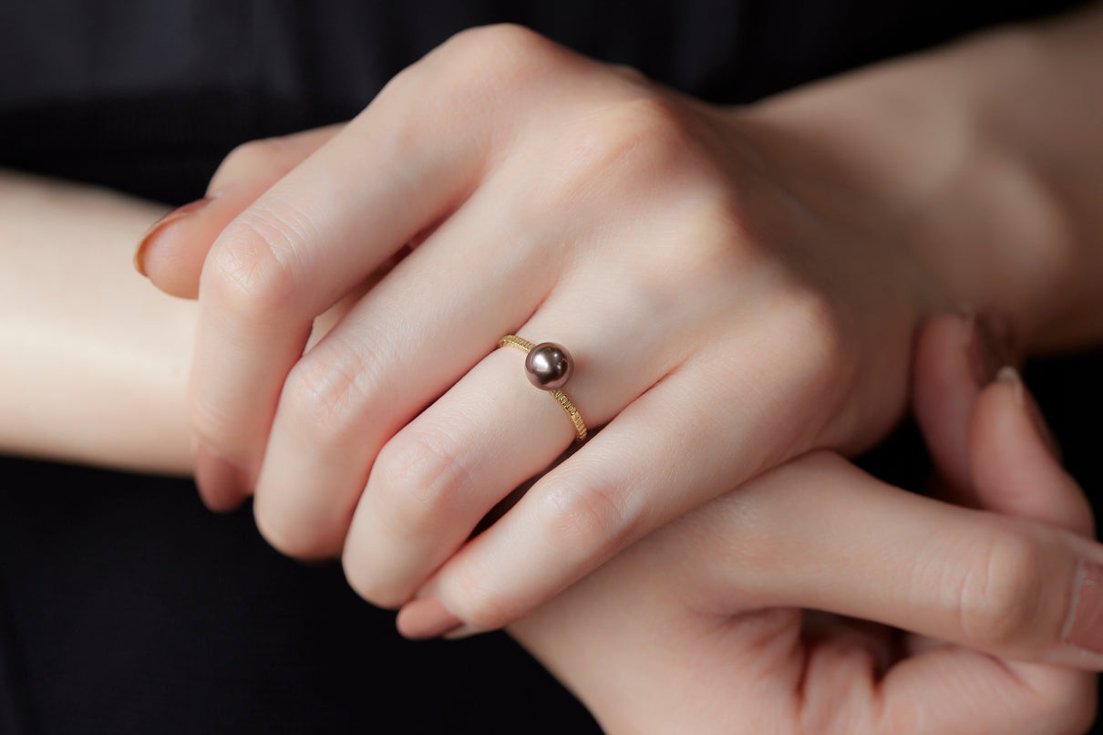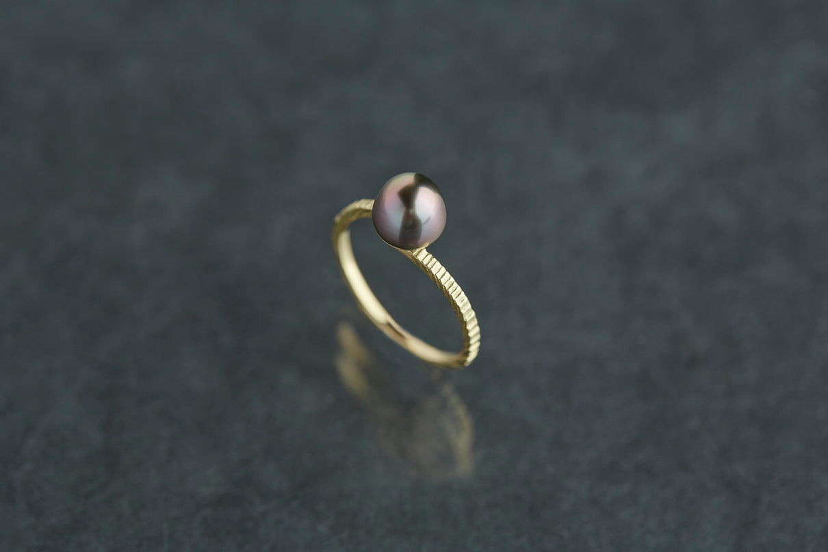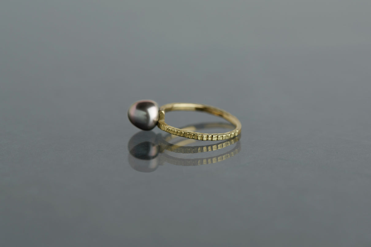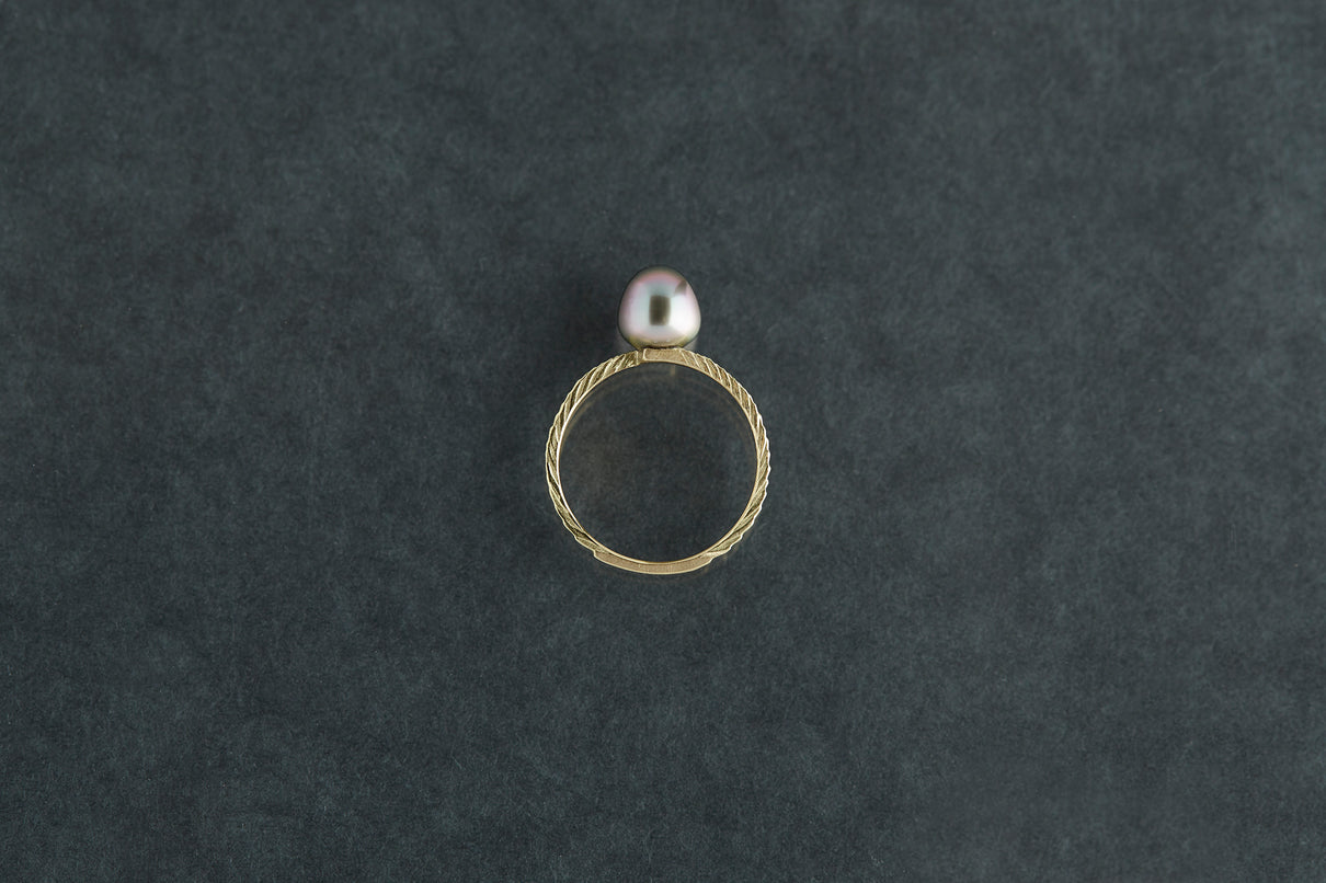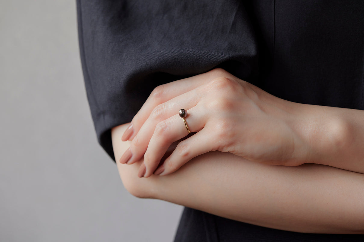 "立ち止まり、目を向ければ 大切なことは 変わらずいつもそこに在る ー" 2023 collection 「Unknown knowns」シリーズのリングベースに、、柔らかな台形をしたタヒチパールを留めた一点もののリング。孔雀の羽のように、グレーの中にグリーンやブルーの複雑な色味をもつパールは、マゼンタのテリが美しく艶めき、より奥深い表情を見せてくれます。僅かに左右のアームがずれたデザインで、シンプルながらもひと匙の個性を感じます。ひとつでも重ね付けにも活躍するパールリングです。
