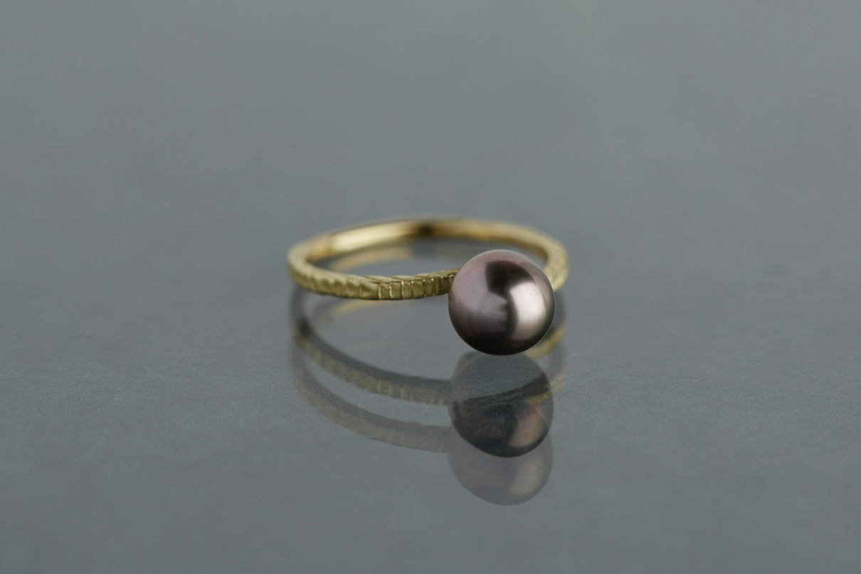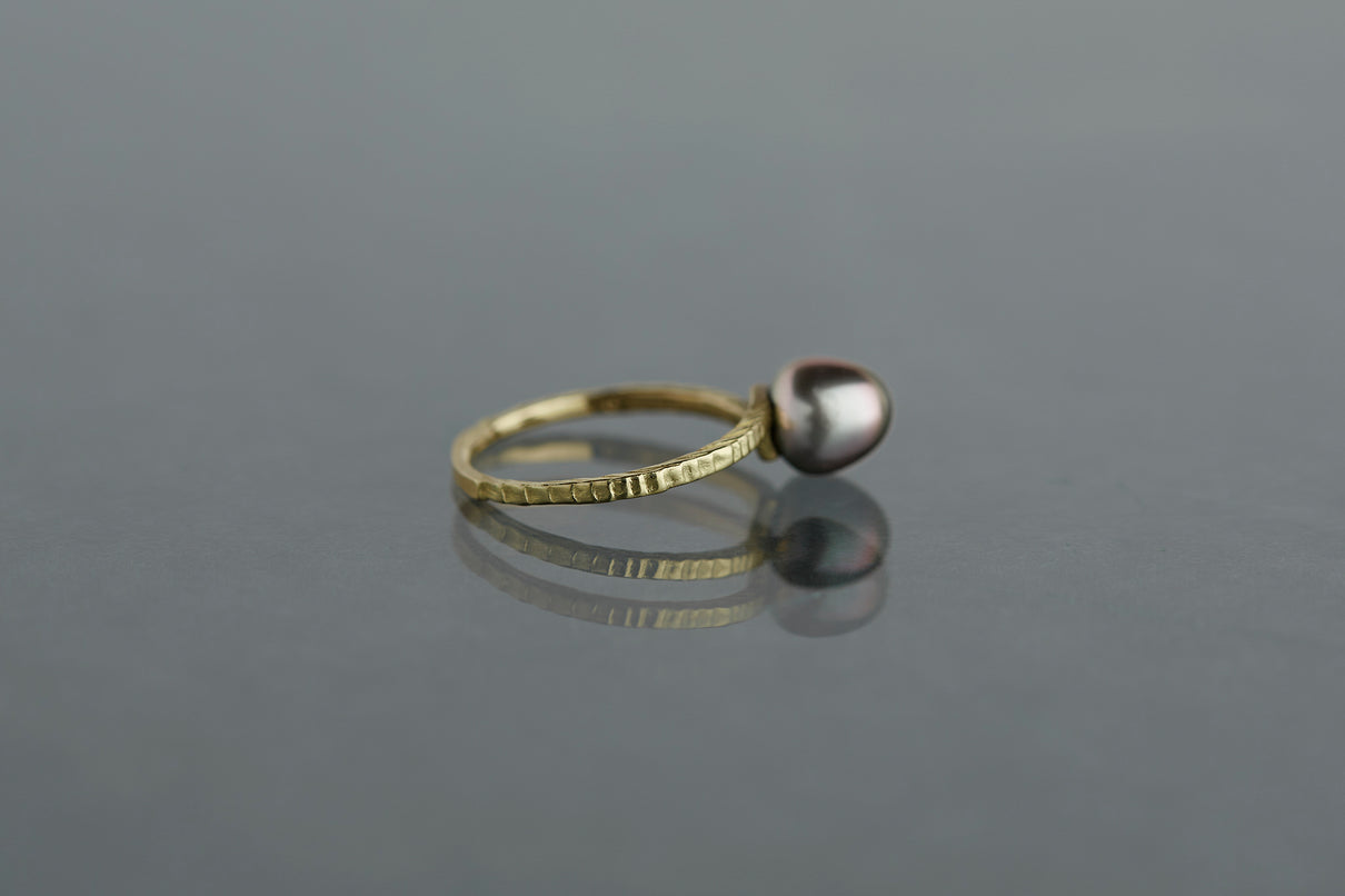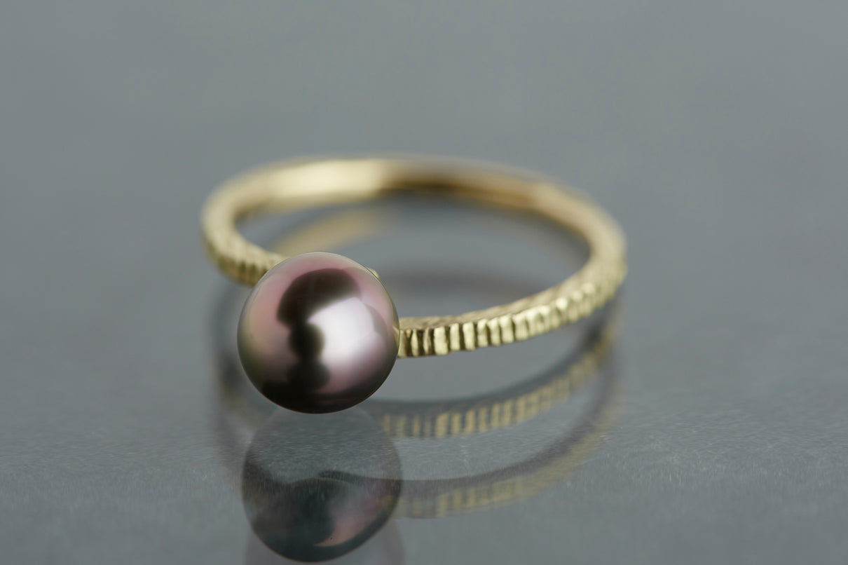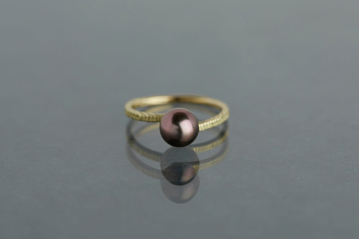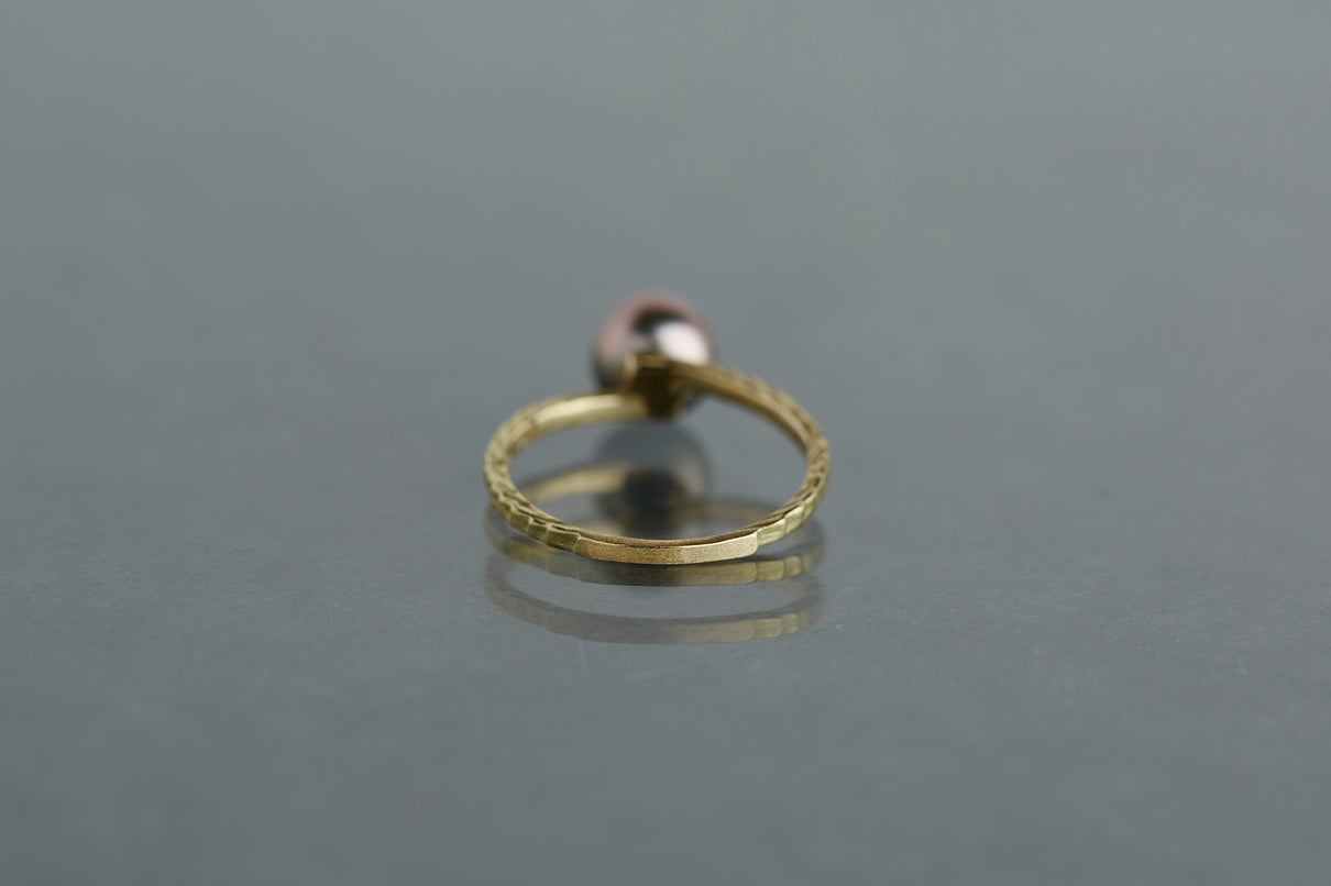 "立ち止まり、目を向ければ 大切なことは 変わらずいつもそこに在る ー" 2023 collection 「Unknown knowns」シリーズのリングベースに、、柔らかな台形をしたタヒチパールを留めた一点もののリング。孔雀の羽のように、グレーの中にグリーンやブルーの複雑な色味をもつパールは、マゼンタのテリが美しく艶めき、より奥深い表情を見せてくれます。僅かに左右のアームがずれたデザインで、シンプルながらもひと匙の個性を感じます。ひとつでも重ね付けにも活躍するパールリングです。