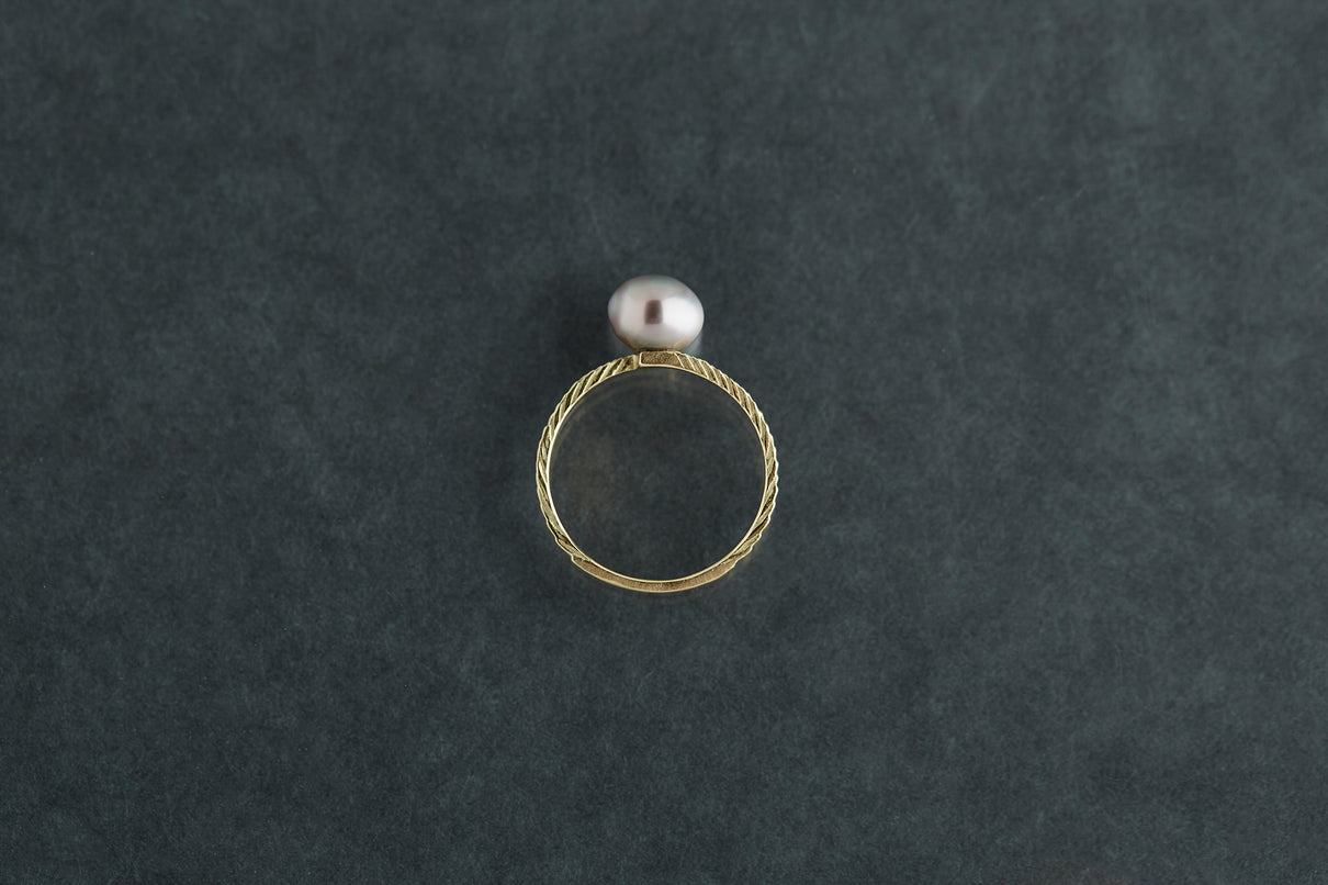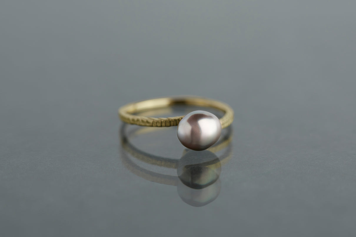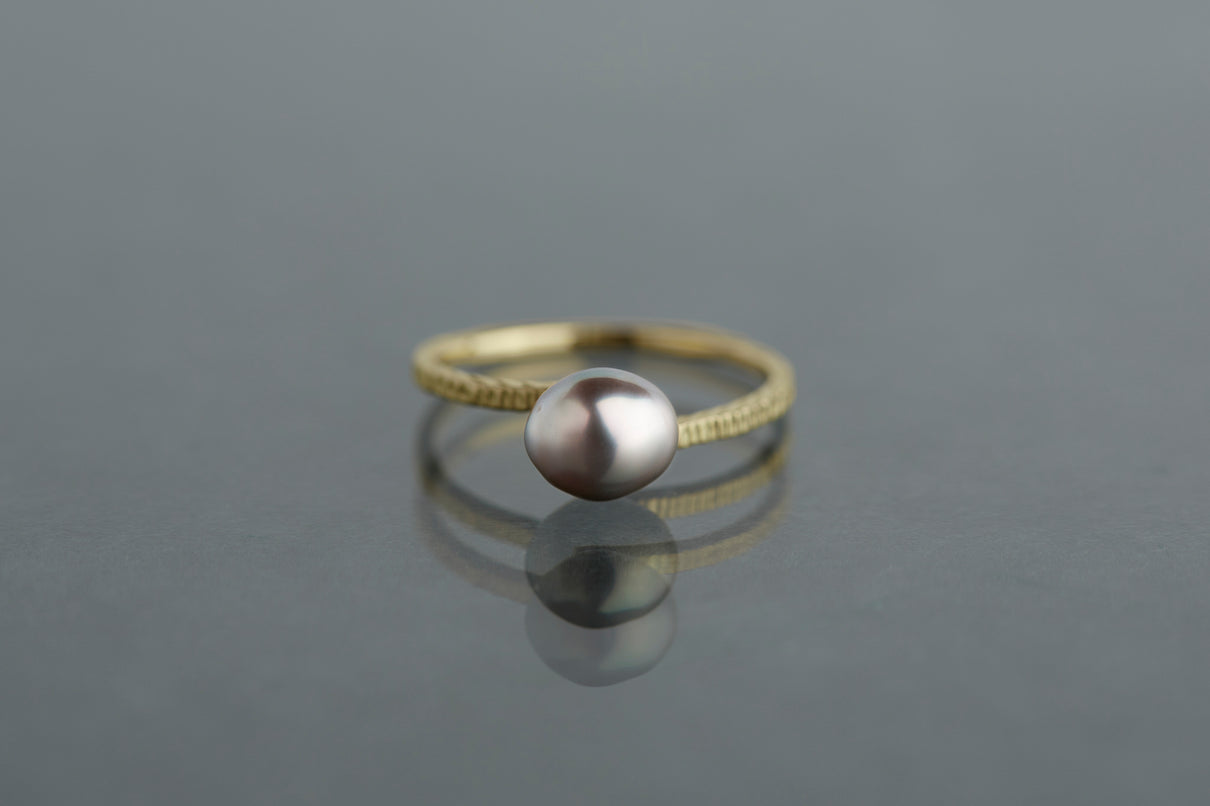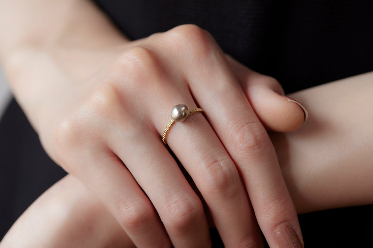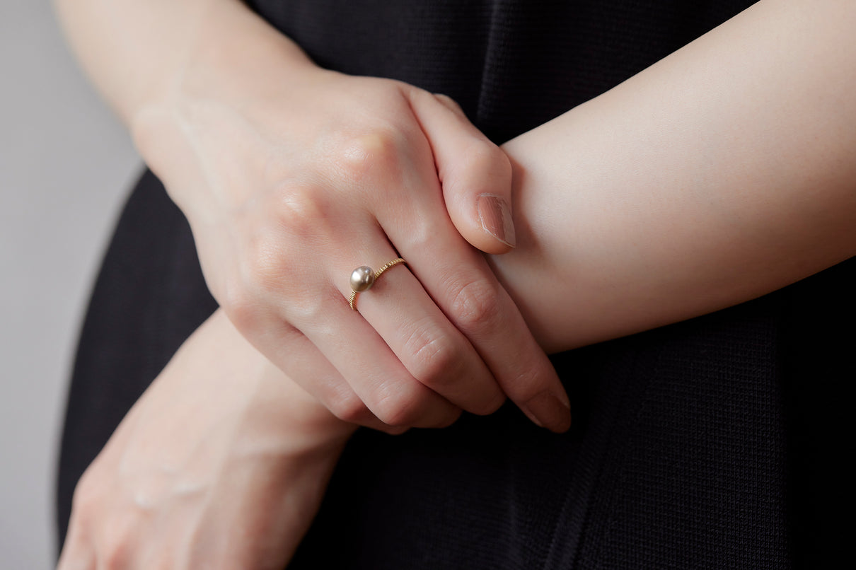"立ち止まり、目を向ければ 大切なことは 変わらずいつもそこに在る ー" 2023 collection 「Unknown knowns」シリーズのリングベースに、豊かな自然が育んだたおやかなフォルムのタヒチパールを留めた一点もののリング。何色とも言い難い複雑で奥深い色彩が美しく艶めきます。僅かに左右のアームがずれたデザインで、シンプルながらもひと匙の個性を感じます。ひとつでも重ね付けにも活躍するパールリングです。