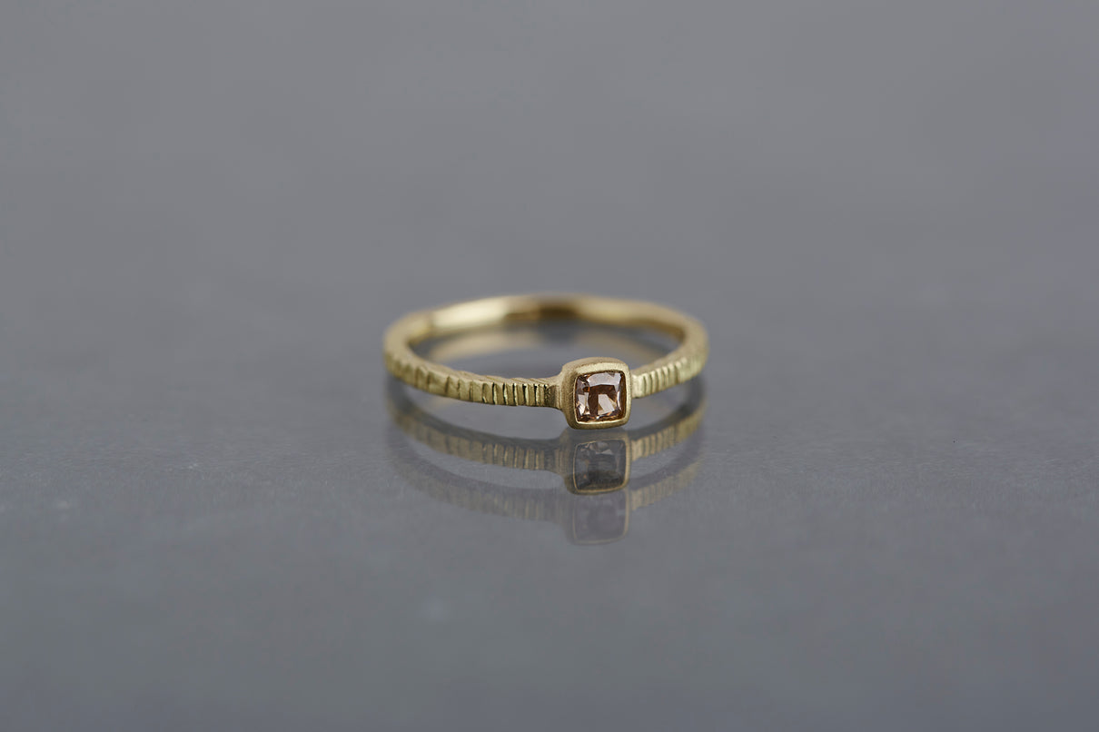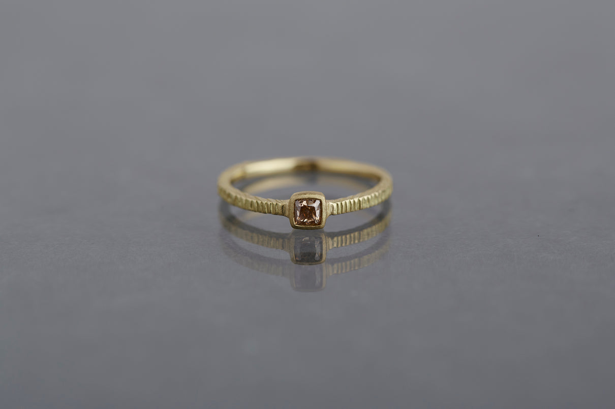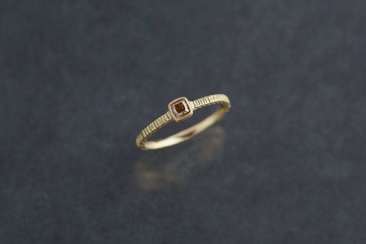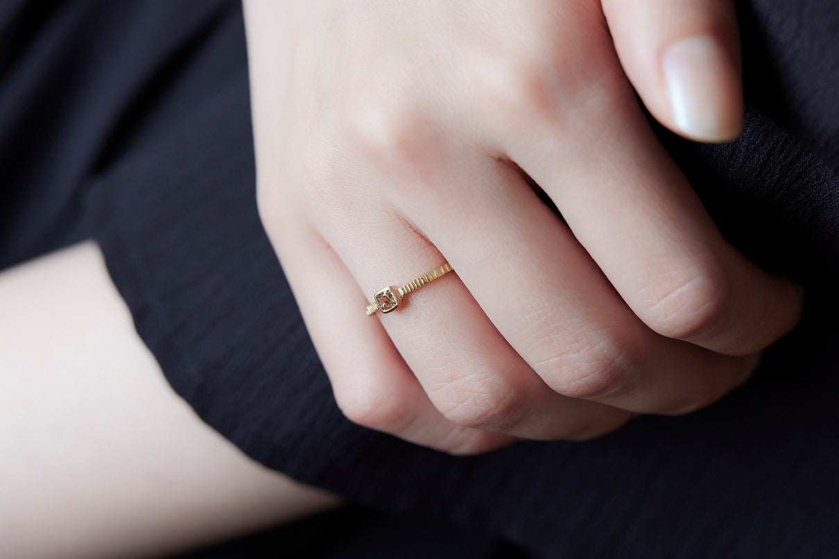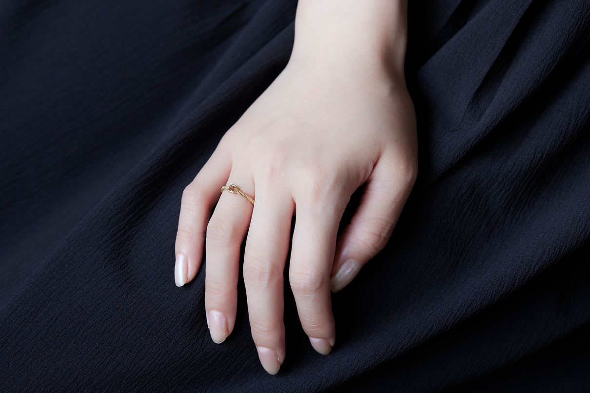 "立ち止まり、目を向ければ 大切なことは 変わらずいつもそこに在る ー" 2023 collection 「Unknown knowns」シリーズのリングベースに、美しいクッションカットのブラウンダイヤモンドを留めた一点もののリング。透明度が高いブラウンダイヤモンドは落ち着きのある印象ながら、奥行きのあるカッティングで美しい輝きを放ちます。細身のアームは軽やかな付け心地で、普段使いのリングとしてもおすすめです。