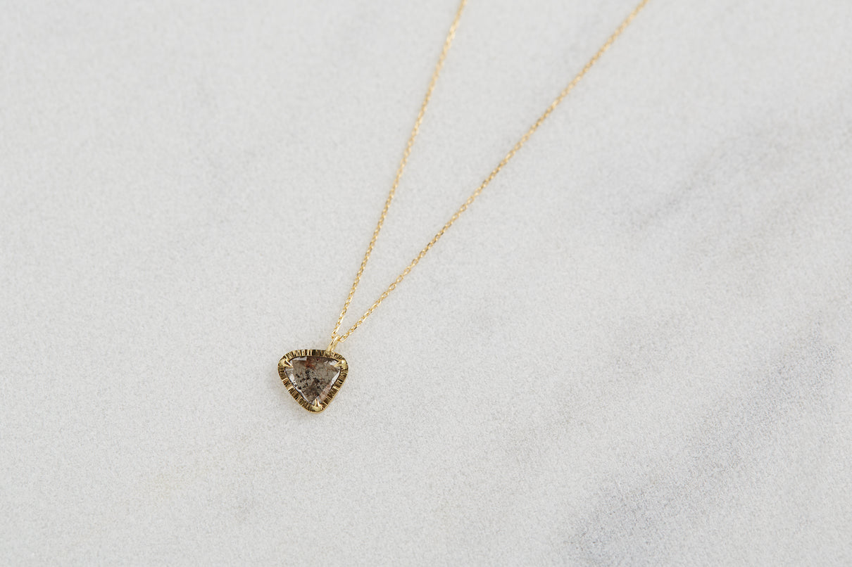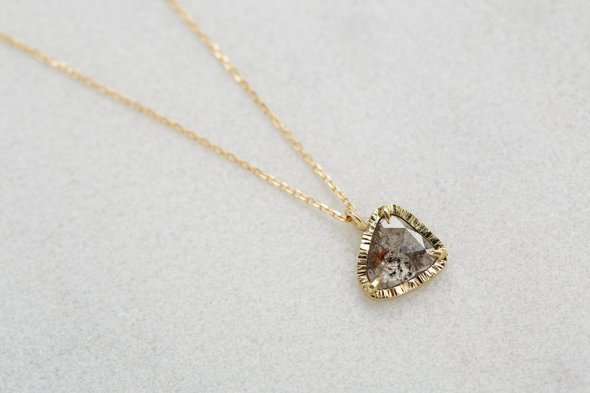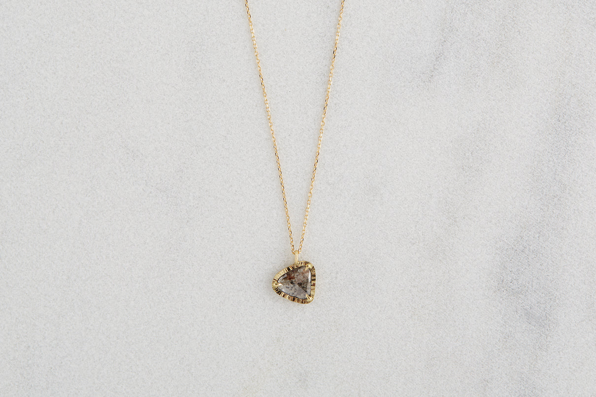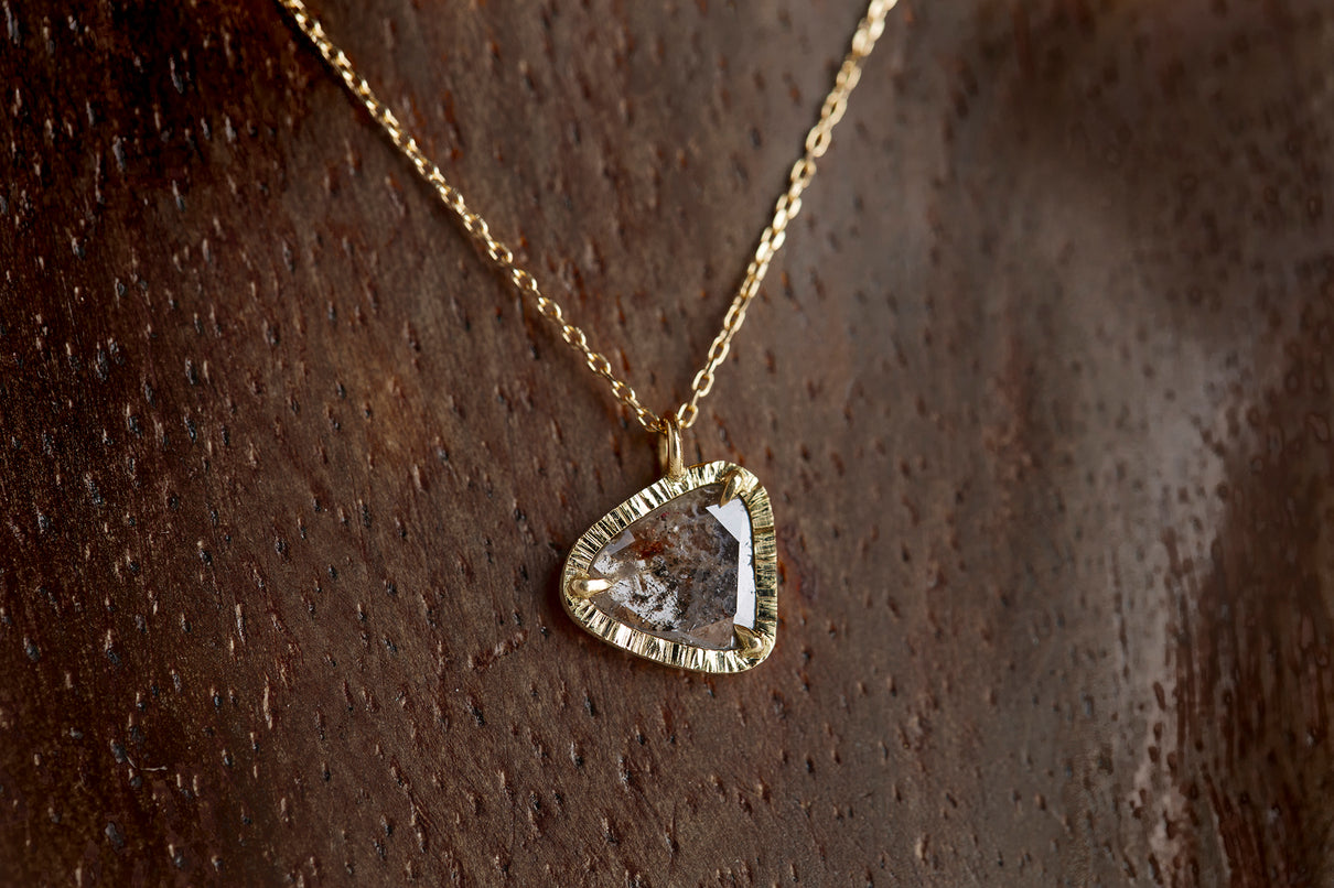ユニークなインクルージョンが閉じ込められたダイヤモンドで仕立てた1点もののネックレス。原石を薄く輪切りにしたようにスライスカットされたダイヤモンドは、光が当たるたびに強い輝きを放ち、それを縁取るK18ゴールドに施した繊細に煌めく筋彫りが、一層華やかに引き立てます。自然が生み出す有機的なフォルムと、優しく入り込んだ小粒のインクルージョンが愛らしい、一点もののネックレスです。※インクルージョンの他、一部ごく僅かなクラック状の内包物が見られます。自然が形づくる天然石ならではの表情としてお愉しみください。