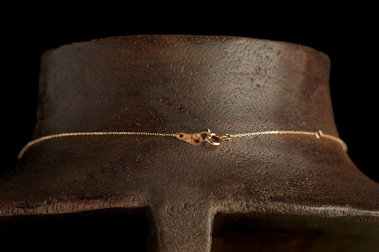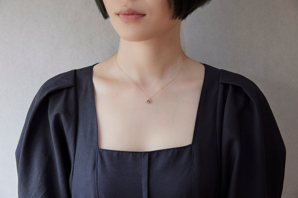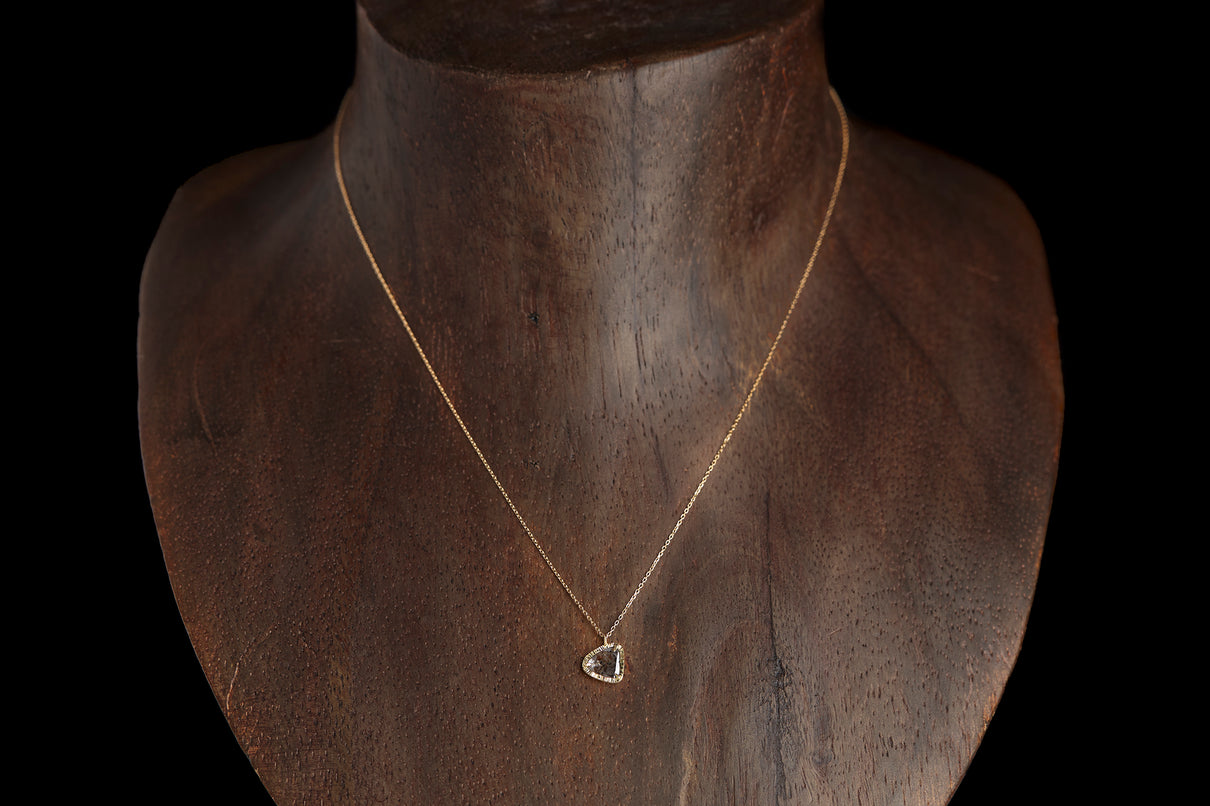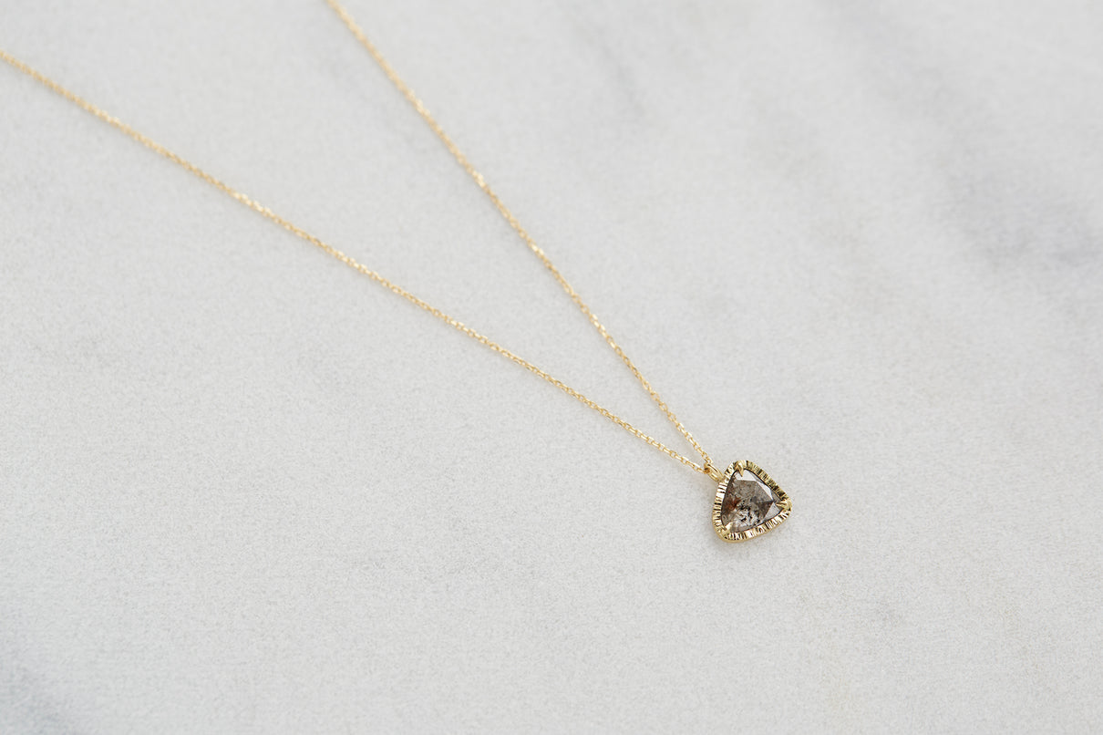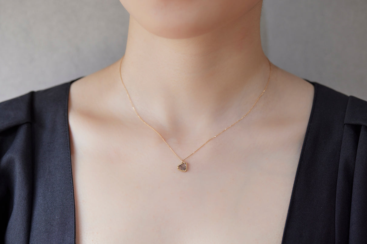 ユニークなインクルージョンが閉じ込められたダイヤモンドで仕立てた1点もののネックレス。原石を薄く輪切りにしたようにスライスカットされたダイヤモンドは、光が当たるたびに強い輝きを放ち、それを縁取るK18ゴールドに施した繊細に煌めく筋彫りが、一層華やかに引き立てます。自然が生み出す有機的なフォルムと、優しく入り込んだ小粒のインクルージョンが愛らしい、一点もののネックレスです。※インクルージョンの他、一部ごく僅かなクラック状の内包物が見られます。自然が形づくる天然石ならではの表情としてお愉しみください。