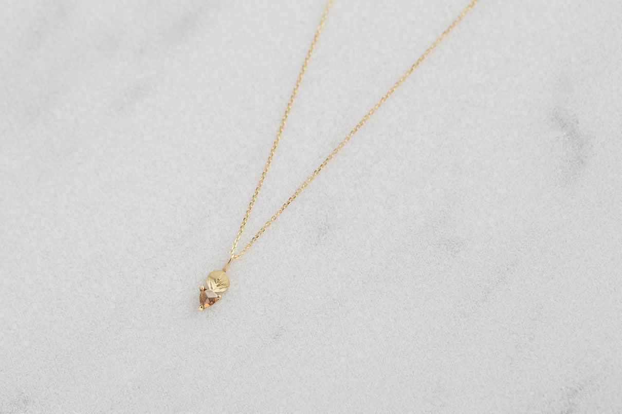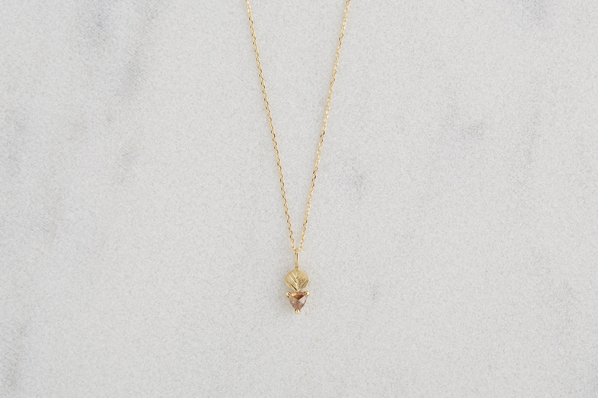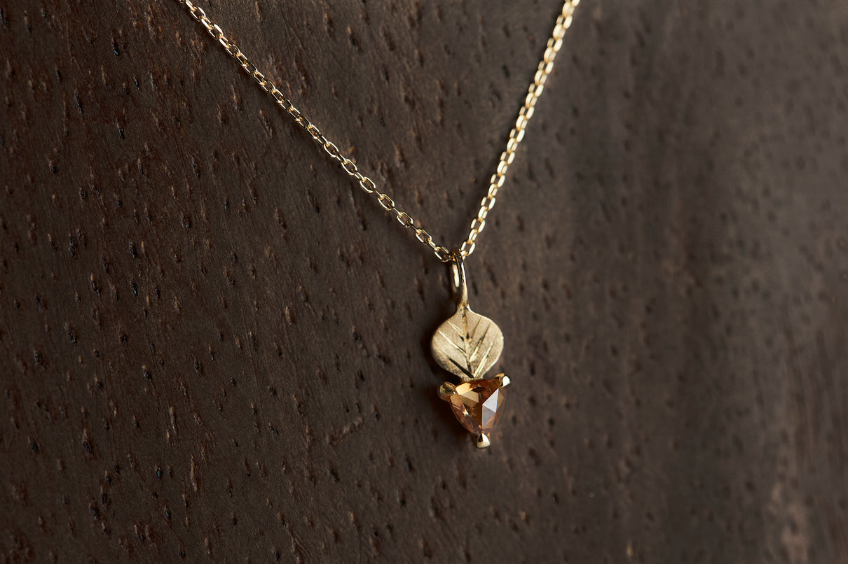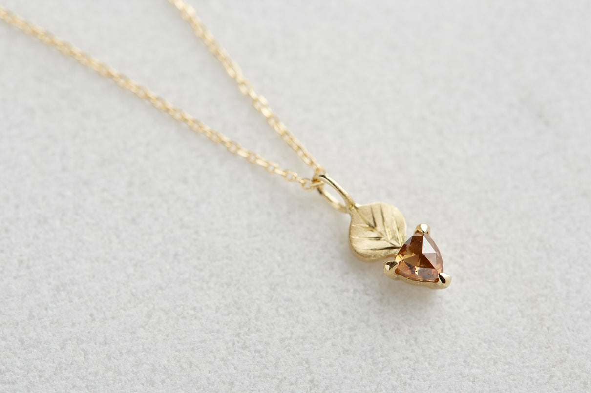 手彫りの葉脈が煌めく葉っぱモチーフのゴールドパーツに、柔らかな三角形のカットが施されたブラウンカラーダイヤモンドを合わせたネックレス。瑞々しい果物のようなローズカットのブラウンダイヤモンドは、肌馴染みがよく、胸元で美しく煌めきます。さりげなく身につけられるシンプルなデザインで、普段の装いを品よく引き立ててくれるアイテムです。
