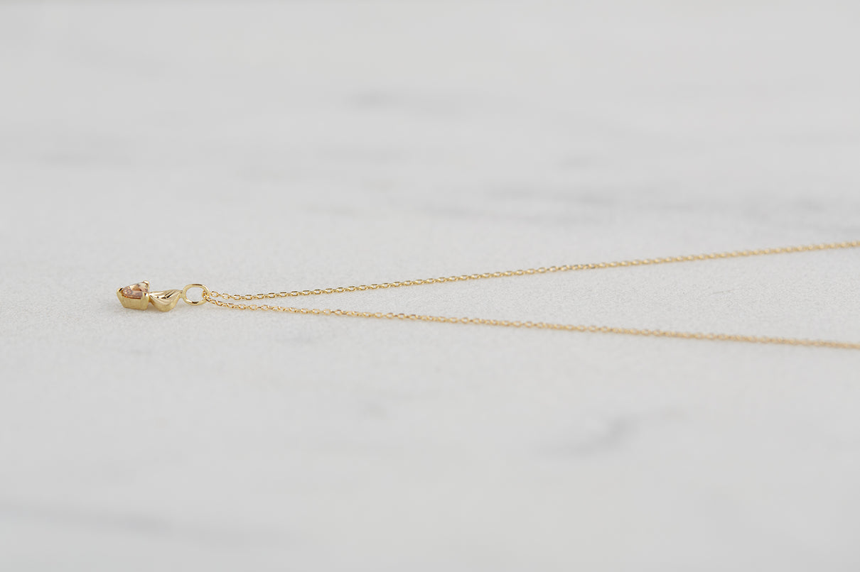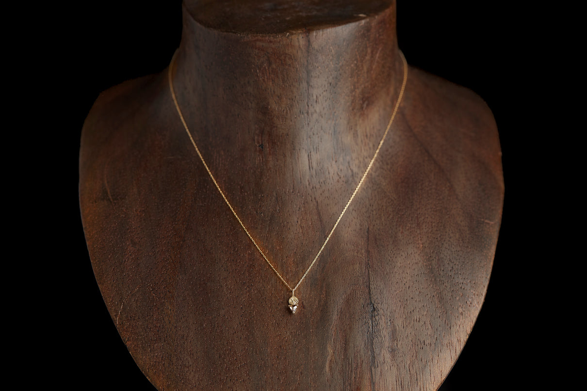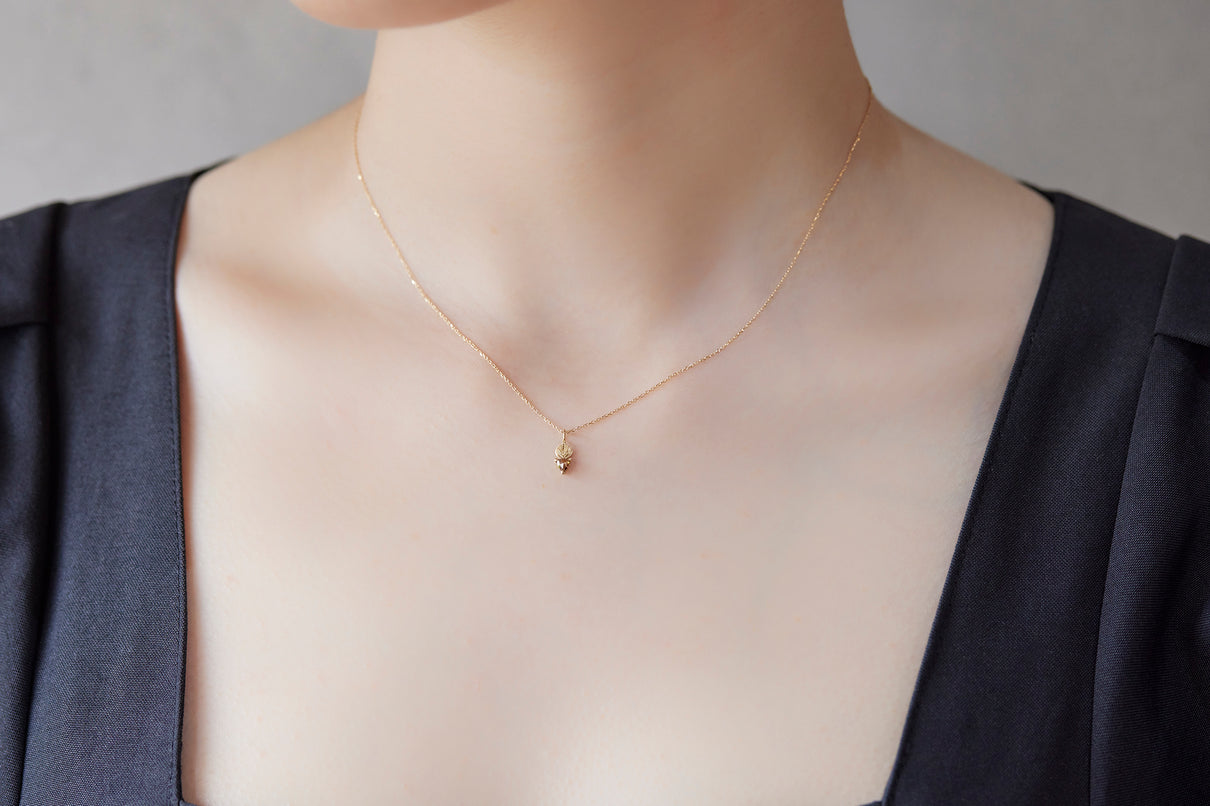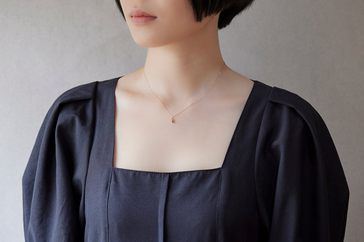 手彫りの葉脈が煌めく葉っぱモチーフのゴールドパーツに、柔らかな三角形のカットが施されたブラウンカラーダイヤモンドを合わせたネックレス。瑞々しい果物のようなローズカットのブラウンダイヤモンドは、肌馴染みがよく、胸元で美しく煌めきます。さりげなく身につけられるシンプルなデザインで、普段の装いを品よく引き立ててくれるアイテムです。