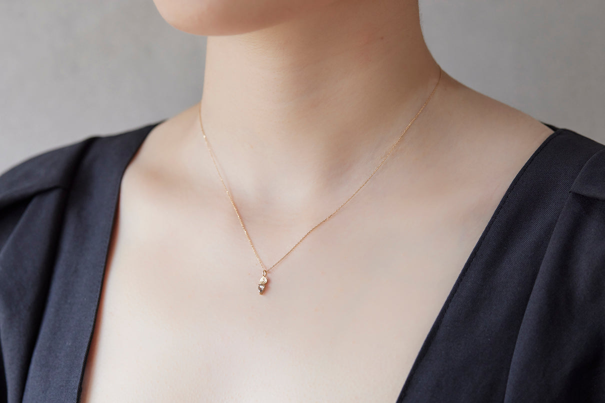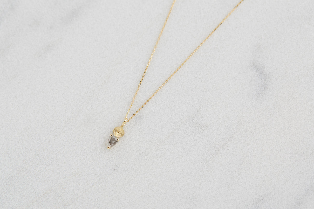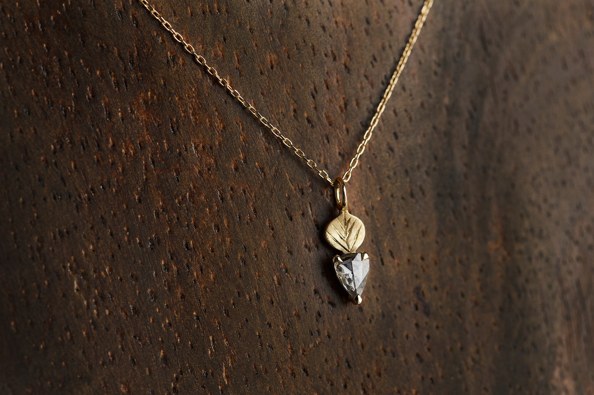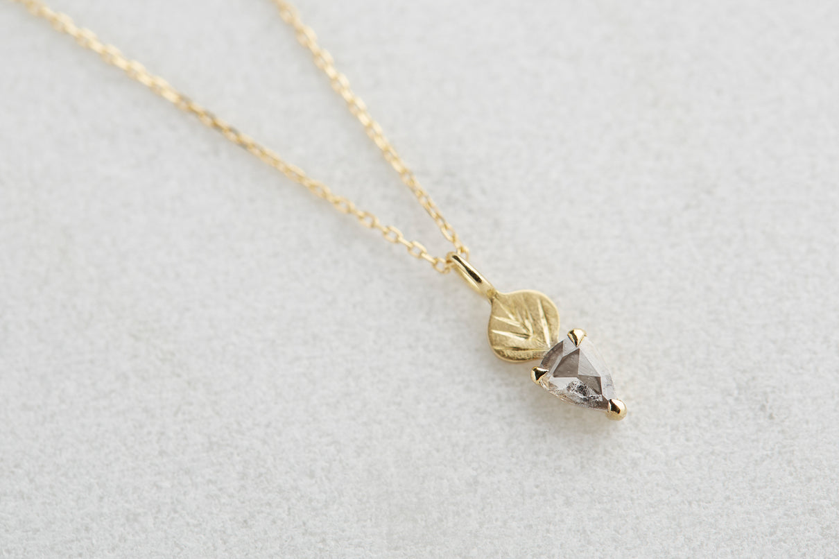 手彫りの葉脈が煌めく葉っぱモチーフのゴールドパーツに、雫型のダイヤモンドを合わせたネックレス。僅かにライトグレーを感じる柔らかなフォルムのダイヤモンドは透明度が高く、先端にインクルージョンが入り込むことで個性的な表情となっています。胸元でローズカットダイヤモンドならではの瑞々しい輝きを放ち、普段の装いを品よく引き立ててくれるアイテムです。