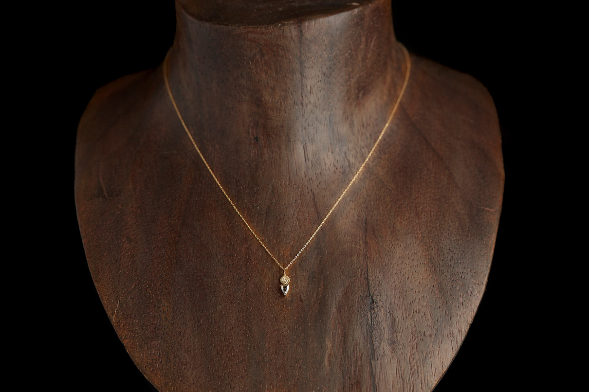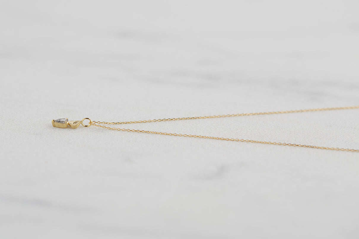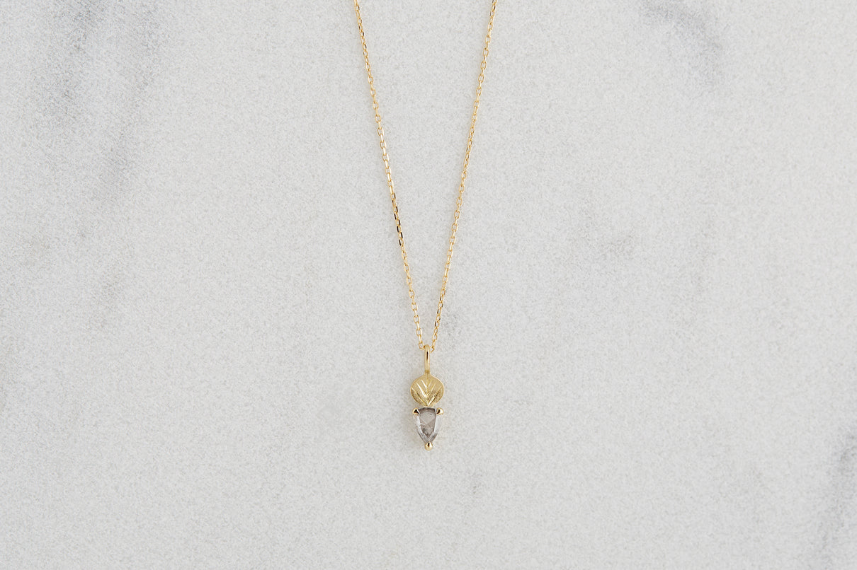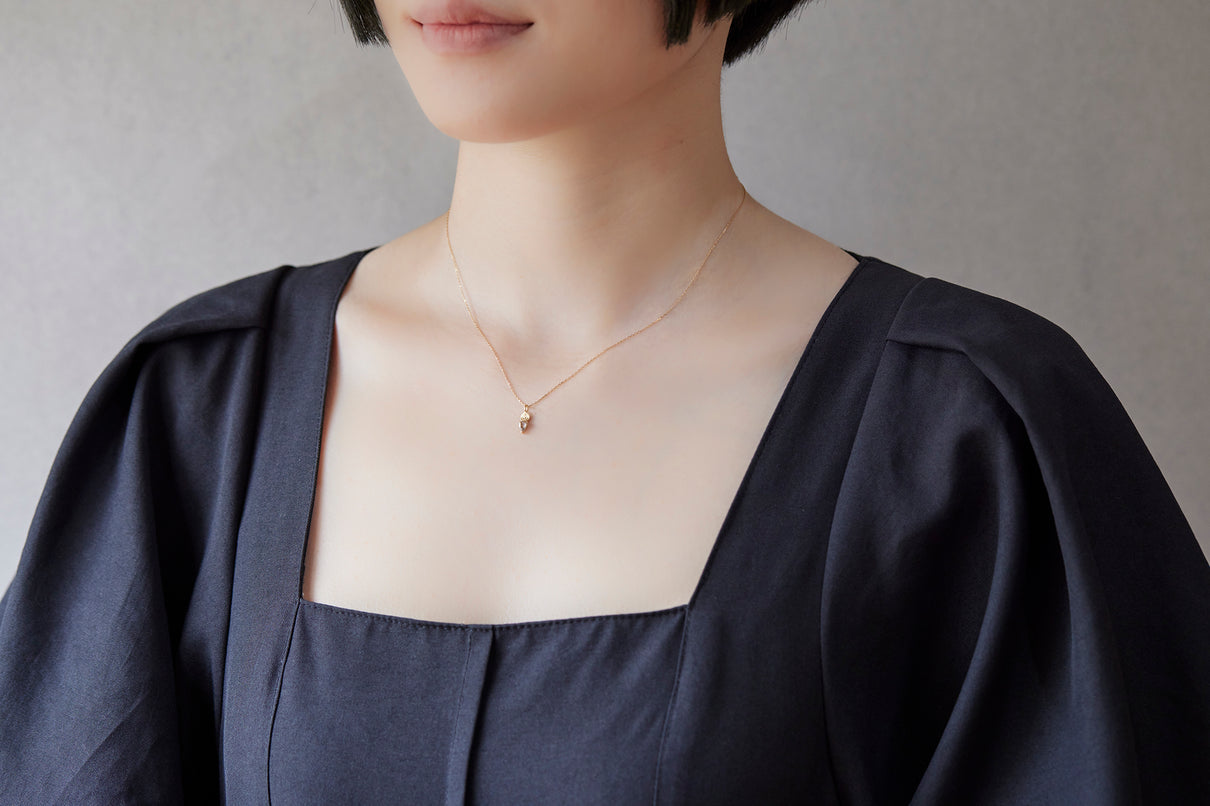 手彫りの葉脈が煌めく葉っぱモチーフのゴールドパーツに、雫型のダイヤモンドを合わせたネックレス。僅かにライトグレーを感じる柔らかなフォルムのダイヤモンドは透明度が高く、先端にインクルージョンが入り込むことで個性的な表情となっています。胸元でローズカットダイヤモンドならではの瑞々しい輝きを放ち、普段の装いを品よく引き立ててくれるアイテムです。
