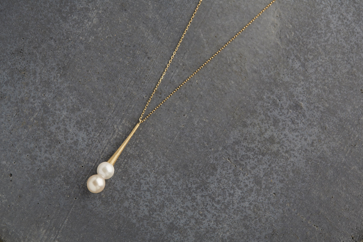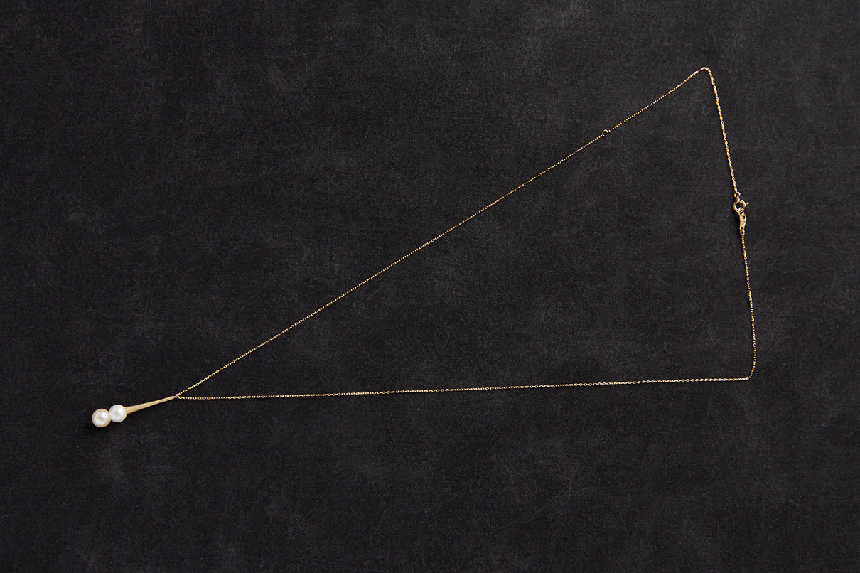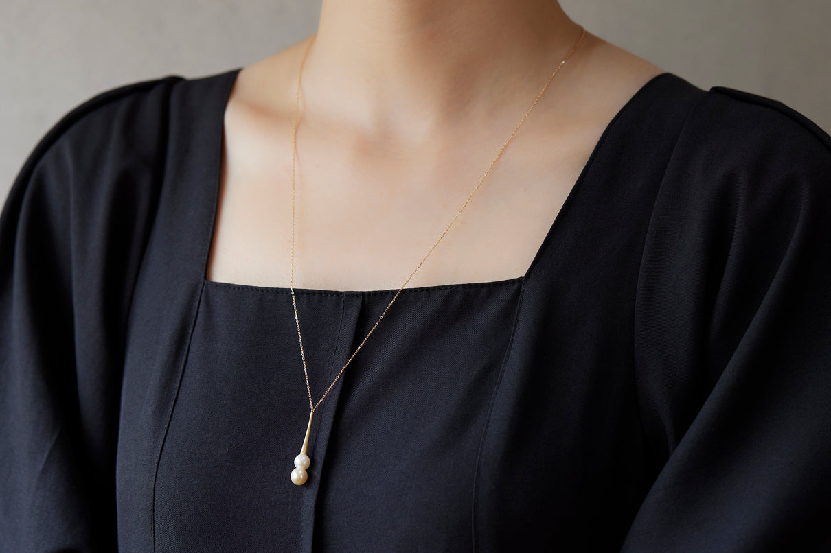 K18ゴールドの帽子の先には、アコヤ貝がパールを生み出す過程で思いがけずに誕生した、雪だるまのような双子のパールを留めました。シャープで長い円錐型のゴールドにはマットなテクスチャーを施し、先のパールの形と自然な繋がりになるように仕立てています。周りの景色を映し出すほど強い照りで奥深く輝くホワイトを基調としたアコヤパールは、1つ1つ微妙に形も異なります。こちらは先端が僅かにゴールドに色づき、徐々に優しいホワイトにグラデーションしているパール。名前のように凛と静かに滴る"雨滴"のようなフォルムで、やわらかな雰囲気を持つ一点もののロングネックレスです。