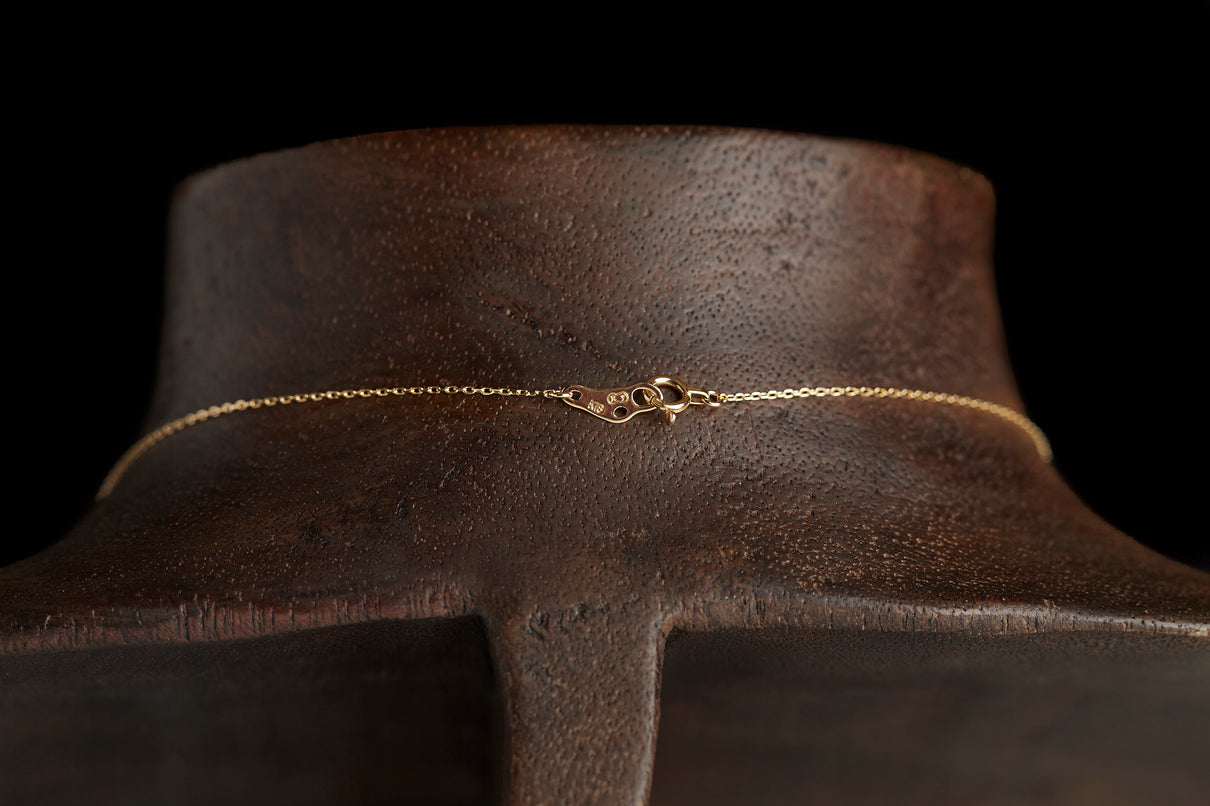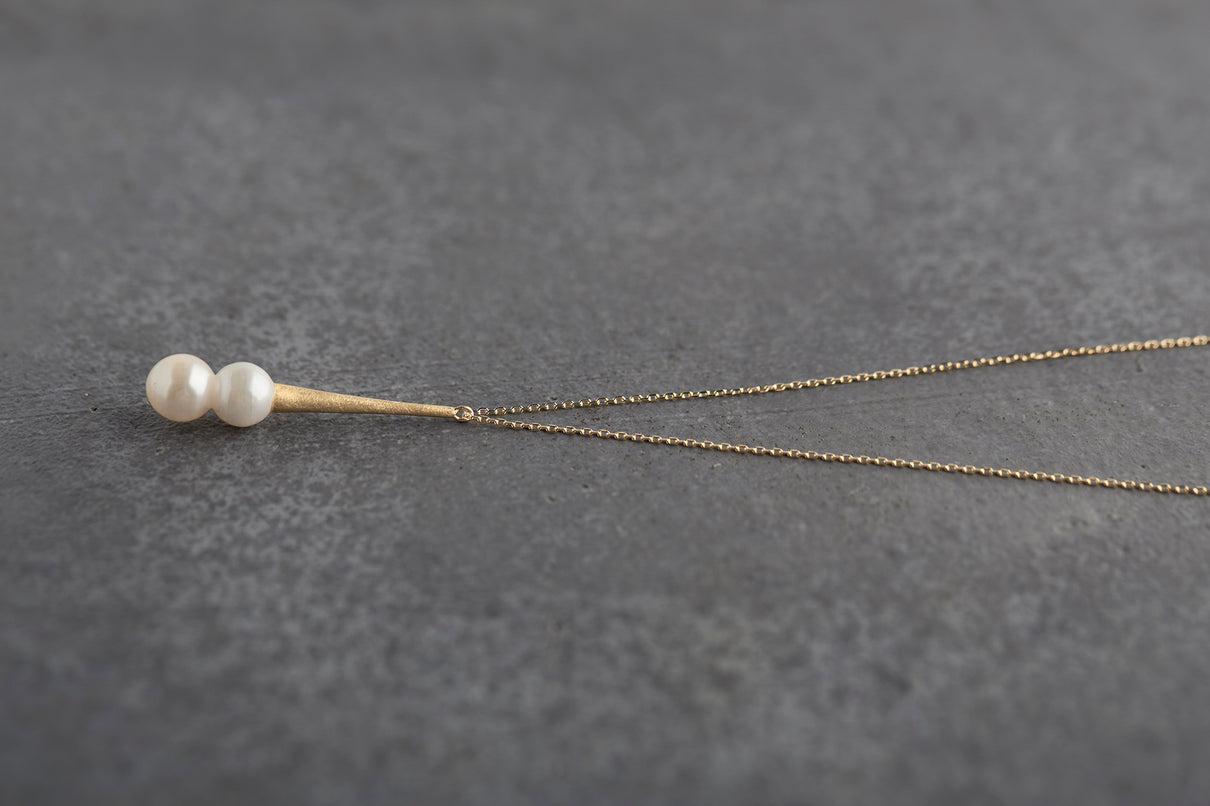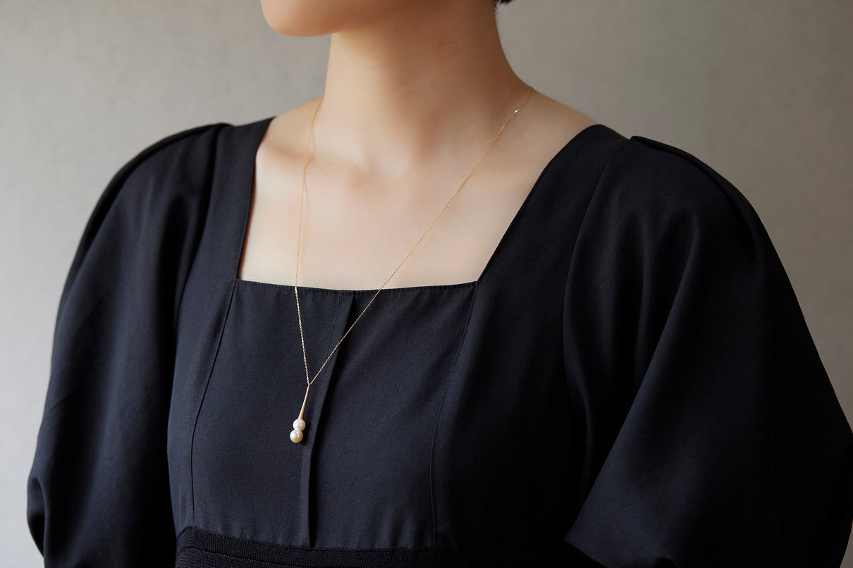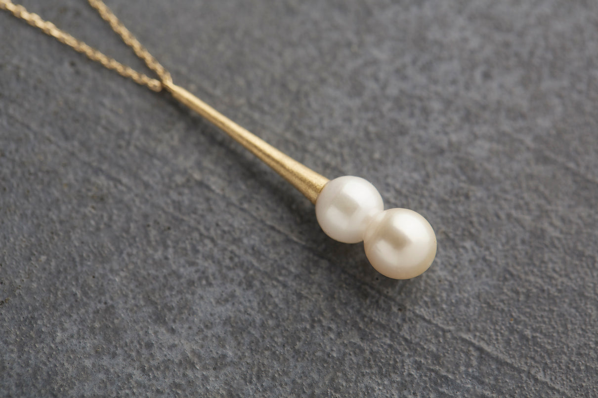 K18ゴールドの帽子の先には、アコヤ貝がパールを生み出す過程で思いがけずに誕生した、雪だるまのような双子のパールを留めました。シャープで長い円錐型のゴールドにはマットなテクスチャーを施し、先のパールの形と自然な繋がりになるように仕立てています。周りの景色を映し出すほど強い照りで奥深く輝くホワイトを基調としたアコヤパールは、1つ1つ微妙に形も異なります。こちらは先端が僅かにゴールドに色づき、徐々に優しいホワイトにグラデーションしているパール。名前のように凛と静かに滴る"雨滴"のようなフォルムで、やわらかな雰囲気を持つ一点もののロングネックレスです。