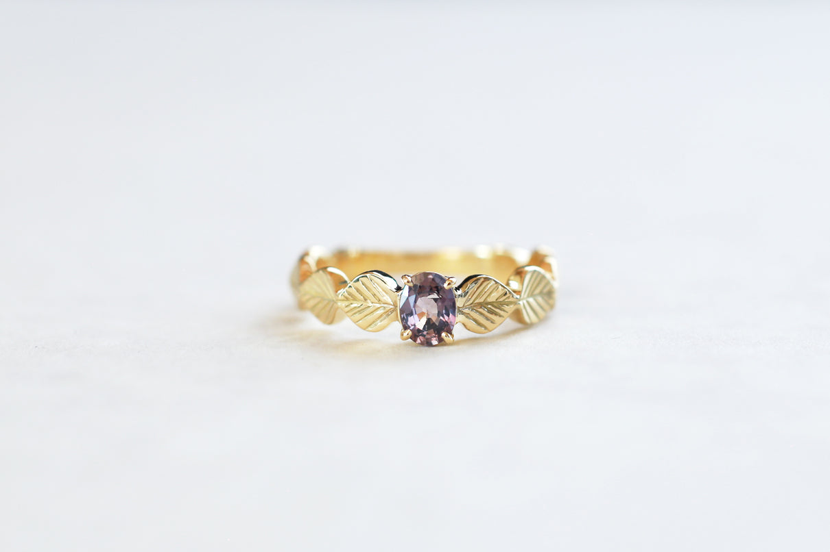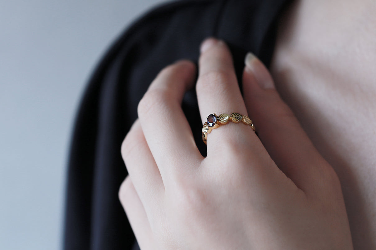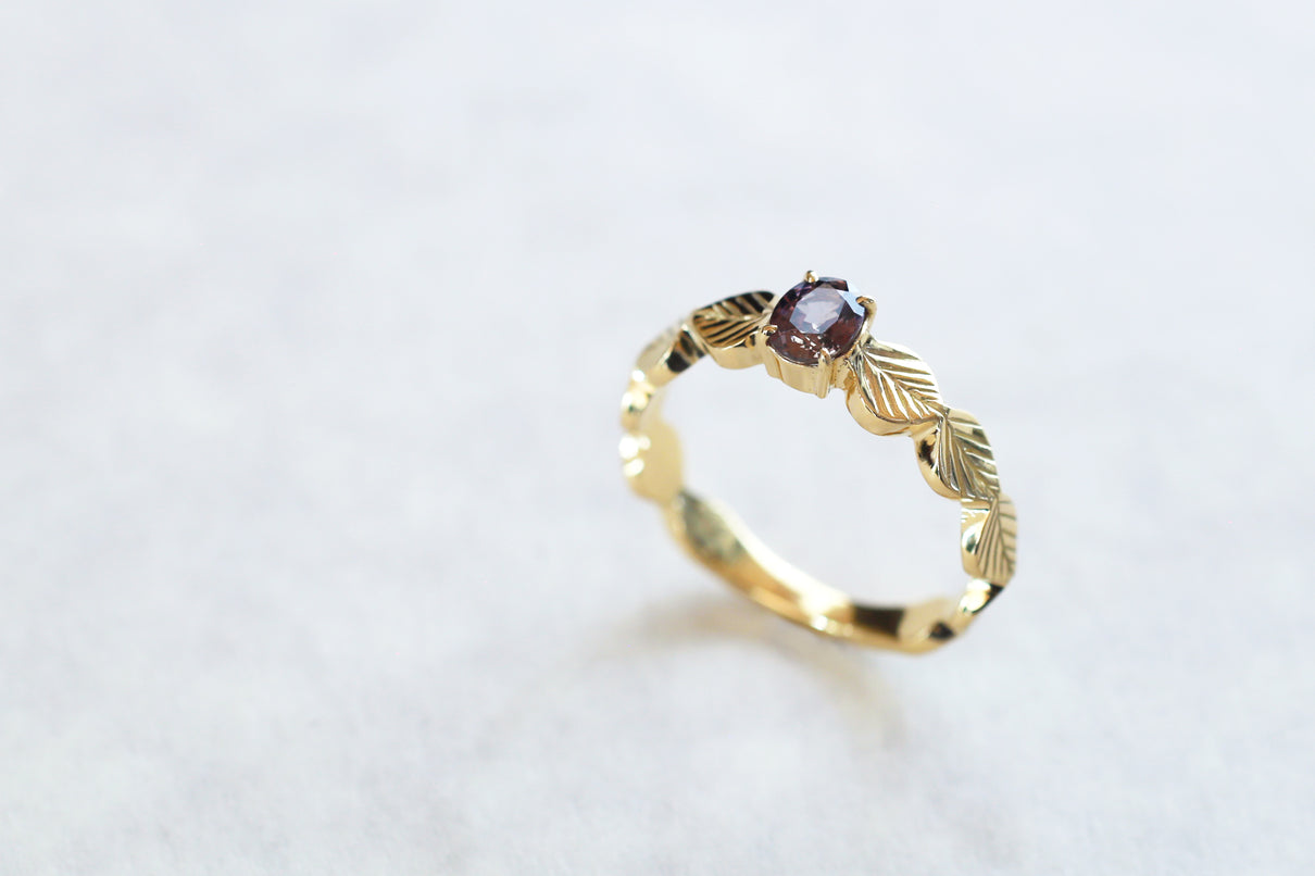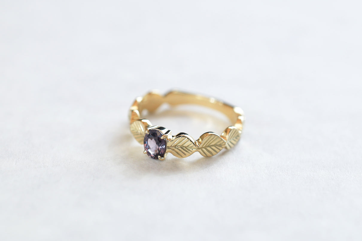 いくつも連なる葉っぱをモチーフに、1枚1枚わずかに異なる表情に遊び心を込めた"Leaf"シリーズの1点もののリング。中央に煌めくオーバルカットのルースは、白熱灯の下ではグレイッシュブルー、太陽光の下では淡いワインレッドに変化して見える、希少性の高いカラーチェンジサファイアです。シックなグレーカラーからの色の変化がひと際美しい、鑑別機関にて正式にカラーチェンジが証明された上質な1ピースを厳選しました。アームの葉っぱは、幅広のLeaf タイプ。日常的に身に着けていただくのはもちろん、9月の誕生石としても親しまれているサファイアは、9月生まれの方の特別なお守りとして贈りものにも最適なアイテムです。