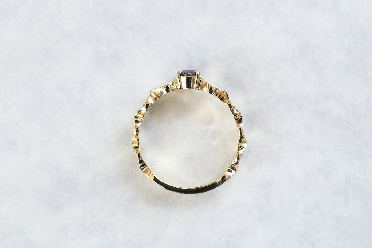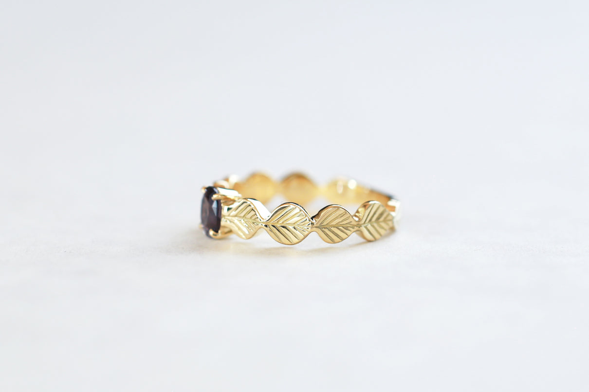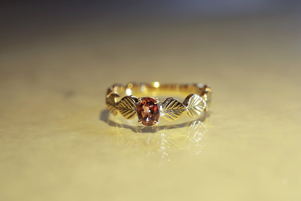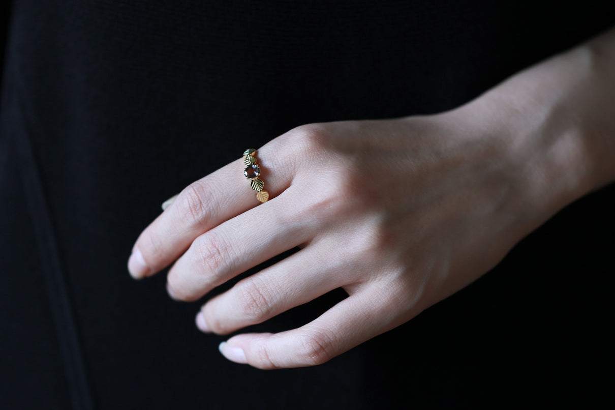 いくつも連なる葉っぱをモチーフに、1枚1枚わずかに異なる表情に遊び心を込めた"Leaf"シリーズの1点もののリング。中央に煌めくオーバルカットのルースは、白熱灯の下ではグレイッシュブルー、太陽光の下では淡いワインレッドに変化して見える、希少性の高いカラーチェンジサファイアです。シックなグレーカラーからの色の変化がひと際美しい、鑑別機関にて正式にカラーチェンジが証明された上質な1ピースを厳選しました。アームの葉っぱは、幅広のLeaf タイプ。日常的に身に着けていただくのはもちろん、9月の誕生石としても親しまれているサファイアは、9月生まれの方の特別なお守りとして贈りものにも最適なアイテムです。