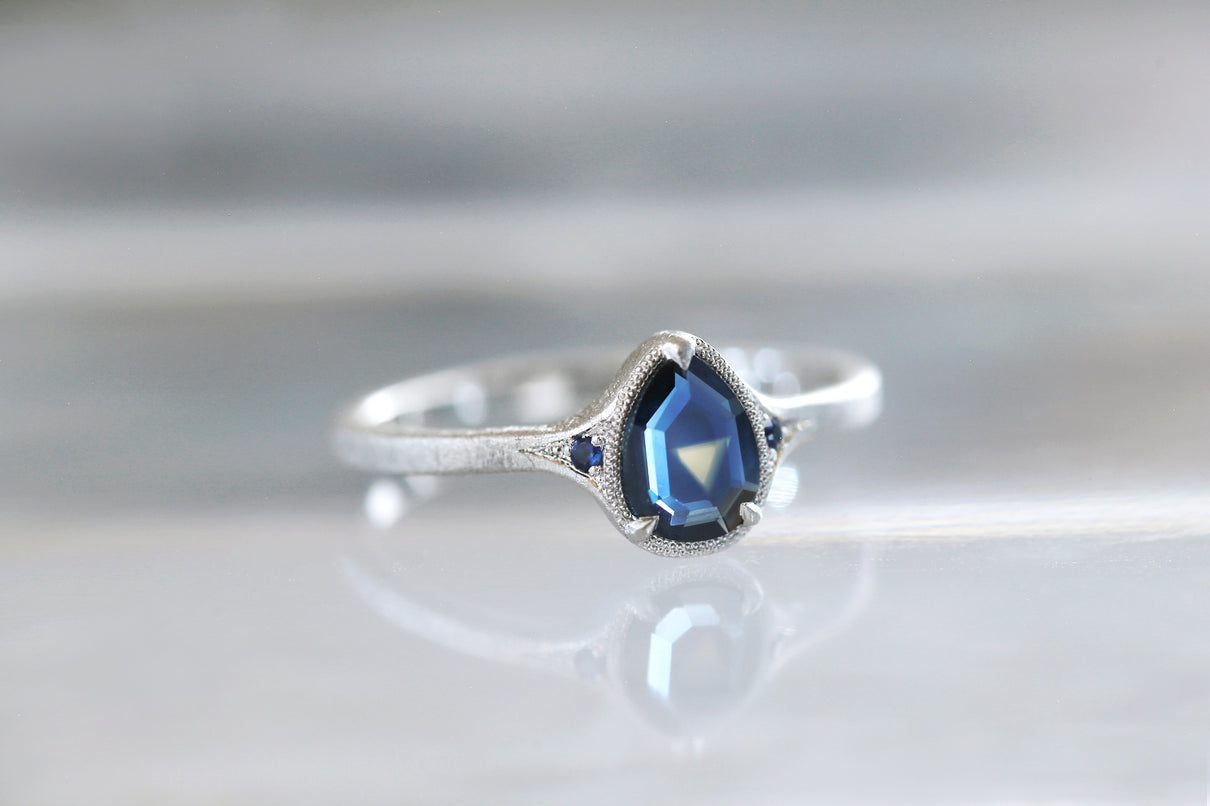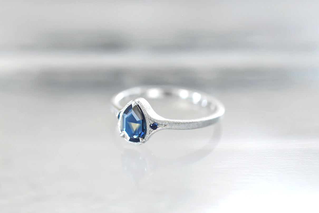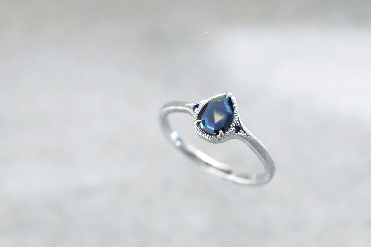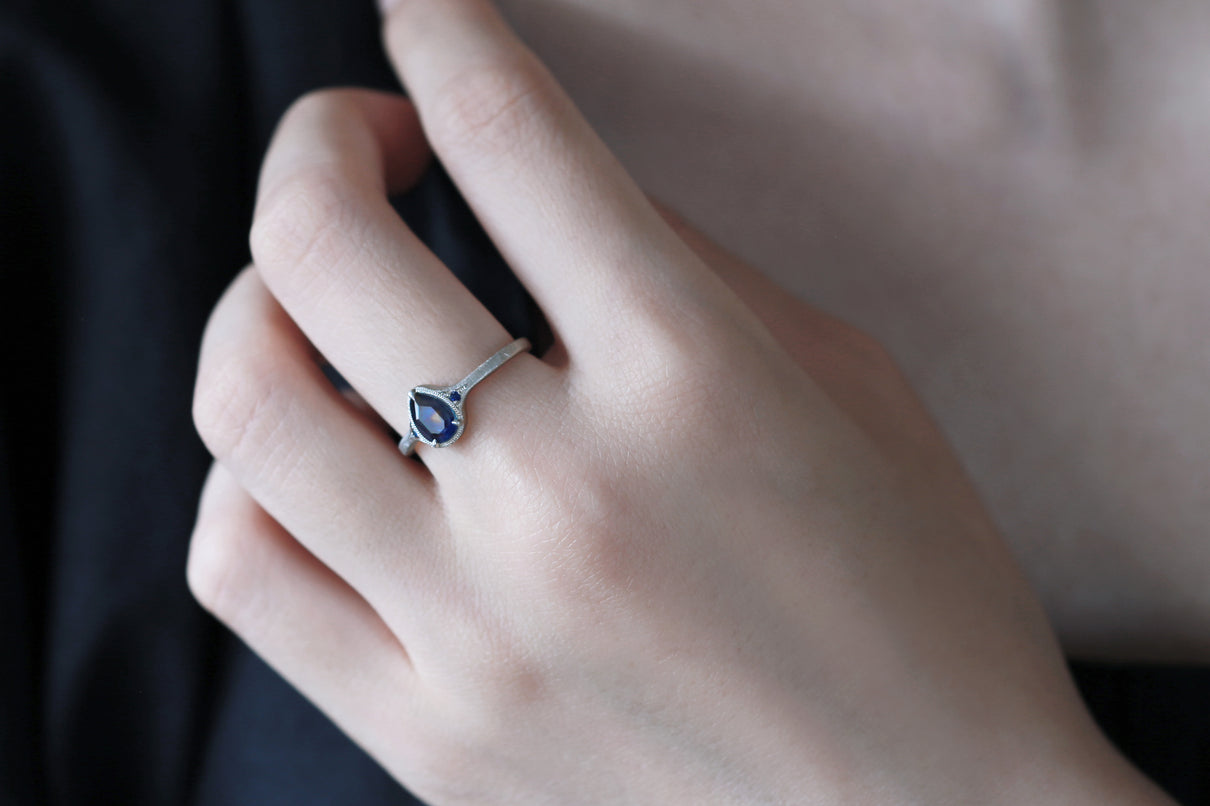 サファイアが結晶化する過程で含有物や結晶構造に違いが生まれることで、青と黄色、青と緑、青と紫などといった異なる2色が隣合わせに成長するバイカラーサファイアで仕立てた1点もののリング。1つの結晶内に2種のカラーが見られるだけでも非常に希少性が高く、その中でも色のコントラストがくっきりと見え、濁りのない透明感が美しいピースを厳選しました。象徴的な淡い黄色い三角模様が嵌め込まれたようなドロップカットのサファイアを、両サイドにさりげなく輝くメレサファイアと繊細なミルグレインが引き立て、品良く上質な印象に仕上げました。個性がきらりと光り、装いのメインアイテムとしてひと際存在感を放つ特別なリングです。9月の誕生石としても親しまれているサファイアは、9月生まれの方の特別なお守りとしてもお勧めです。
