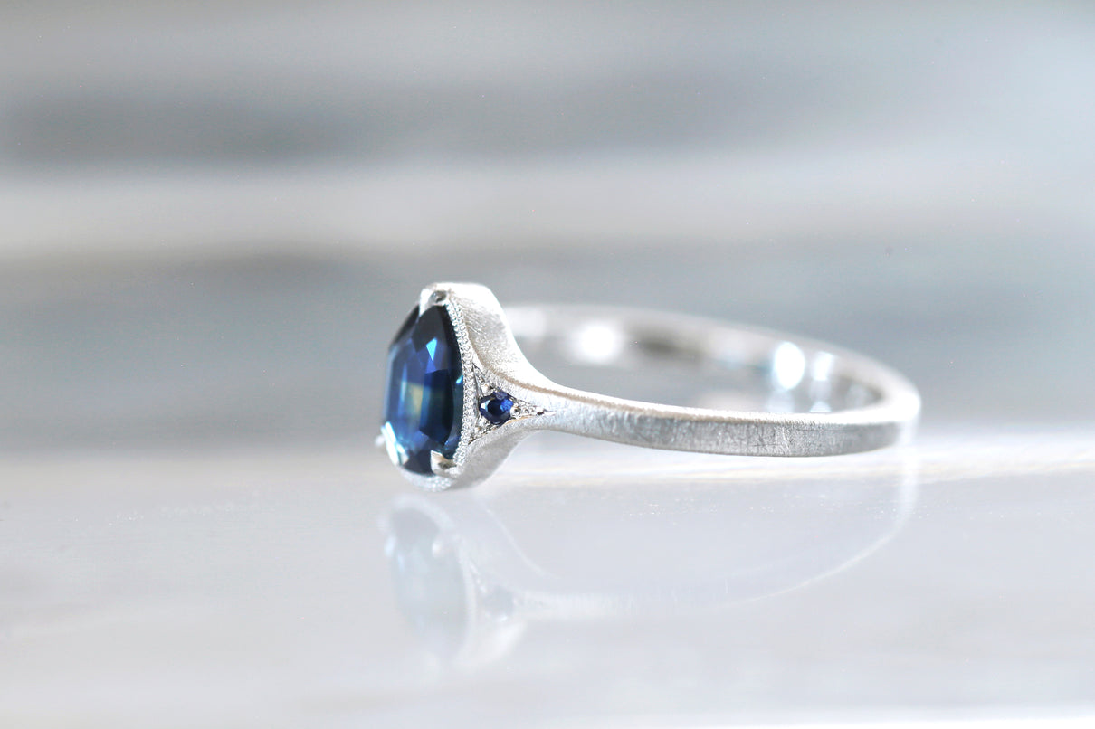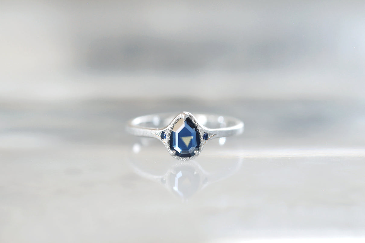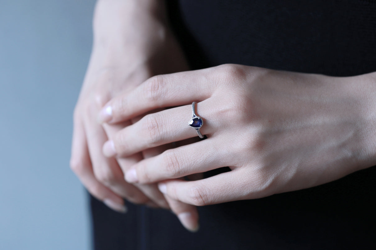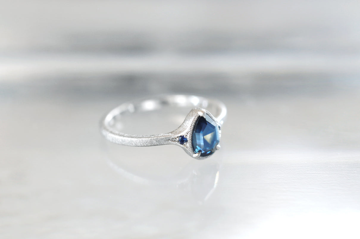 サファイアが結晶化する過程で含有物や結晶構造に違いが生まれることで、青と黄色、青と緑、青と紫などといった異なる2色が隣合わせに成長するバイカラーサファイアで仕立てた1点もののリング。1つの結晶内に2種のカラーが見られるだけでも非常に希少性が高く、その中でも色のコントラストがくっきりと見え、濁りのない透明感が美しいピースを厳選しました。象徴的な淡い黄色い三角模様が嵌め込まれたようなドロップカットのサファイアを、両サイドにさりげなく輝くメレサファイアと繊細なミルグレインが引き立て、品良く上質な印象に仕上げました。個性がきらりと光り、装いのメインアイテムとしてひと際存在感を放つ特別なリングです。9月の誕生石としても親しまれているサファイアは、9月生まれの方の特別なお守りとしてもお勧めです。
