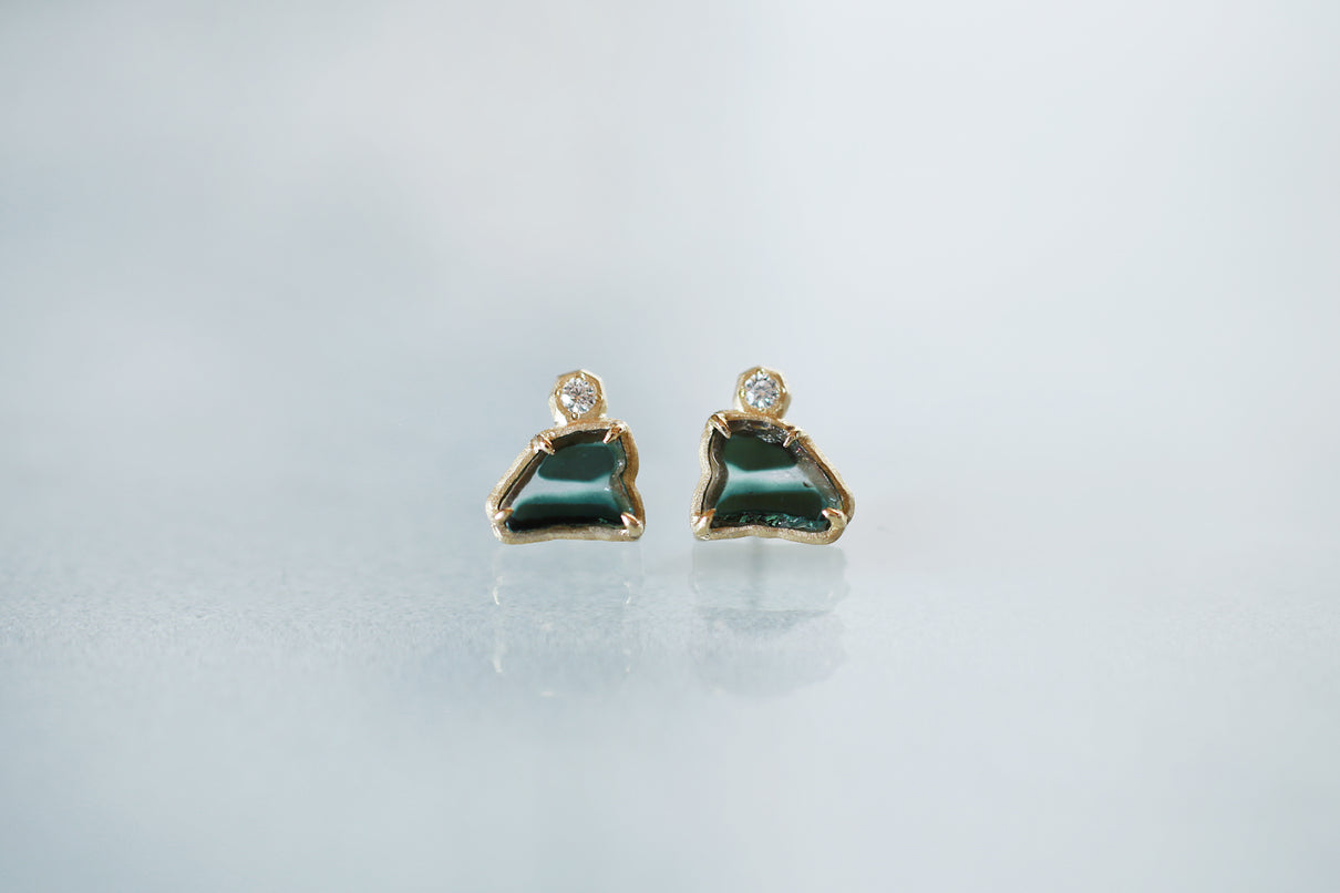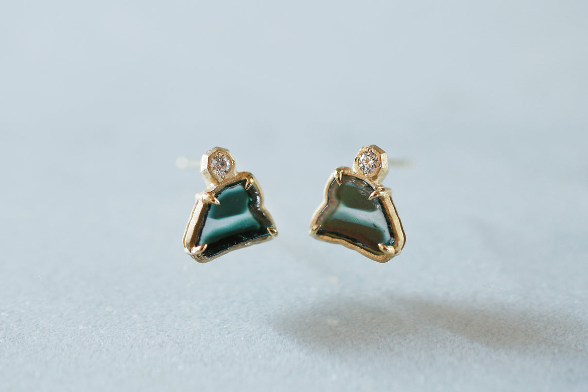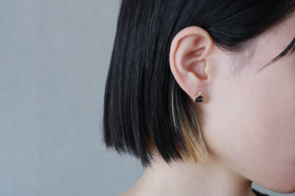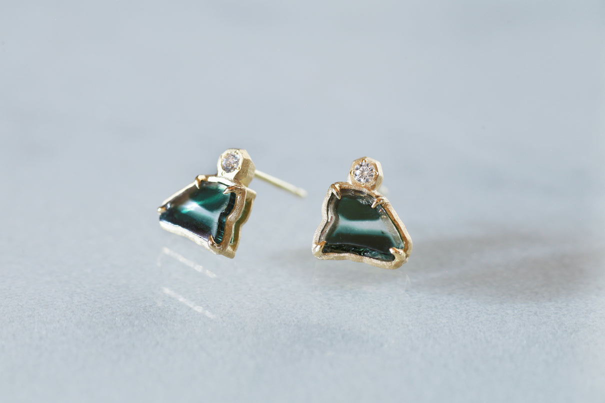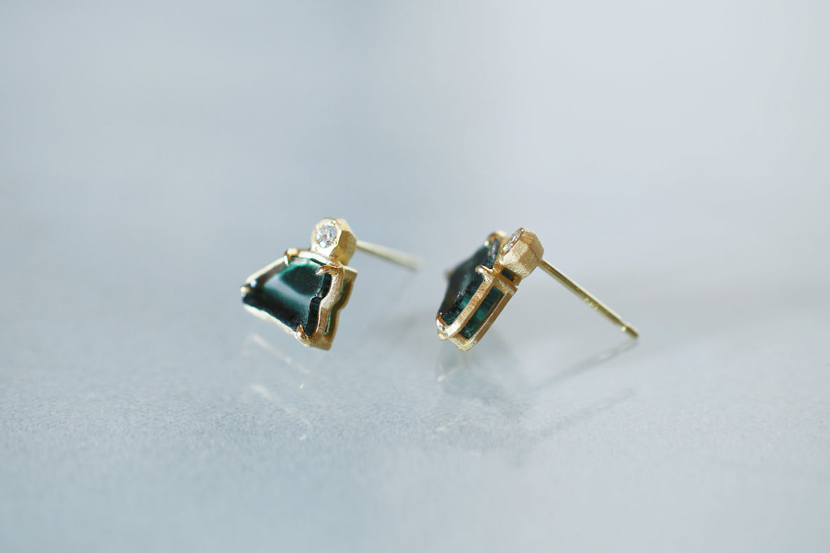希少性の高いバイカラートルマリンで仕立てた1点もののピアス。10月の誕生石でもあるトルマリンは、和名では「電気石」と言われる通り、熱を加えたり摩擦をかけられると帯電する性質があり、宝石以外にも古く神聖な儀式や治療などに用いられてきたとされている神秘的な宝石です。また、別称 "カメレオンジェム" とも呼ばれるほど、豊富なカラーバリエーションを誇ります。透明に澄んだ層に、はっきりとした境界線で浮かび上がった奥行きのあるグリーンが印象的で、二色の結晶がまるで小さな山のようなフォルムで一体化したユニークな表情が美しい個性を宿します。石の有機的なフォルム合わせたK18ゴールドの石座は光を取り込めるように側面に透かしを入れ、全体のデザインを繊細に引き締めるように留めたメレダイヤモンドがさりげないアクセントとなり、耳元で繊細に煌めきます。ささやかなサイズながらもしっかりと存在感を放ち、装いにひと匙の個性が光る特別なアイテム。10月の誕生石としても親しまれているトルマリンは、10月生まれの方の特別なお守りとしてもお勧めです。