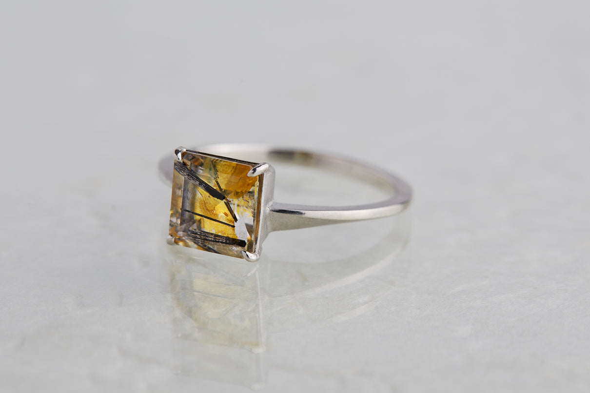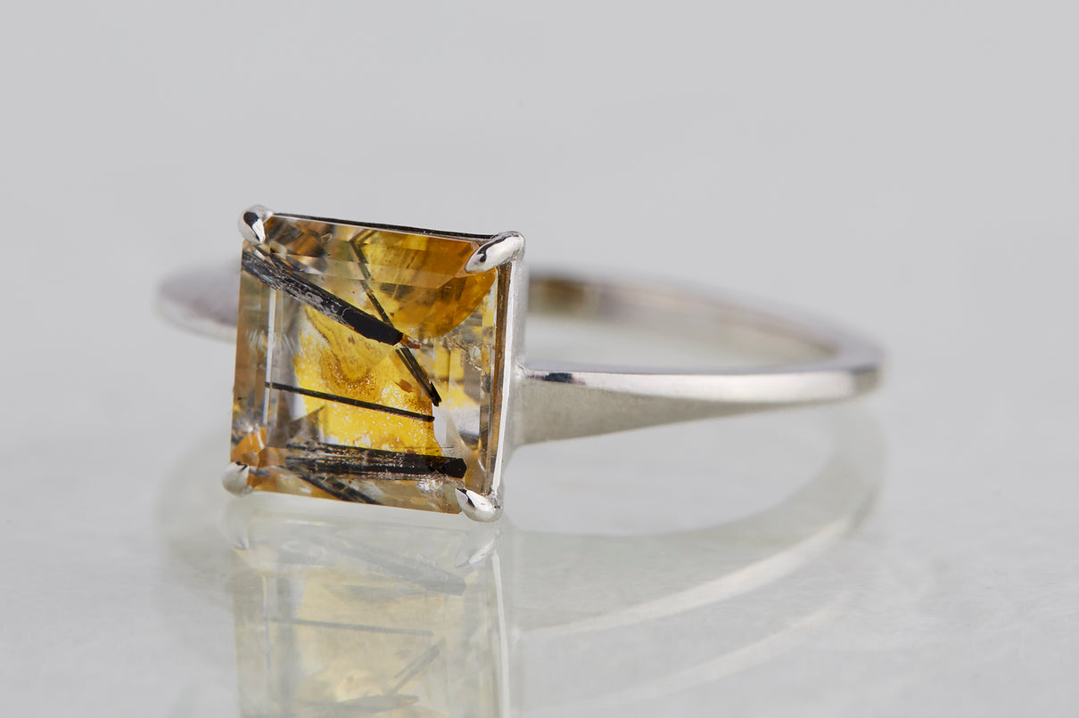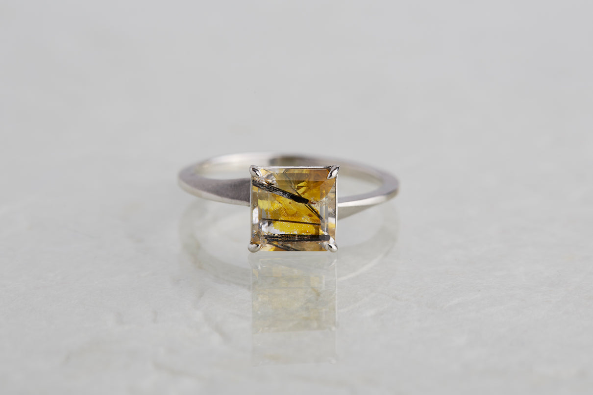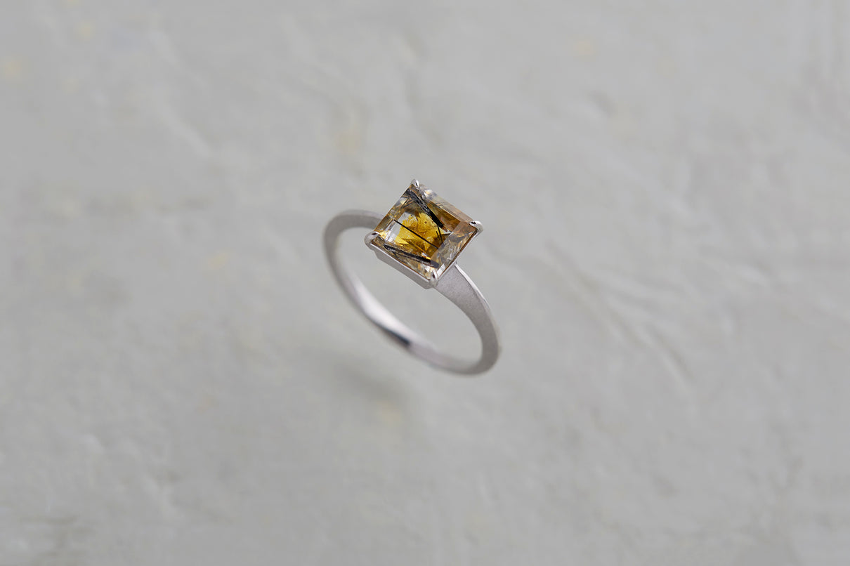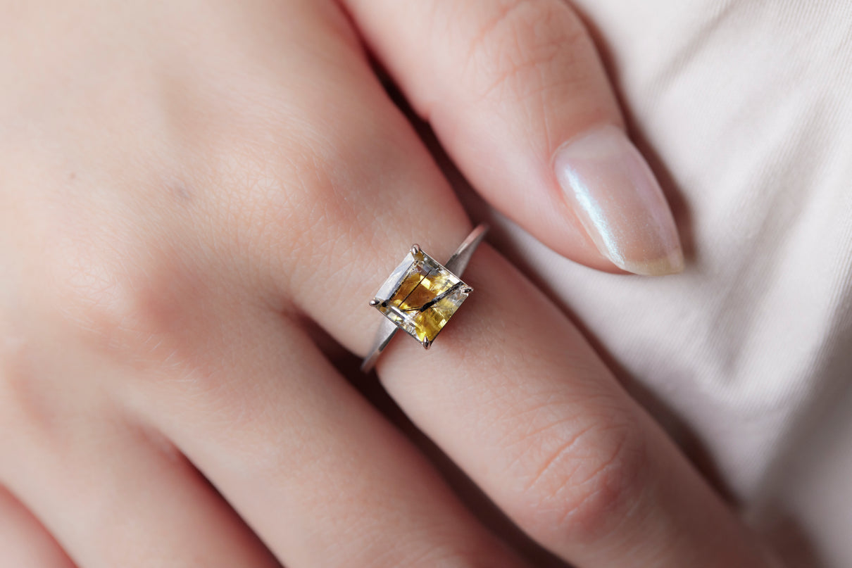 トルマリンとライモナイトを内包したインクルージョンクォーツで仕立てた一点もののリング。黒い針状のトルマリンの奥で、鮮やかな黄色のライモナイトが膜を広げるように入り込んだユニークな表情のクォーツは、透明度が高くそれぞれの存在感をより引き立たせています。アシンメトリーなバランスに仕立てたプラチナのリング部分は、主役の石を引き立てるように正面に一筋の光沢線を入れ仕上げました。シンプルながら、他に類を見ない表情を持つライモナイトの鮮やかな黄色が目を引き、装いの主役となるアイテム。10月の誕生石としても親しまれているトルマリンは、10月生まれの方の特別なお守りとしてもお勧めです。