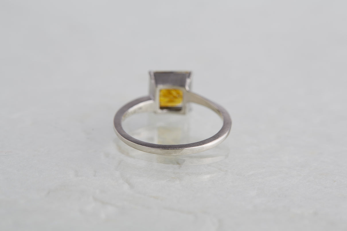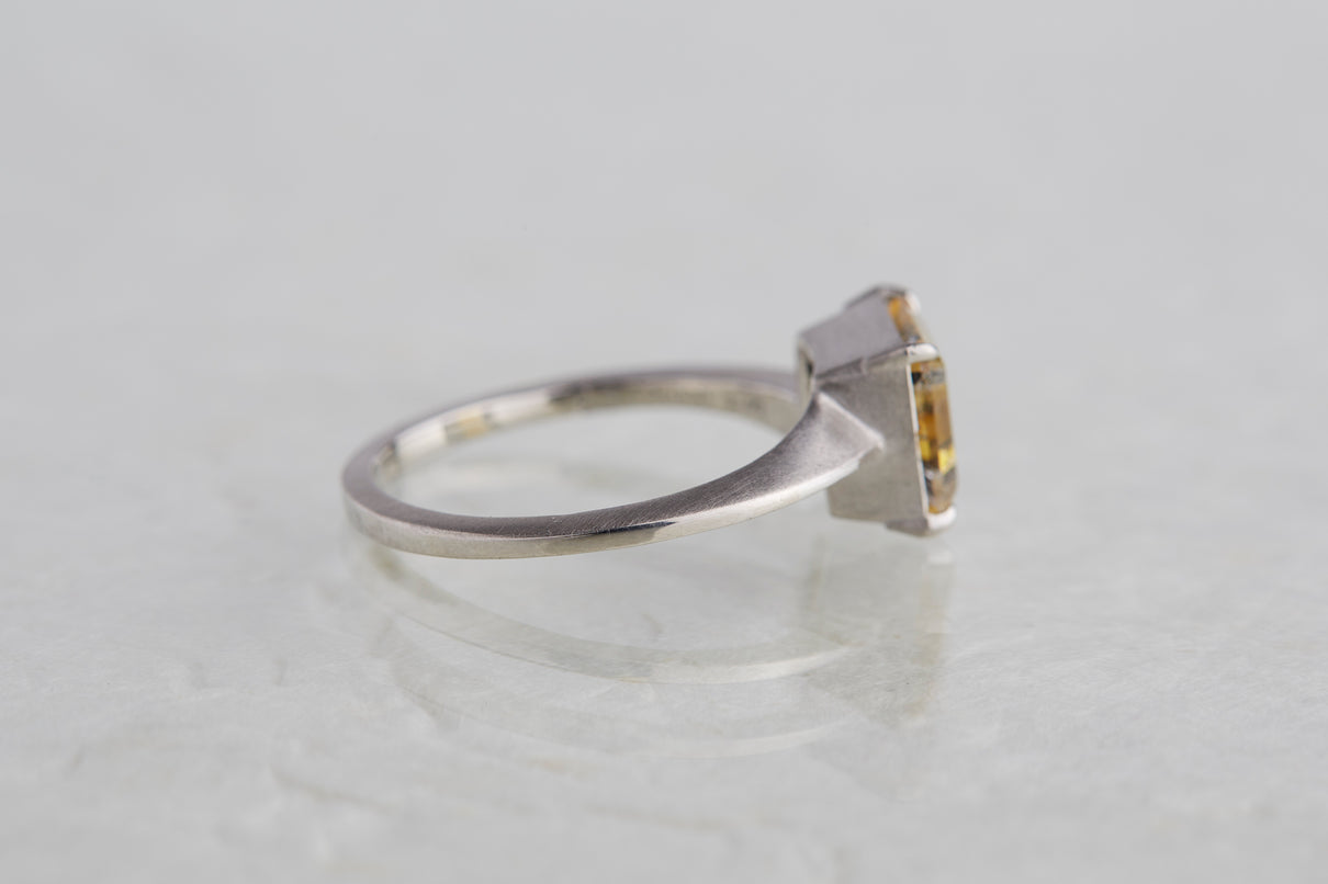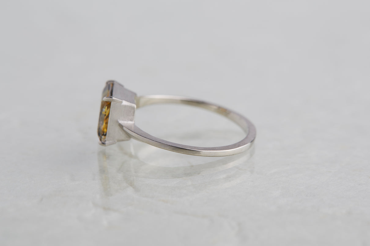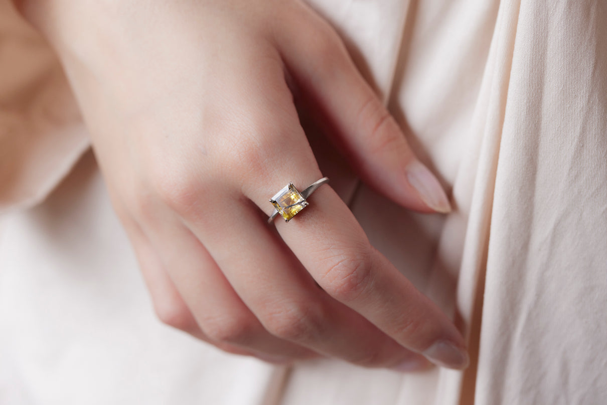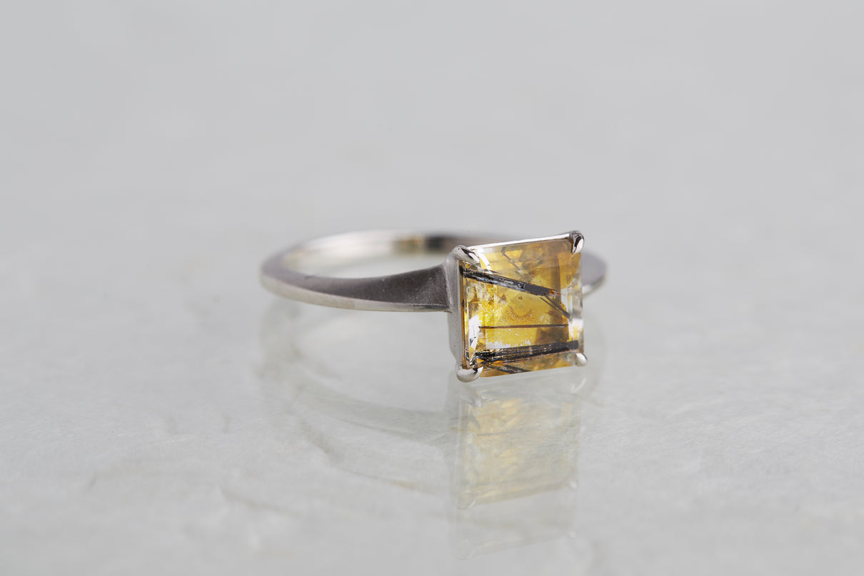 トルマリンとライモナイトを内包したインクルージョンクォーツで仕立てた一点もののリング。黒い針状のトルマリンの奥で、鮮やかな黄色のライモナイトが膜を広げるように入り込んだユニークな表情のクォーツは、透明度が高くそれぞれの存在感をより引き立たせています。アシンメトリーなバランスに仕立てたプラチナのリング部分は、主役の石を引き立てるように正面に一筋の光沢線を入れ仕上げました。シンプルながら、他に類を見ない表情を持つライモナイトの鮮やかな黄色が目を引き、装いの主役となるアイテム。10月の誕生石としても親しまれているトルマリンは、10月生まれの方の特別なお守りとしてもお勧めです。