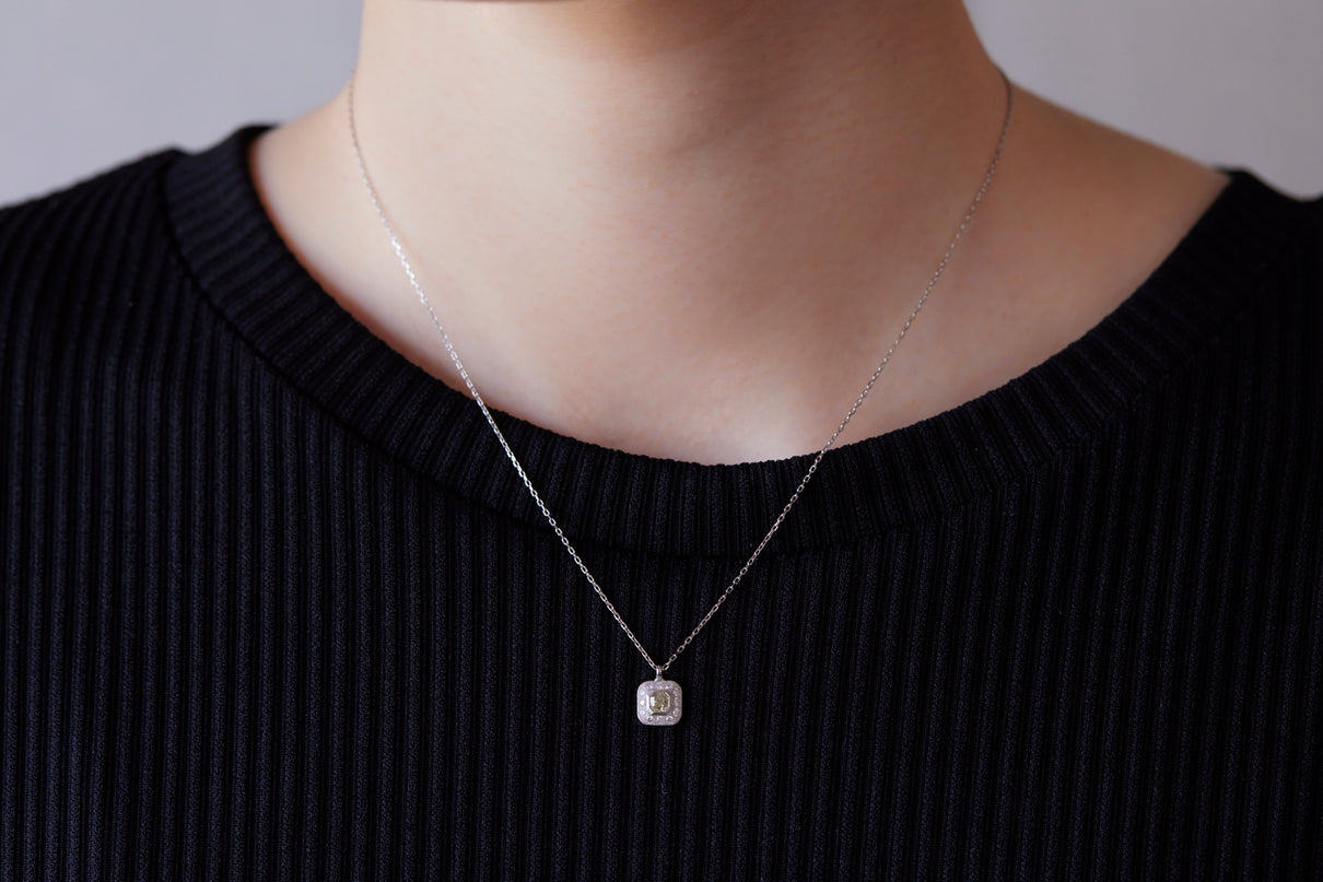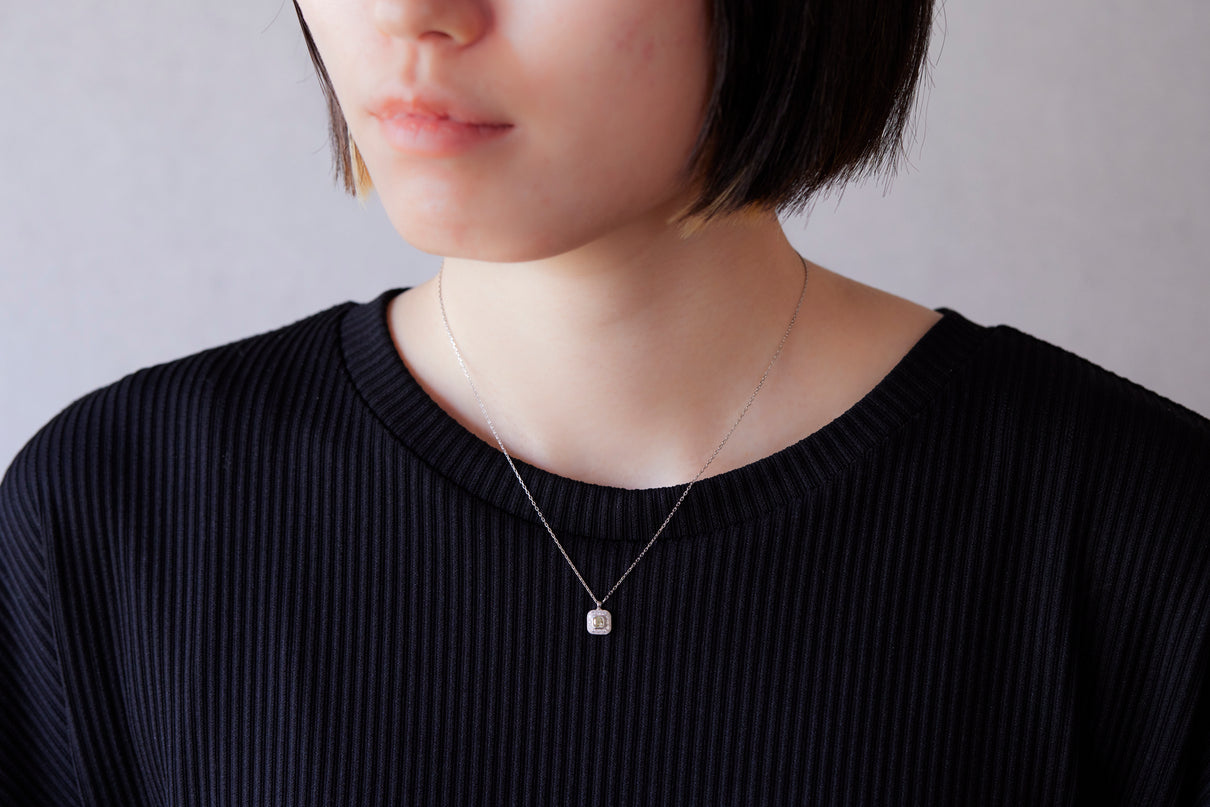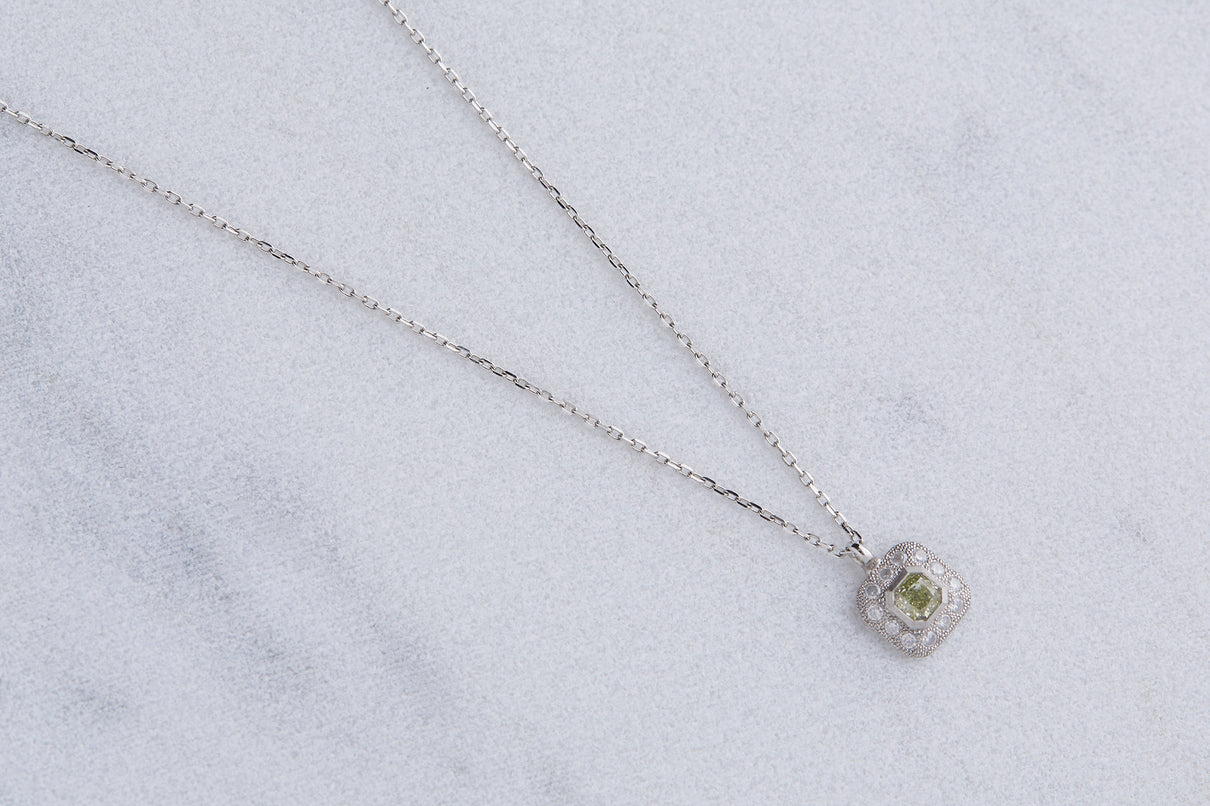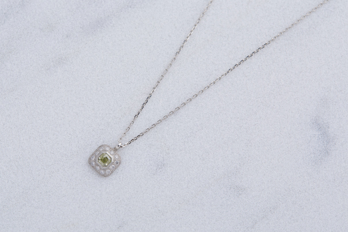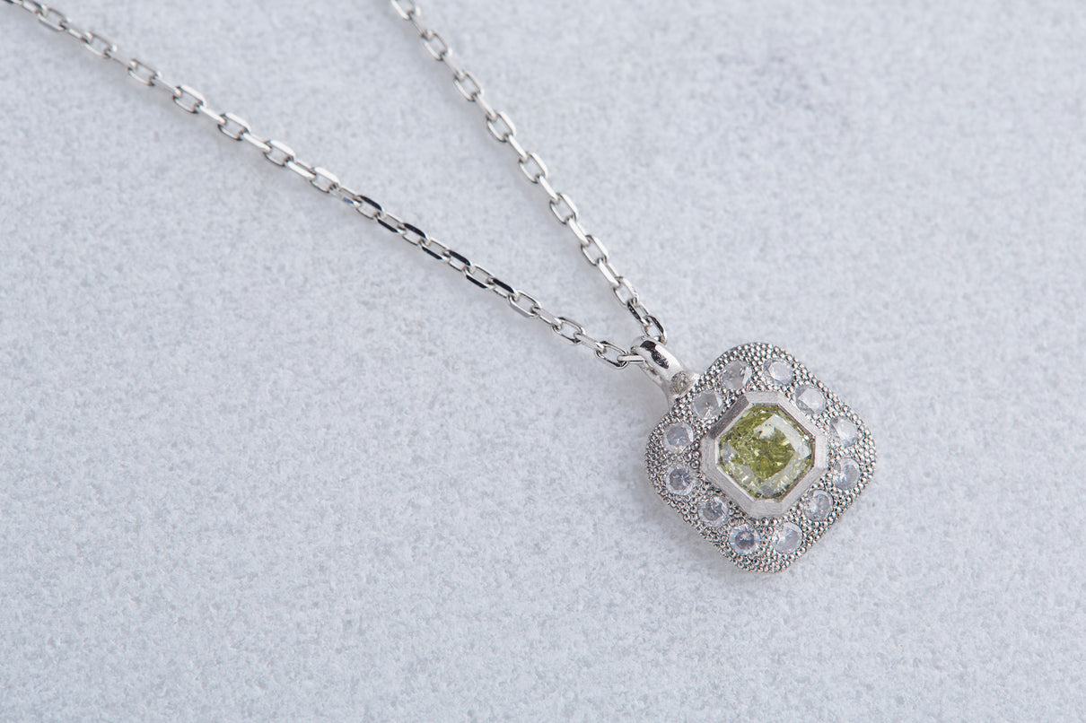 クッションカットのダイヤモンドを、アイスカラーのメレダイヤモンドと細かな手仕によるミル打ちで縁取った、クラシカルな印象のプラチナネックレス。センターダイヤモンドはほんのりと色づく爽やかなミントグリーンのカラーダイヤモンドで、取り巻くアイスカラーダイヤモンドとのシックなカラーの組み合わせが、一点ものならではの他にない個性と存在感を放ちます。小ぶりで華奢な印象のサイズ感のため、日常的に身につけて頂きやすいネックレスです。