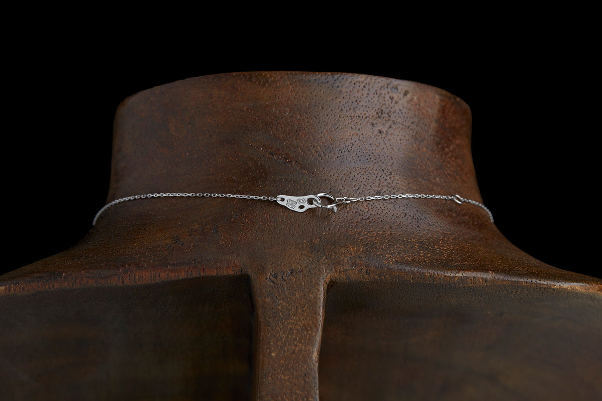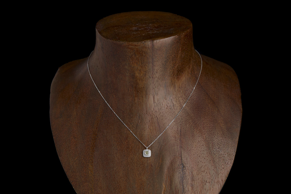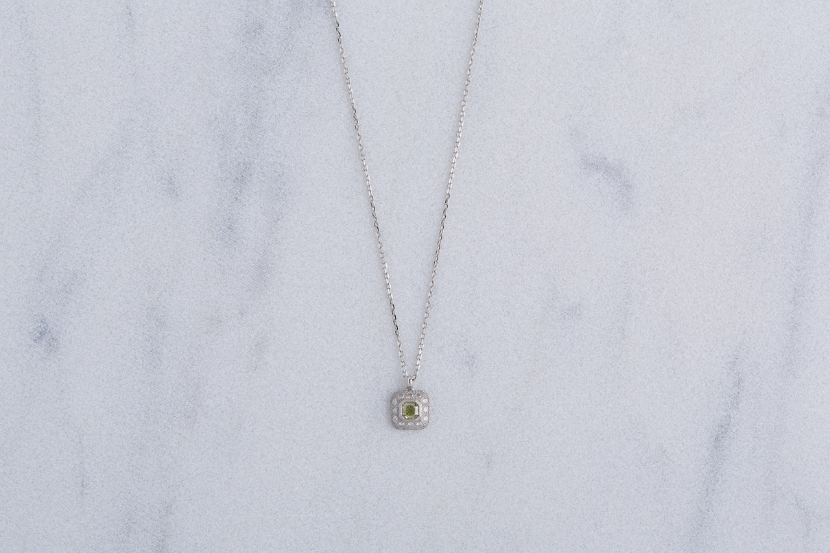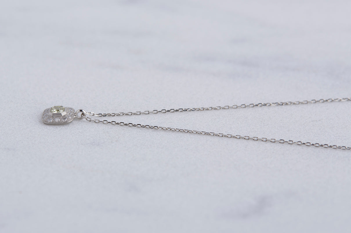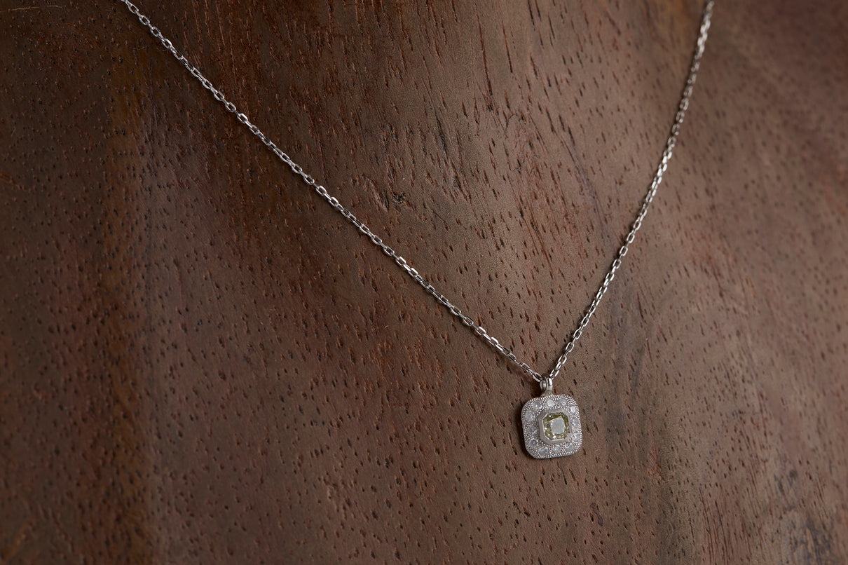 クッションカットのダイヤモンドを、アイスカラーのメレダイヤモンドと細かな手仕によるミル打ちで縁取った、クラシカルな印象のプラチナネックレス。センターダイヤモンドはほんのりと色づく爽やかなミントグリーンのカラーダイヤモンドで、取り巻くアイスカラーダイヤモンドとのシックなカラーの組み合わせが、一点ものならではの他にない個性と存在感を放ちます。小ぶりで華奢な印象のサイズ感のため、日常的に身につけて頂きやすいネックレスです。