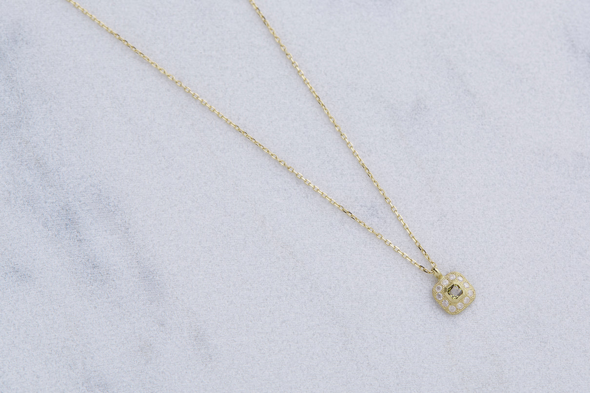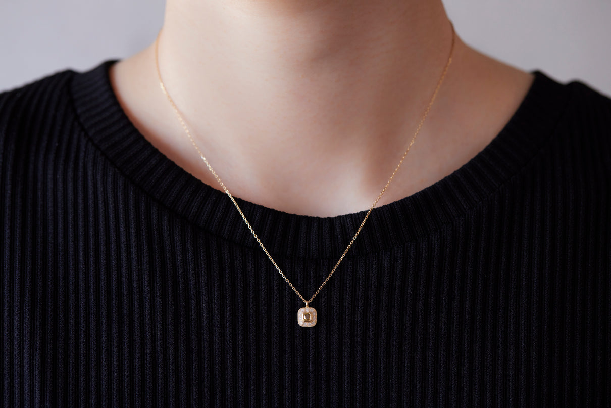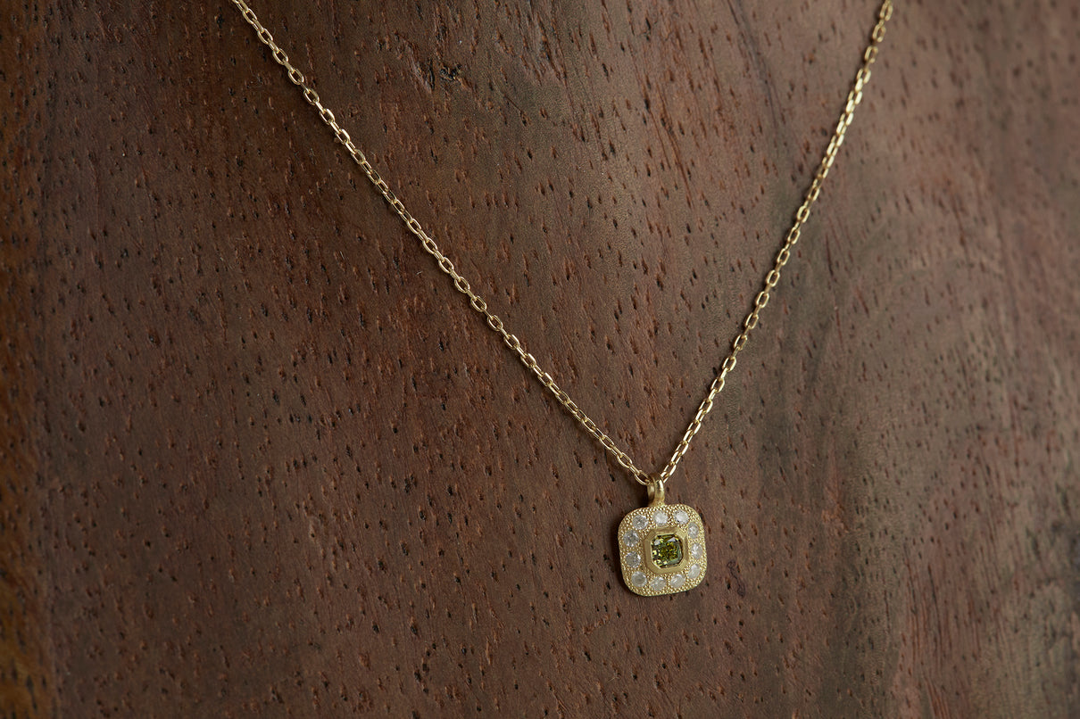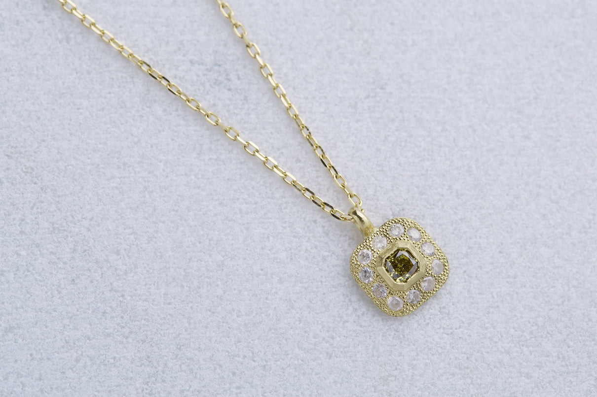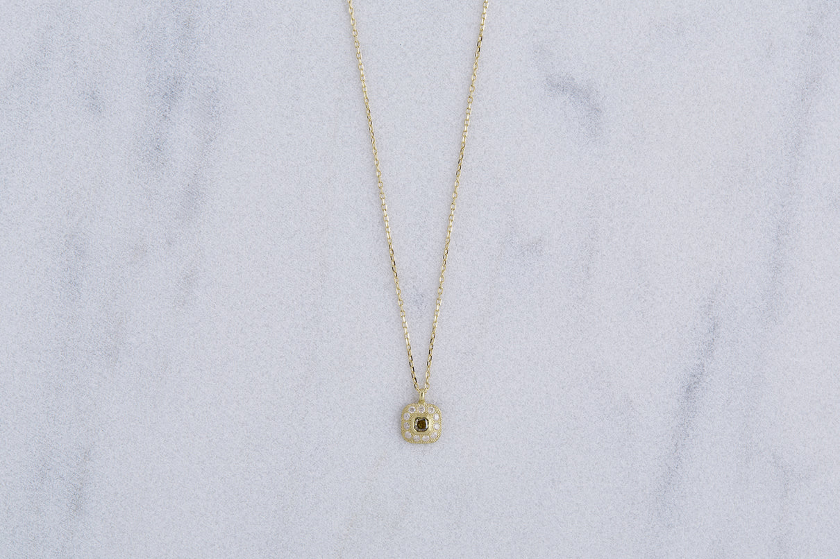 クッションカットのダイヤモンドを、アイスカラーのメレダイヤモンドと細かな手仕によるミル打ちで縁取った、クラシカルな印象のプラチナネックレス。センターダイヤモンドは深みのあるオリーブカラーのダイヤモンドで、取り巻くアイスカラーダイヤモンドとのシックなカラーの組み合わせが、一点ものならではの他にない個性と存在感を放ちます。小ぶりで華奢な印象のサイズ感のため、日常的に身につけて頂きやすいネックレスです。